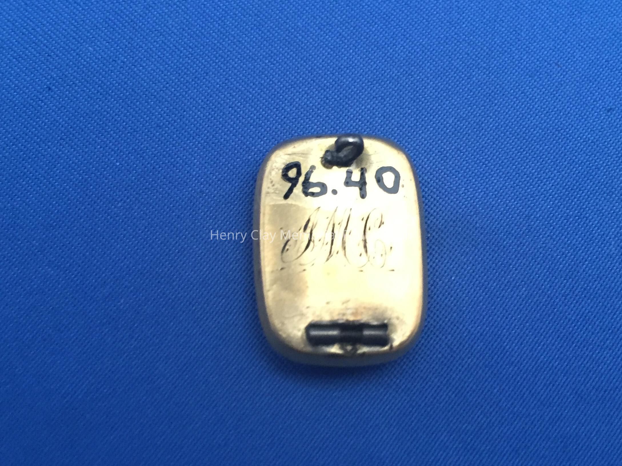 Small rectangular pin with lock of brown hair in center surrounded by a ring of gold and a ring of onyx or jet. Inscribed on back are initials "JMC."Dimensions