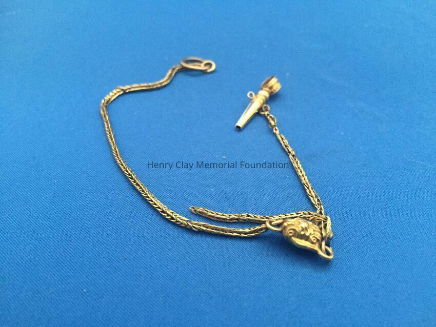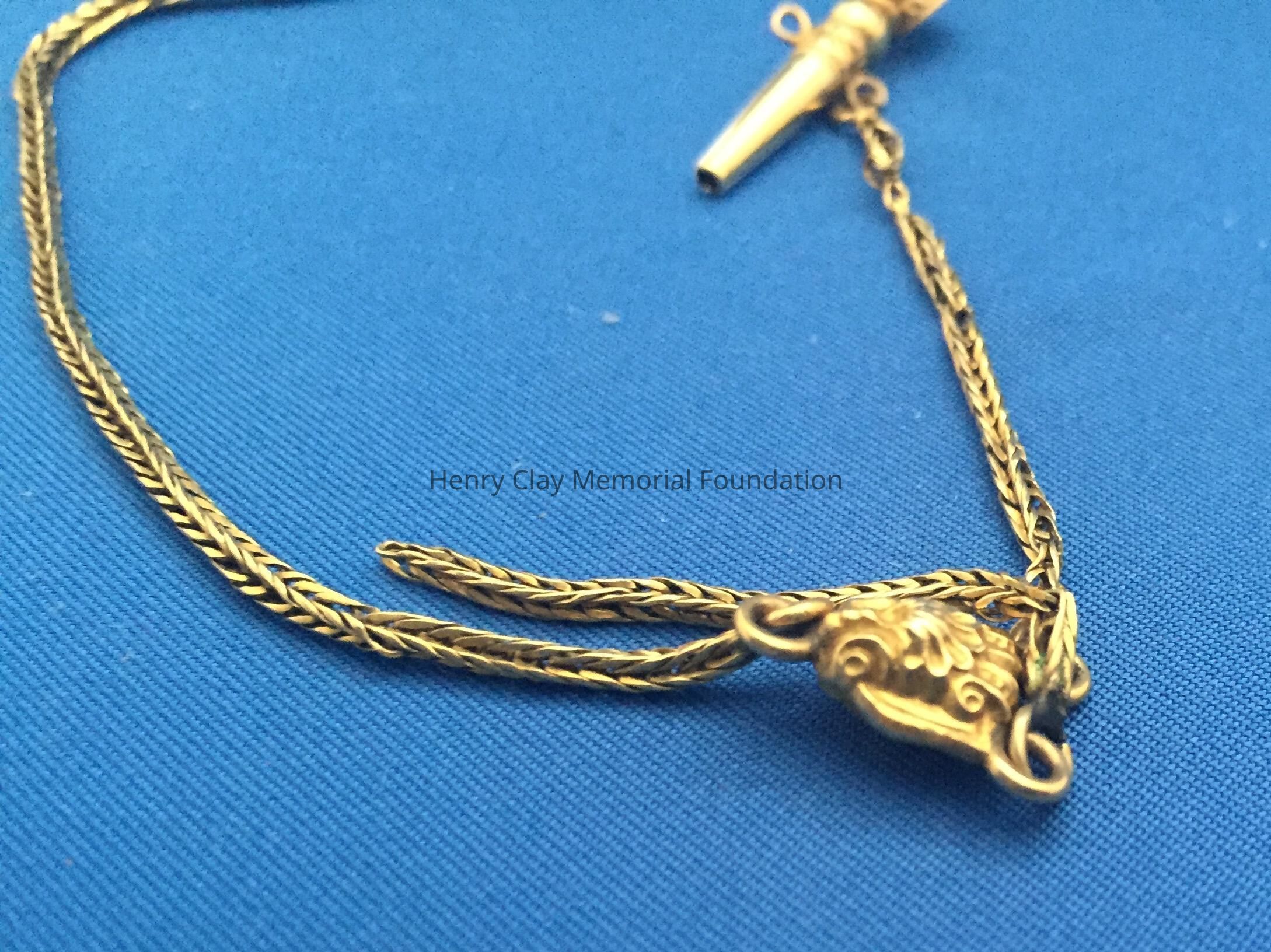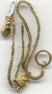 Gold chain, split at one end into two chains. One of the split chains holds a small winding key.