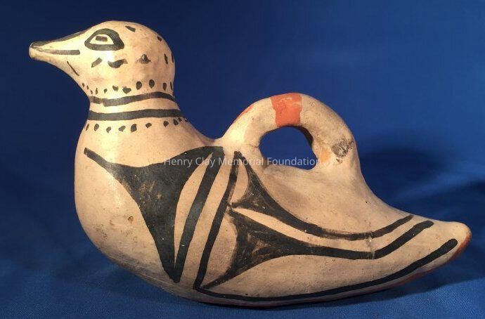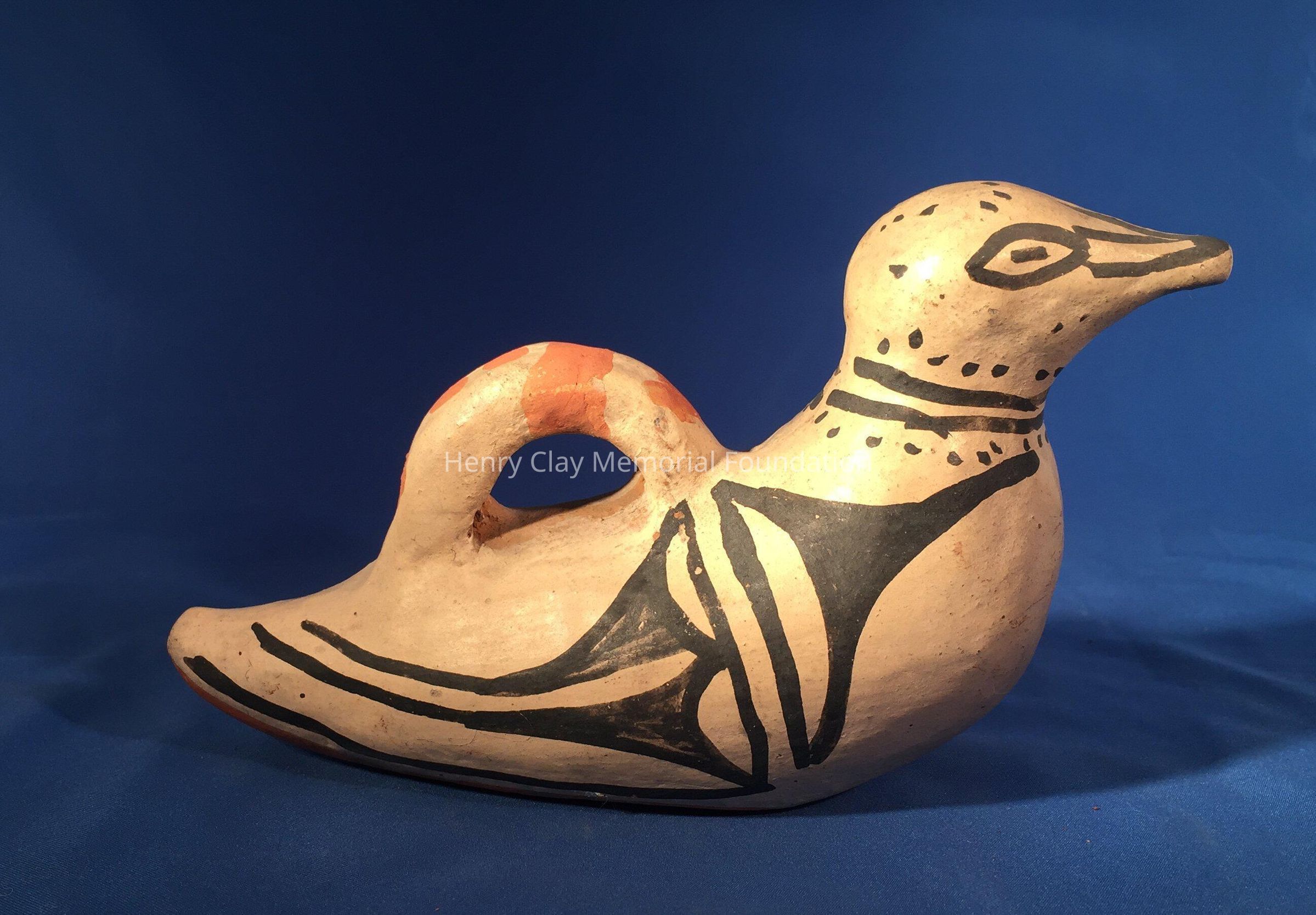 Clay pottery bird figure with handle. The bird is painted white with black designs. The bottom is unpainted and has a hole in it.