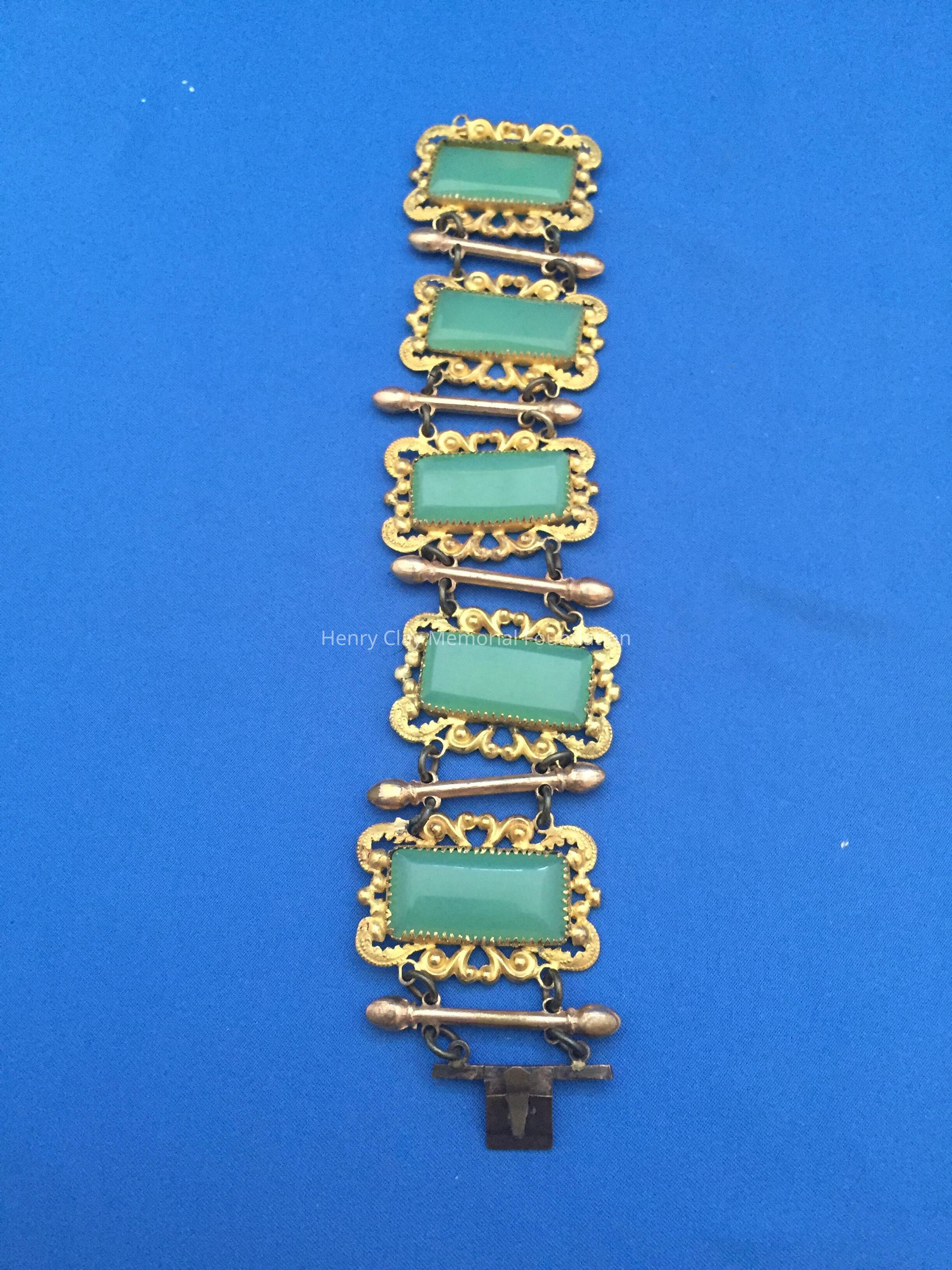 Set includes five pieces: A & B) Pair of earrings; C & D) Two matching bracelets; E) Choker[?]. All jewelry is a light, mint green stone set in a gold metal. Earring consists of two pieces--a long decorative, rectangular piece hanging from a matching round piece. The bracelets are wide, rectangular gold and mint green stone segments linked together. The choker [?] is a long strand of heavy gold material with gold and stone pieces sewn onto it.Dimensions