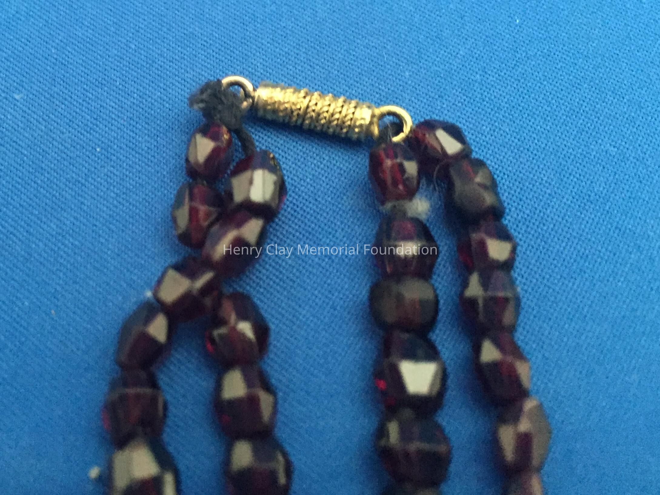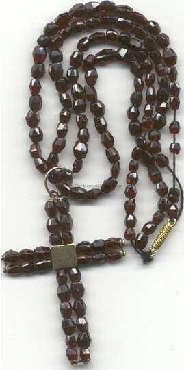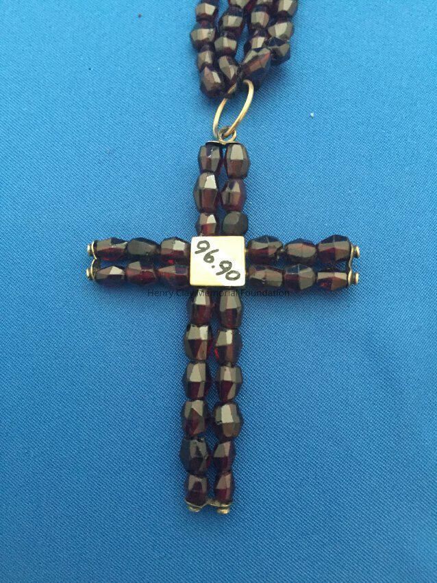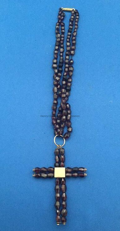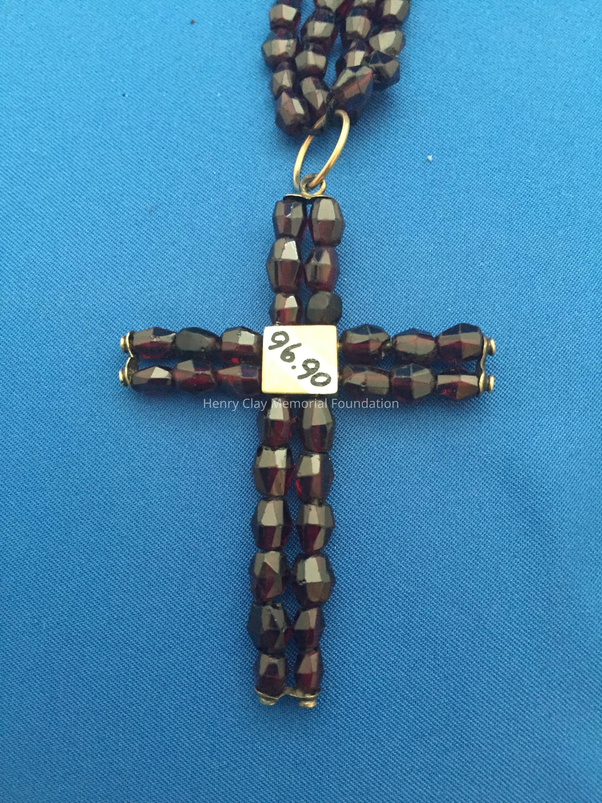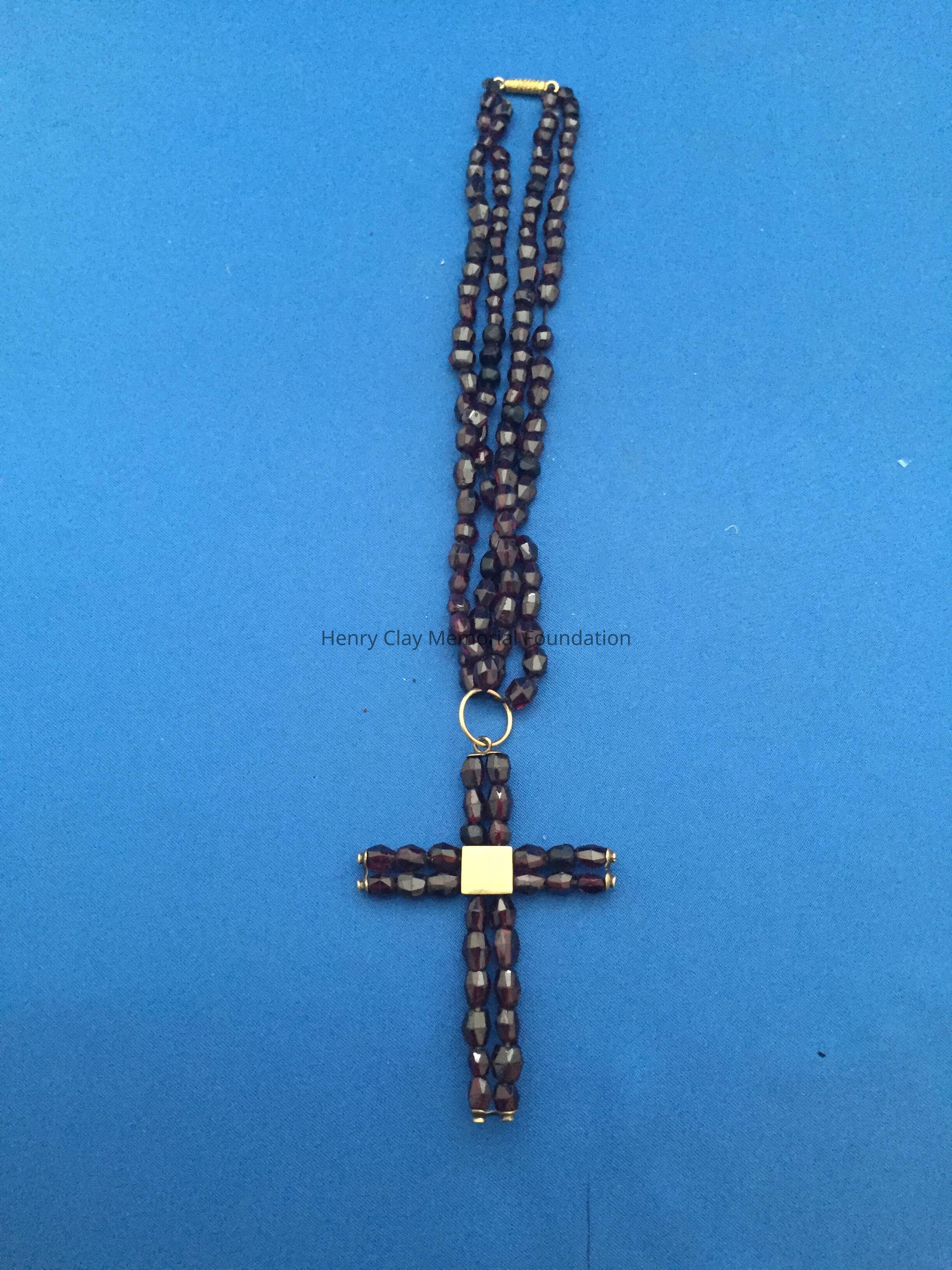 Crucifix comprised of double rows of purple glass beads with a gold box at the center of the cross hanging from a double strand necklace strung with the same type of purple glass beads. Gold clasp.Dimensions
