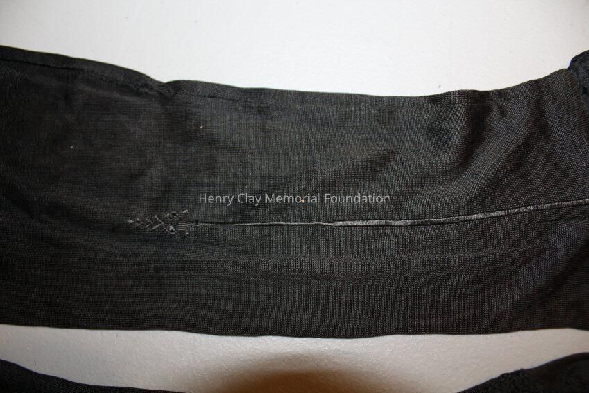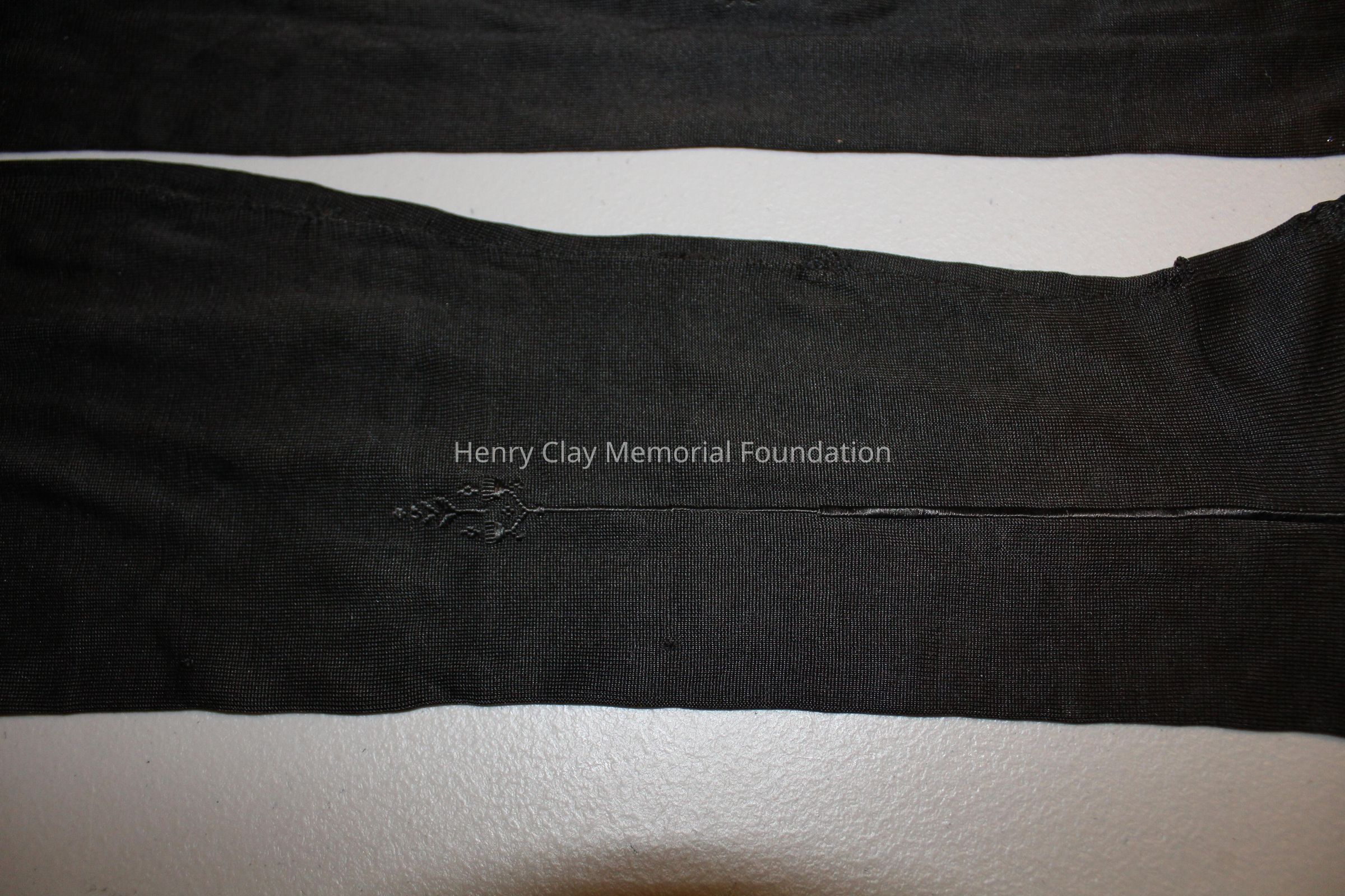 Black silk thigh high stockings. Side seam with dart/arrow clock. Seam at the toe and band at top.
