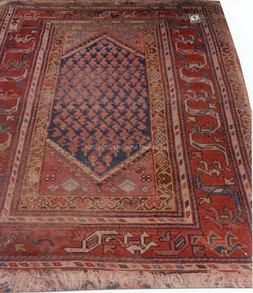 Small rug made in Kurdish, Iran. Prominent colors in shades of red with buff, blue and greens. Borders frame the center which forms a parellelogram. This center piece is dark blue with reddish-pink designs. It has floral and geometric design to alternate with the borders.
