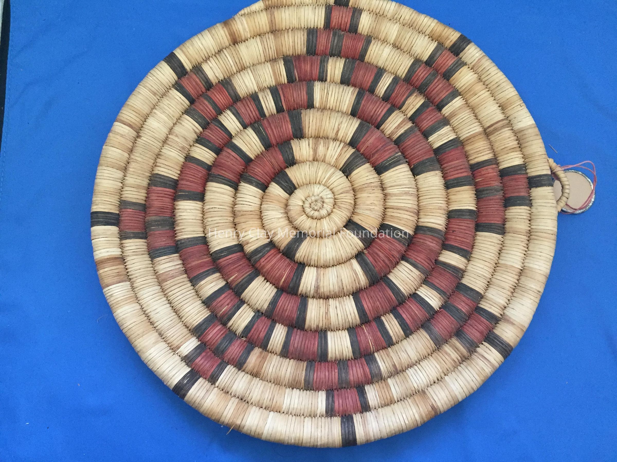 Flat coiled disk made from woven fibers of plant life. Tan in color with brown and maroon segments. There is a small woven handle on the outside and a small paper label hanging from it marked "2.50."Dimensions