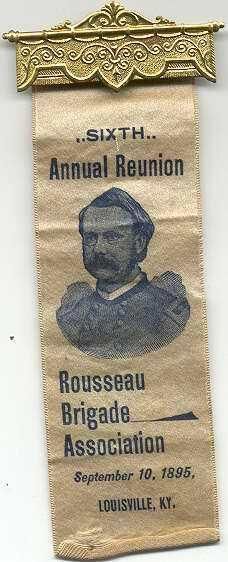 Dirty white silk ribbon hanging from gold badge pin. In blue print - "Sixth../ Annual Reunion / Rousseau / Brigade / Association / September 10, 1895. / Louisville, Ky." Image of man or soldier in blue.Dimensions