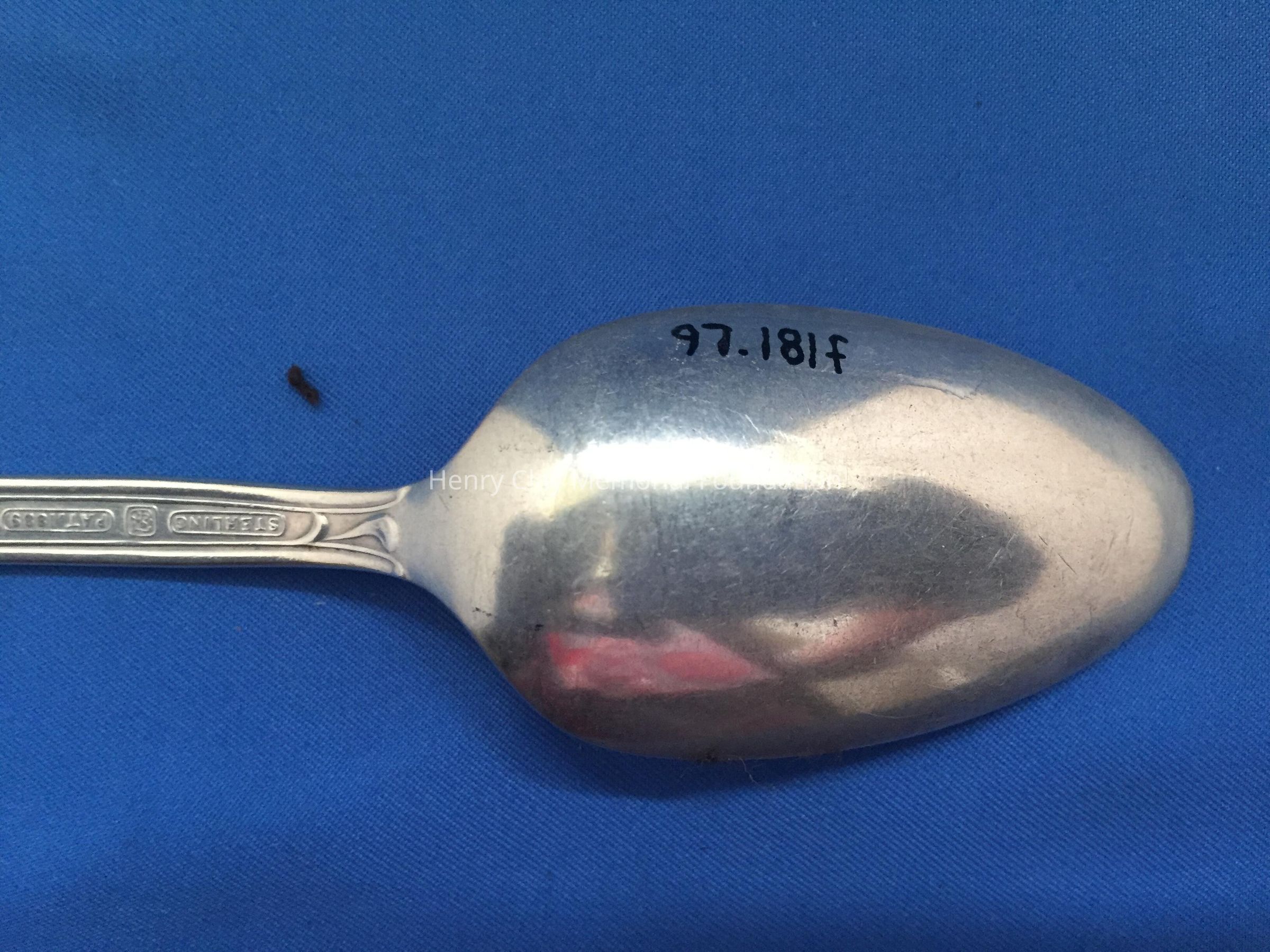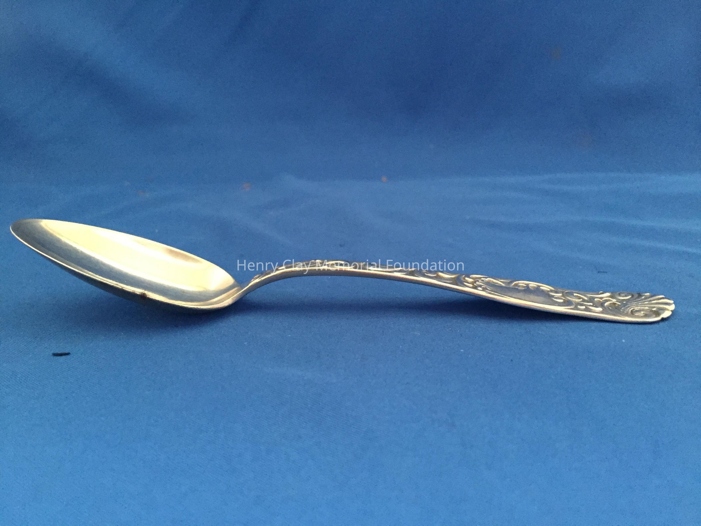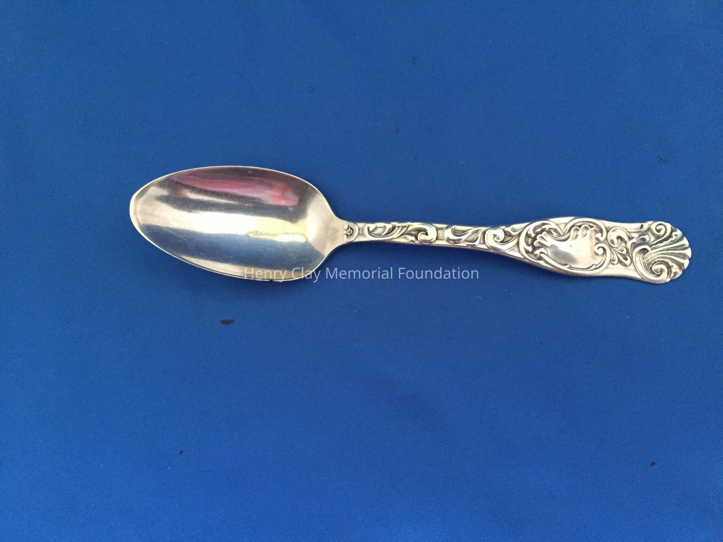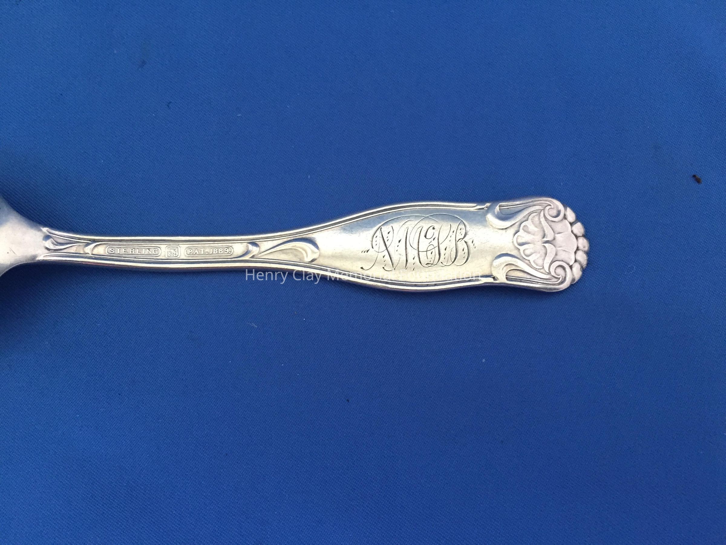 Set of six sterling spoons with a shell pattern at the top and design on the handle. The back handle has an engraved monogram, "NMcDB" and a cartouche with "Sterling", a maker's mark and "PAT. 1889". The mark is a lion inside a "T."Dimensions