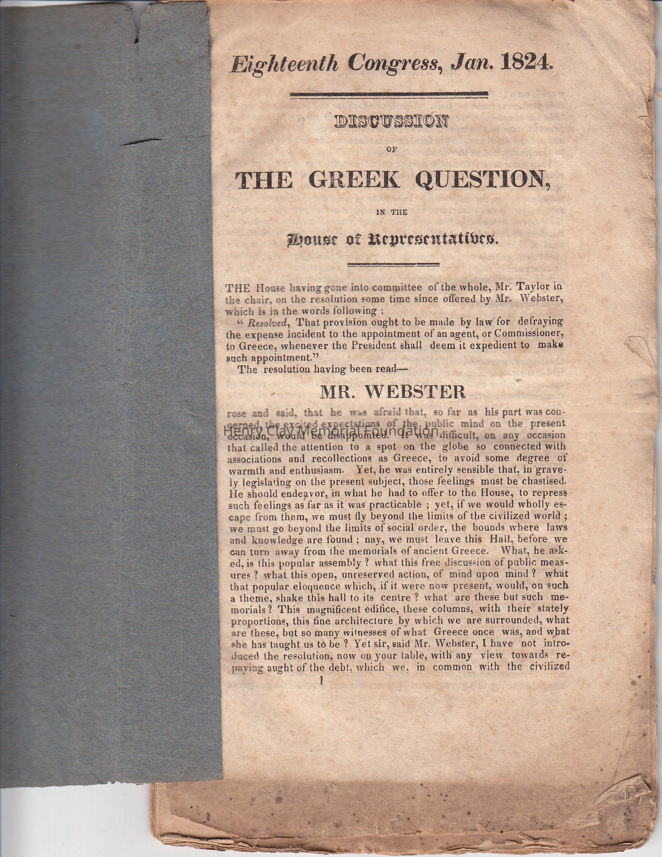 This booklet contains a printed record of remarks made in the US House of Representative in January 1824 regarding sending a US diplomat to Greece in order to support its efforts to attain independence. It includes remarks from a number of statesmen including Henry Clay, Daniel Webster, and John Randolph.