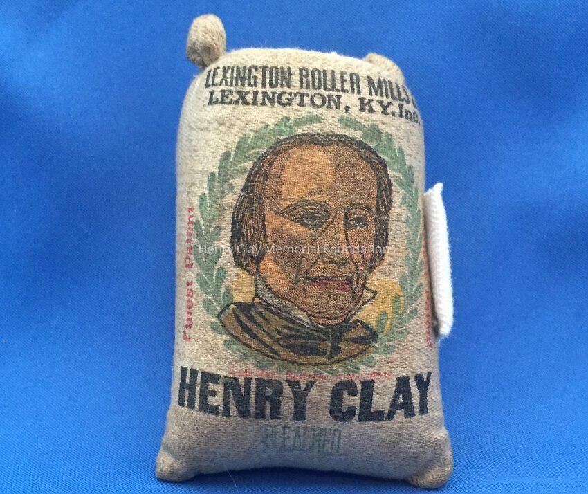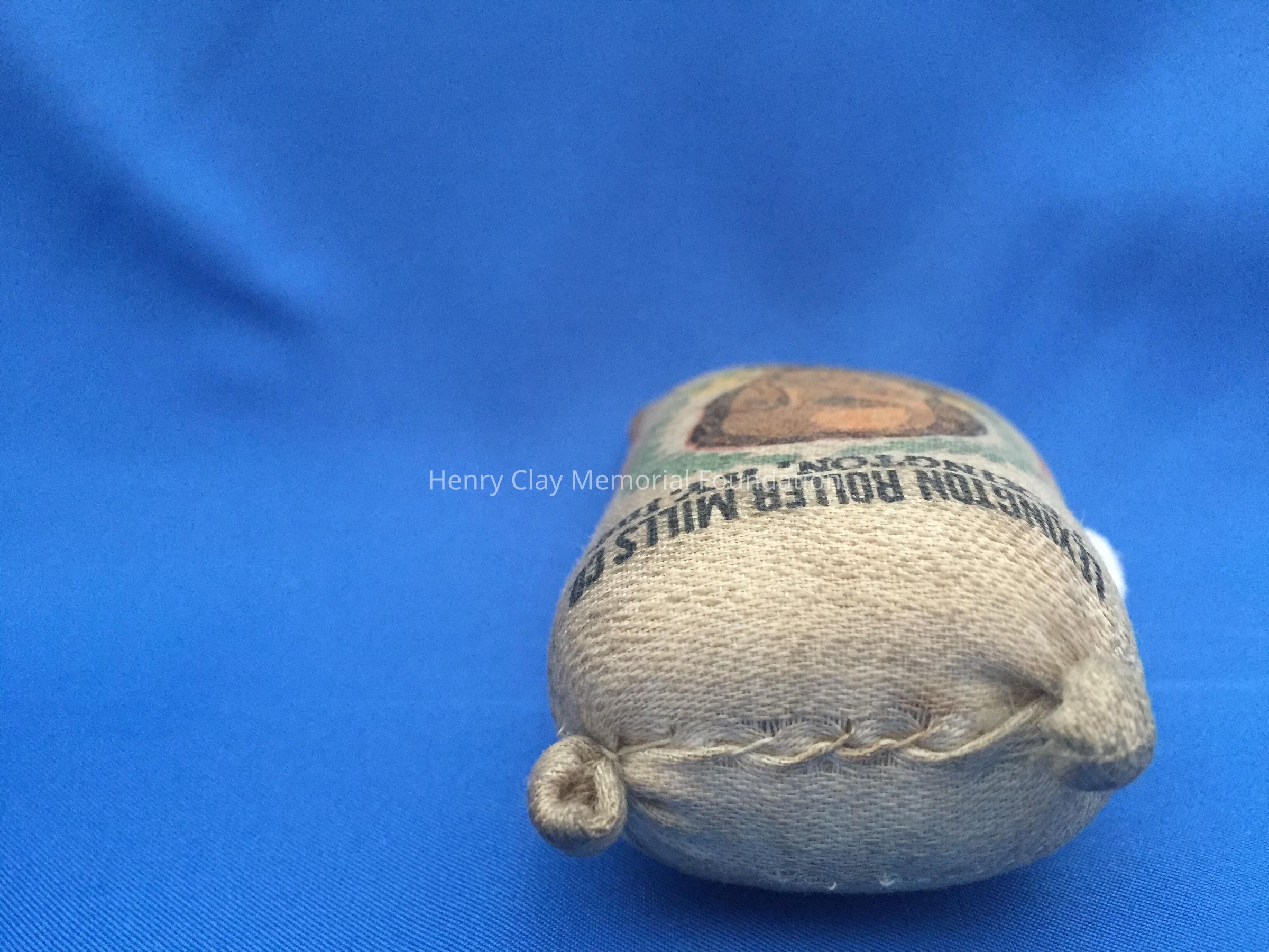 Miniature white flour bag with corners tied and stuffed. Image of Henry Clay enclosed in wreath. Lettering on bag in black, red and green colors, "Lexington Roller Mills Co. / Lexington, Ky. Inc. / Henry Clay / Bleached / Finest Patent [printed vertically on sides]." There is a fine line of red lettering just beneath image of Clay, but it is too small to read.Dimensions