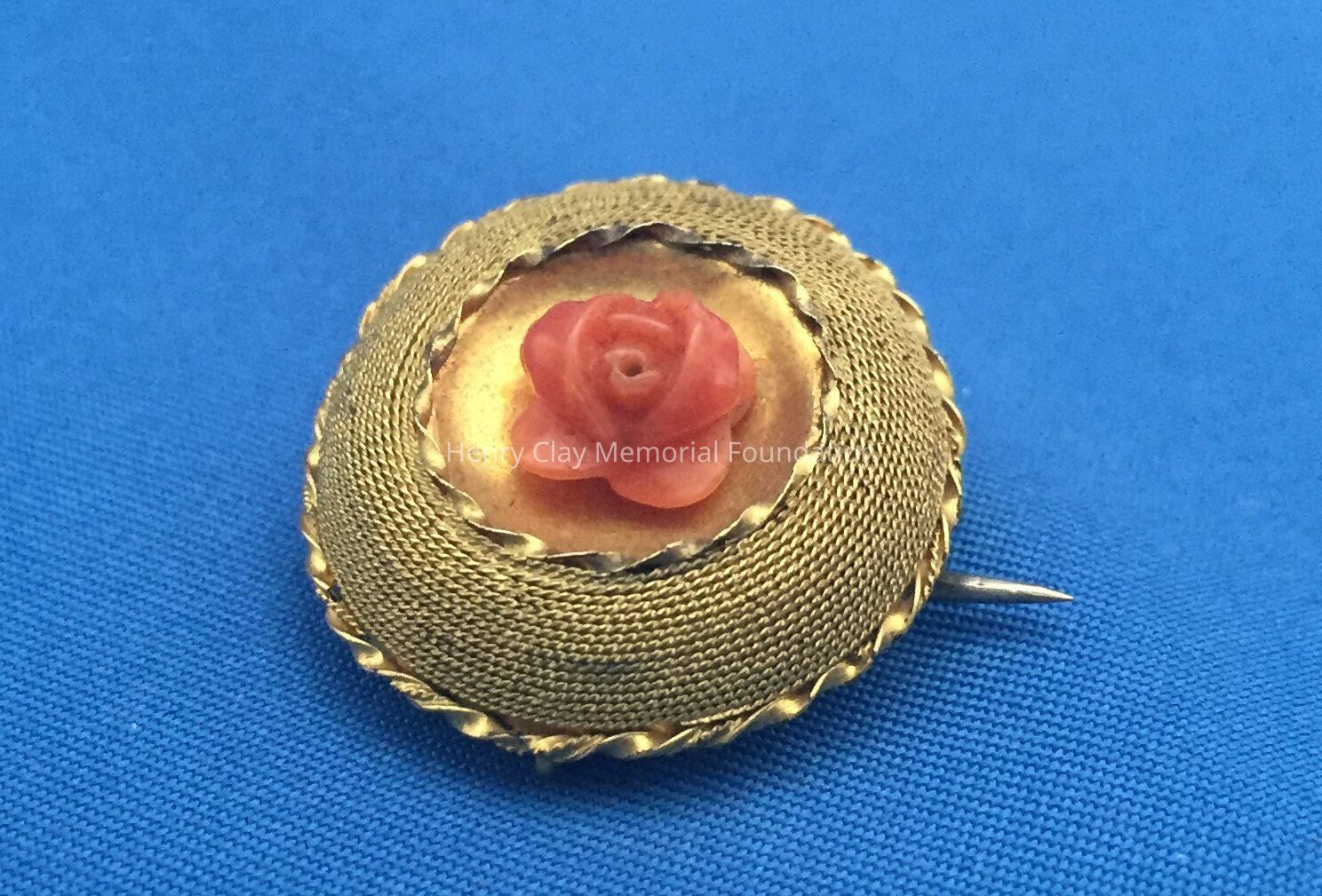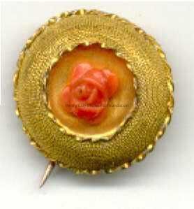 Coral flower set in round gold pin.