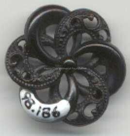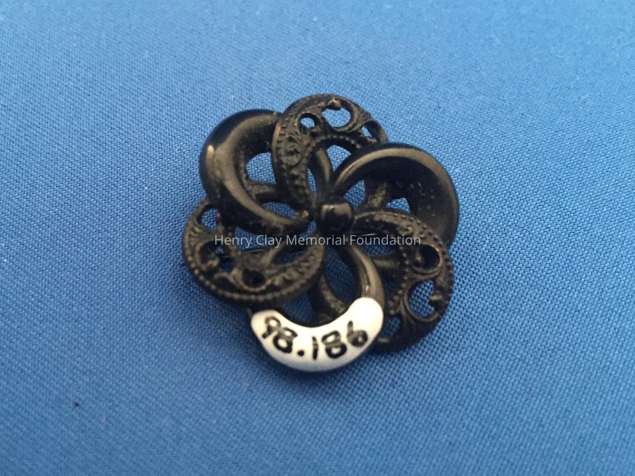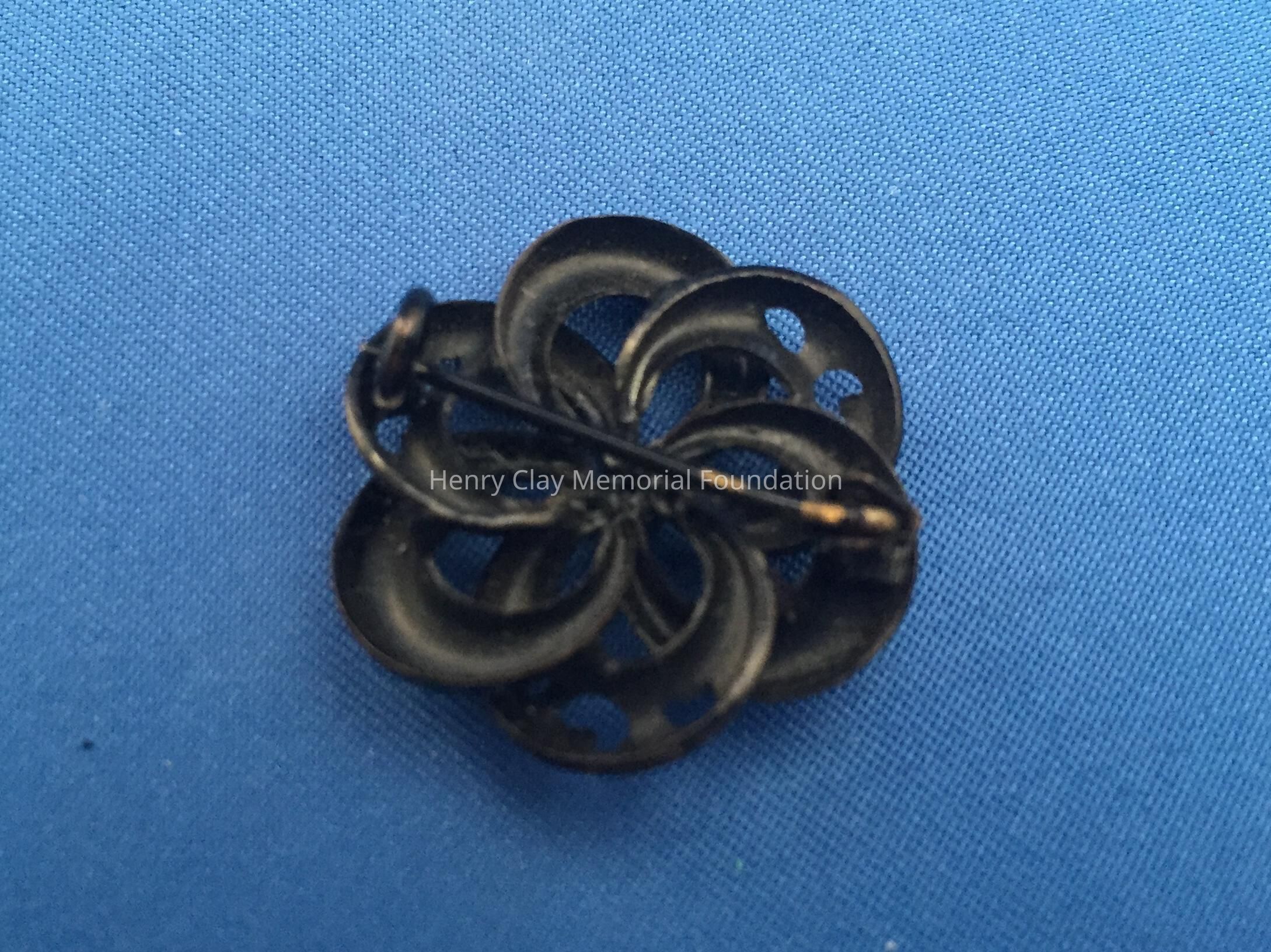 Black metal in the shape of a flower. Alternating petals are solid and holed. Crude clasp pin.