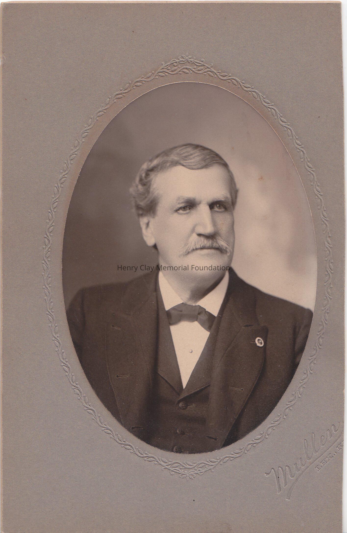 A black and white photograph of a man inside a cardboard paper with an oval floral wreath around the oval picture.