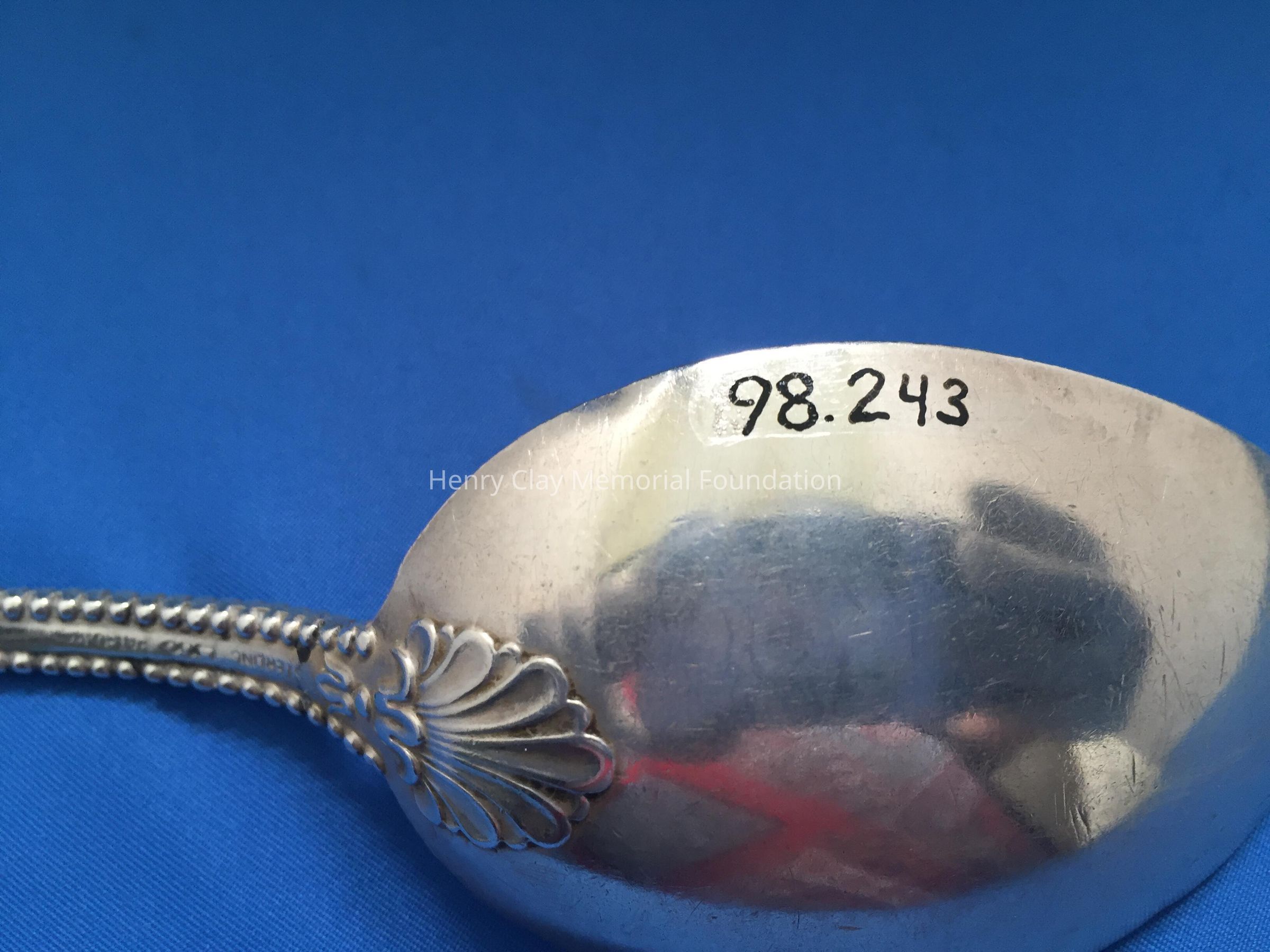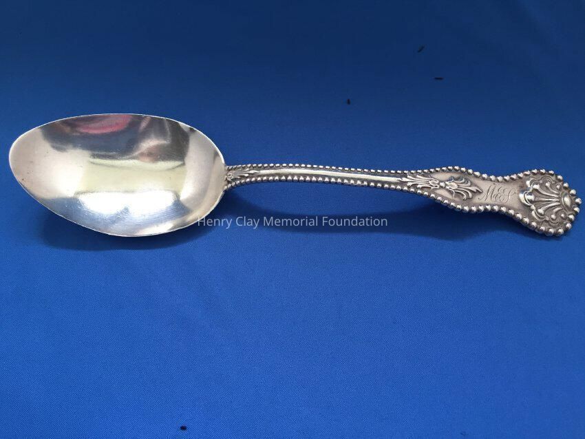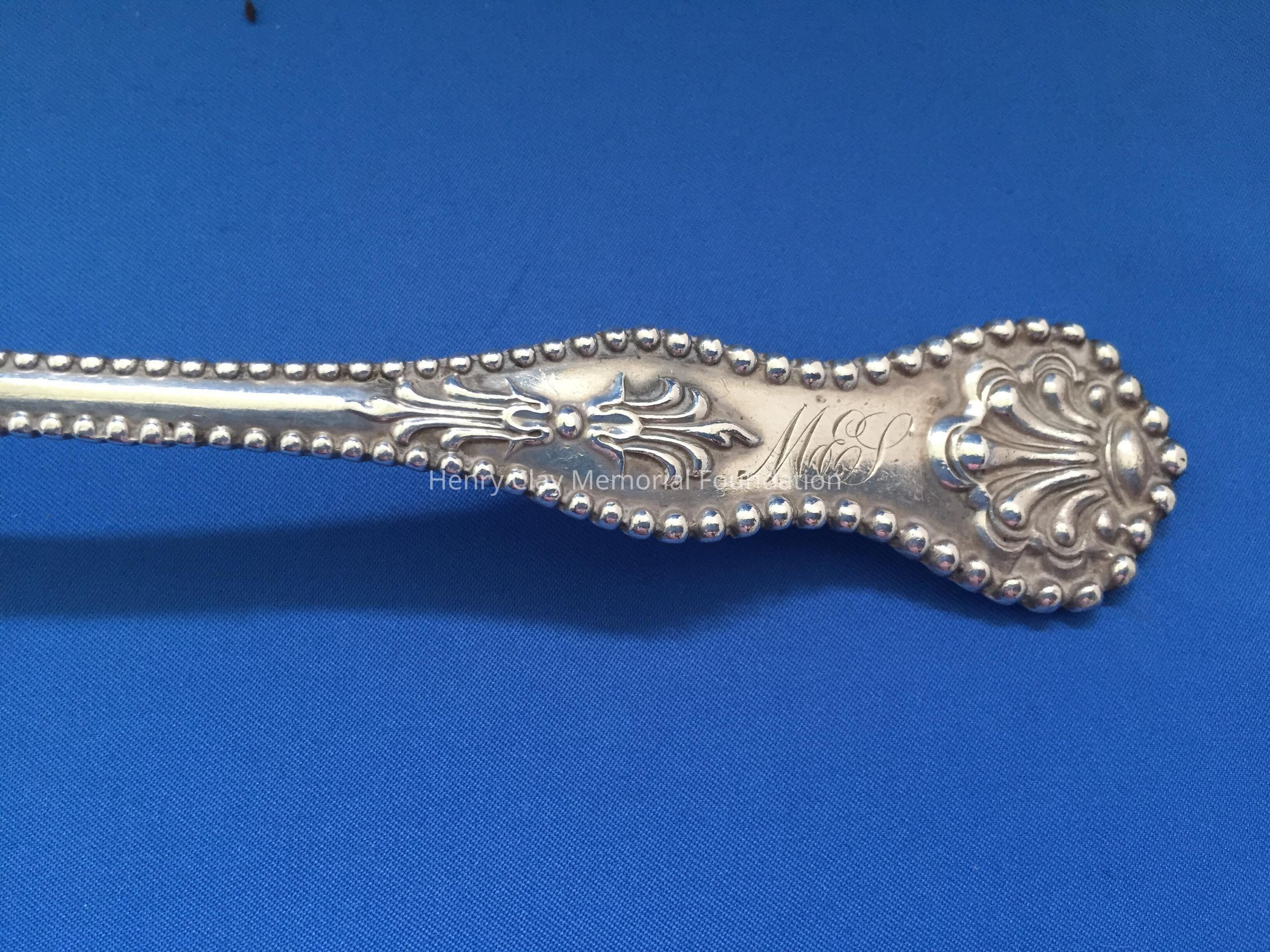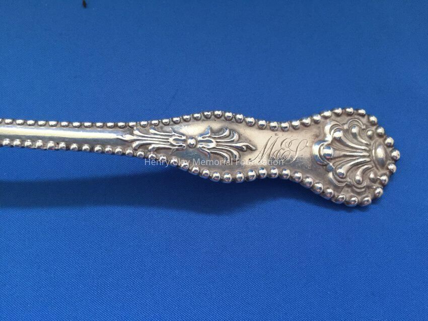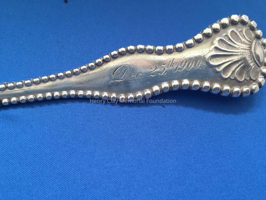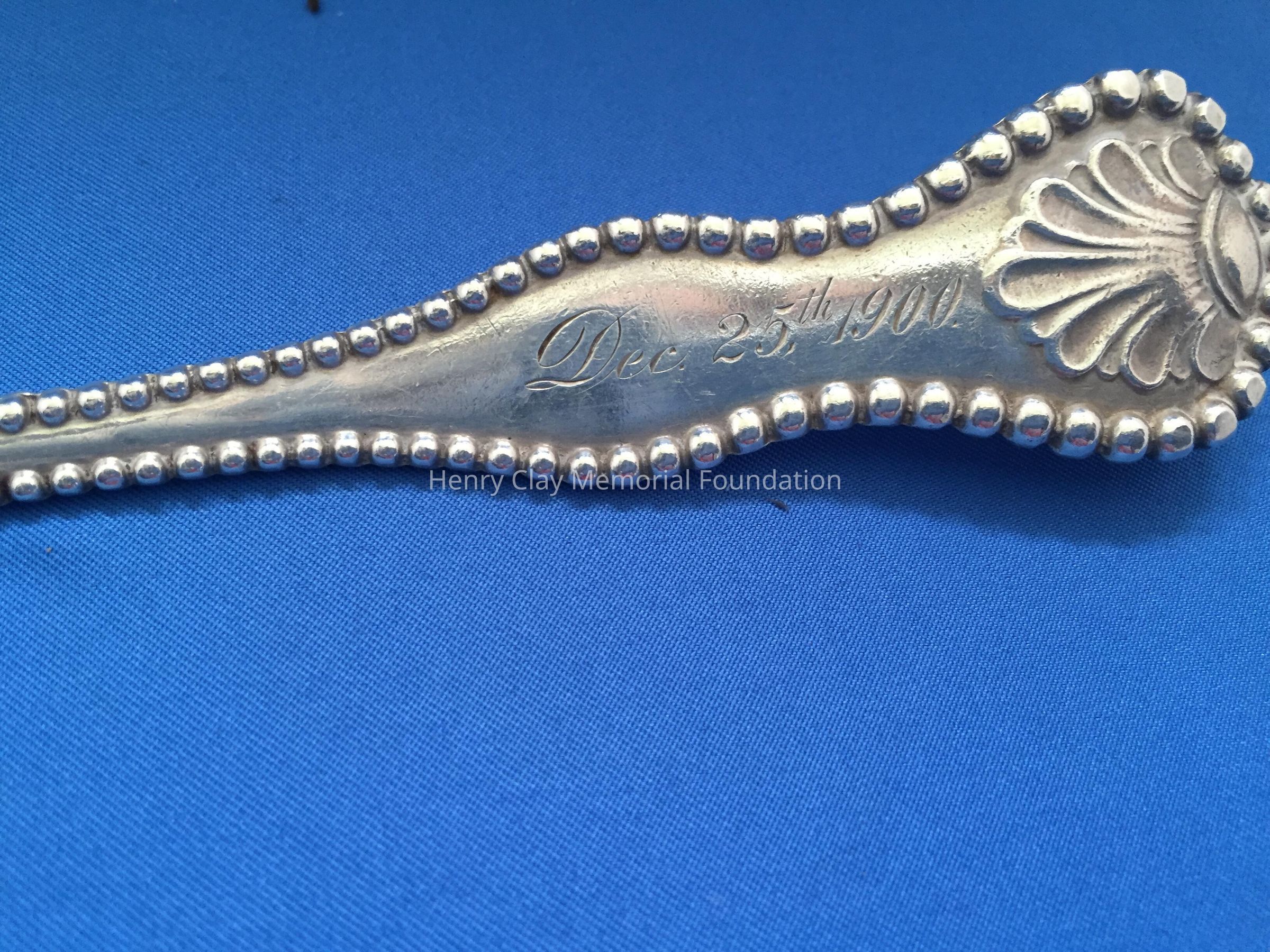 Large sterling serving (?) spoon, beaded around perimeter of handle, and engraved on top front of handle. Back of handle engraved "Dec. 25th 1900." Hallmark on back shows rectangle, circle, and diamond linked.Dimensions