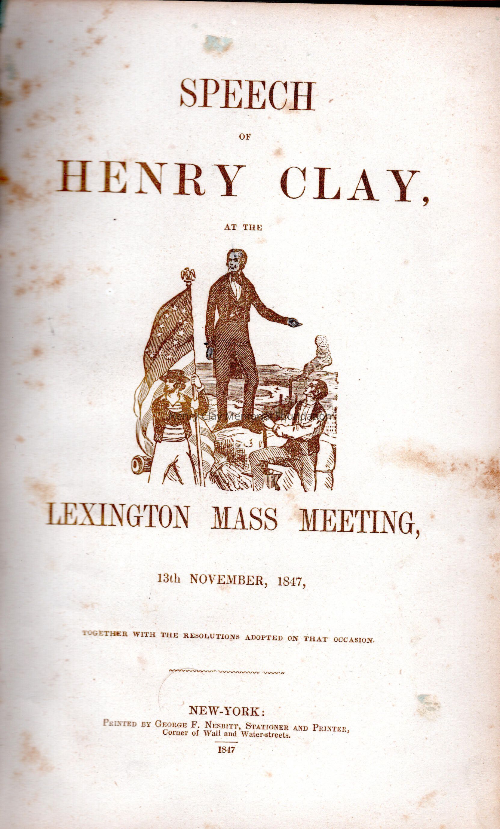Black, pressed design hard front and back cover. "Speech of Henry Clay, to the Lexington Mass Meeting, 13th November, 1847." Printed by George F. Nesbitt, Stationer and Printer, New York, 1847. On the inside back cover, written upside down, is the signature, "Hon. Henry Clay / Ashland." On the sixth page is another name, "John M. Clay / Belle view."