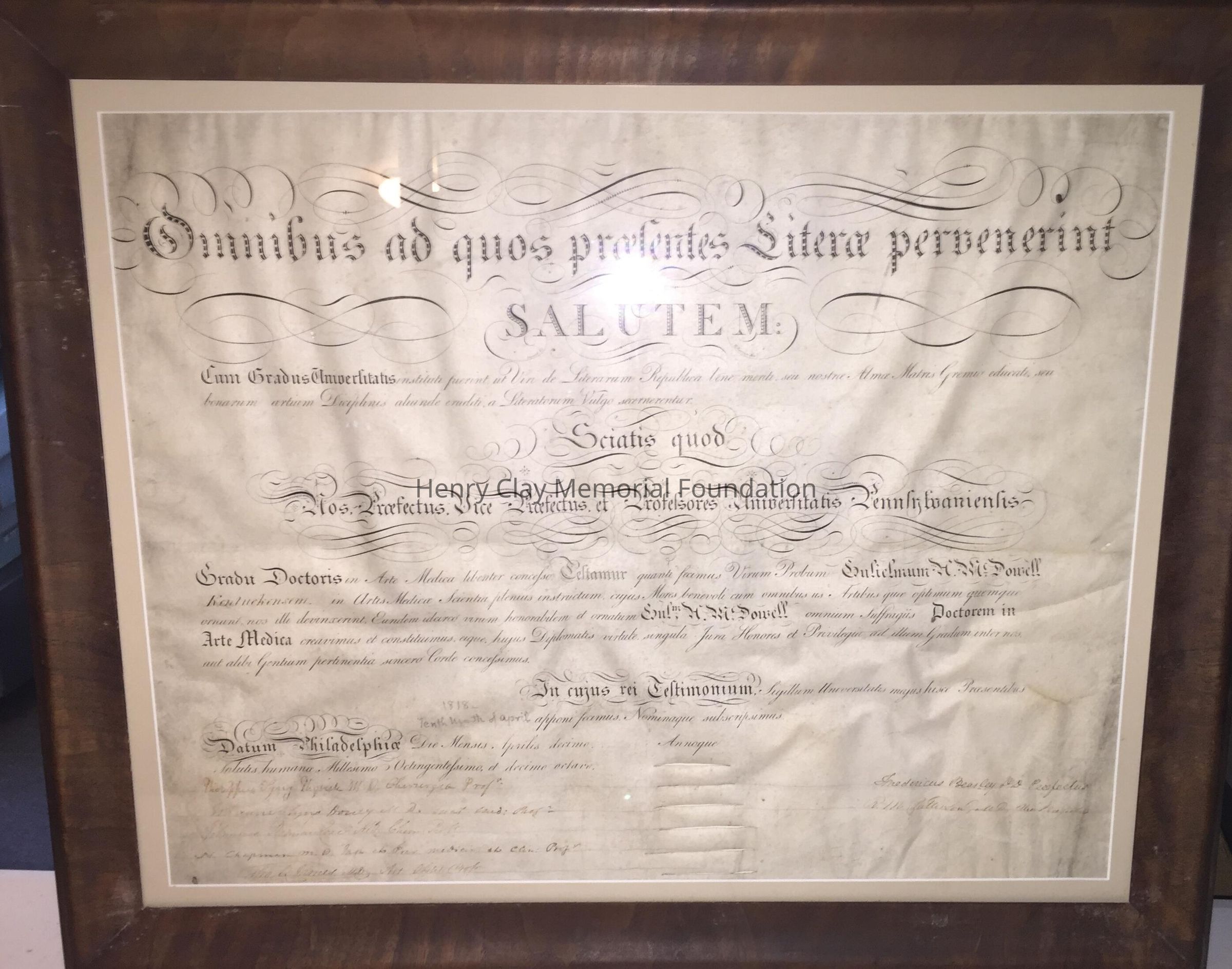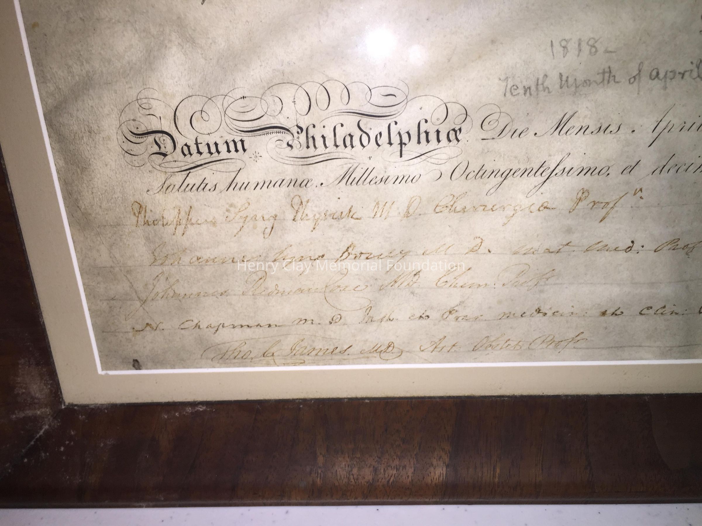 Diploma from the University of Pennsylvania. Starting across the top in large latin text: "Omnibus ad quos . . .." All text written in ink in latin with the exception of the date "1818 / Tenth, month of April," which is written in pencil. Signatures of professors at the bottom left. Matted and framed in original mahogany [?] frame.Dimensions