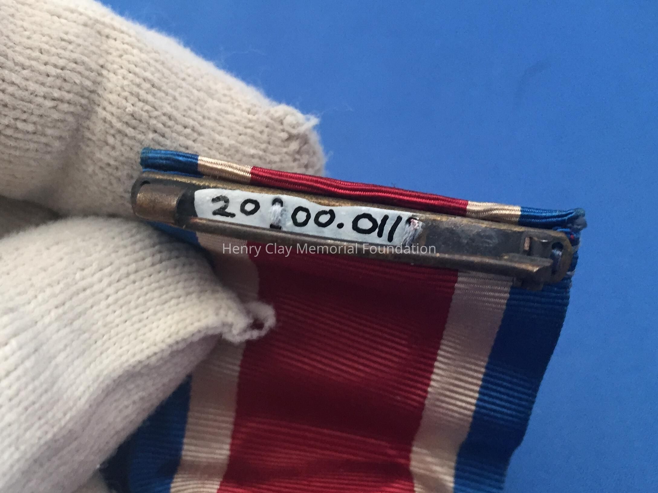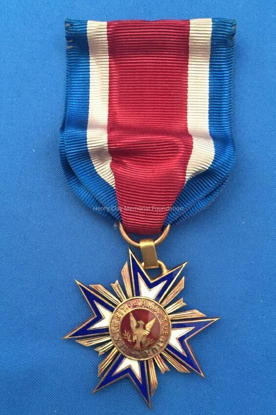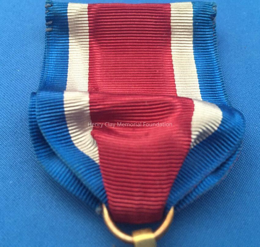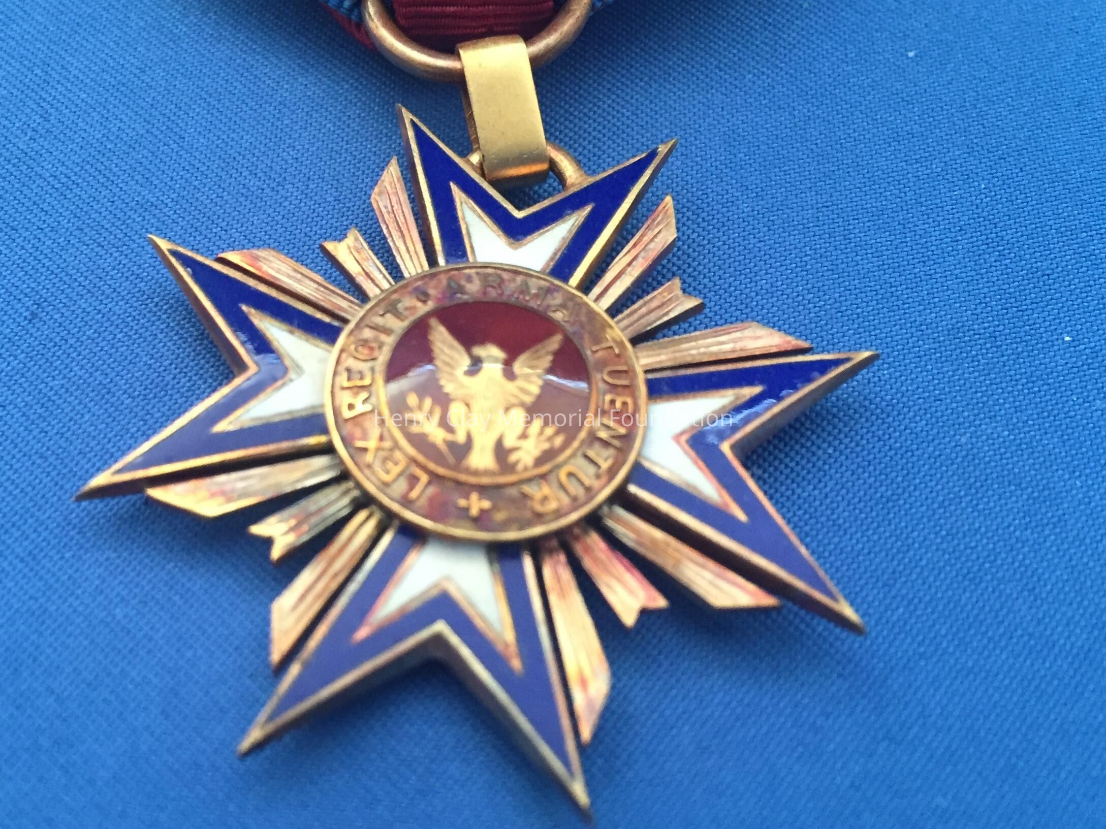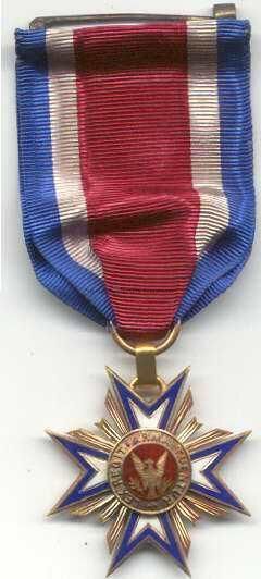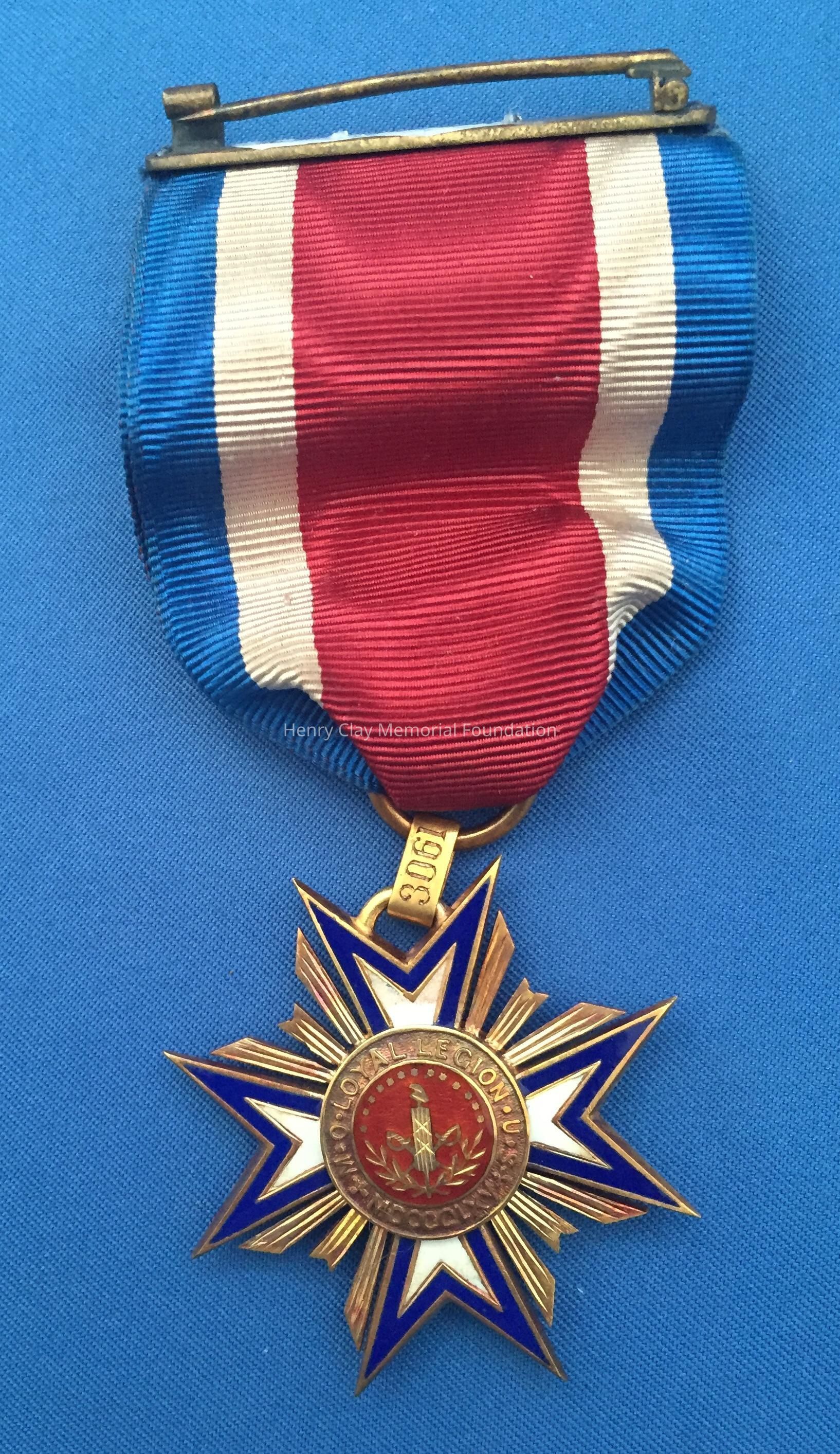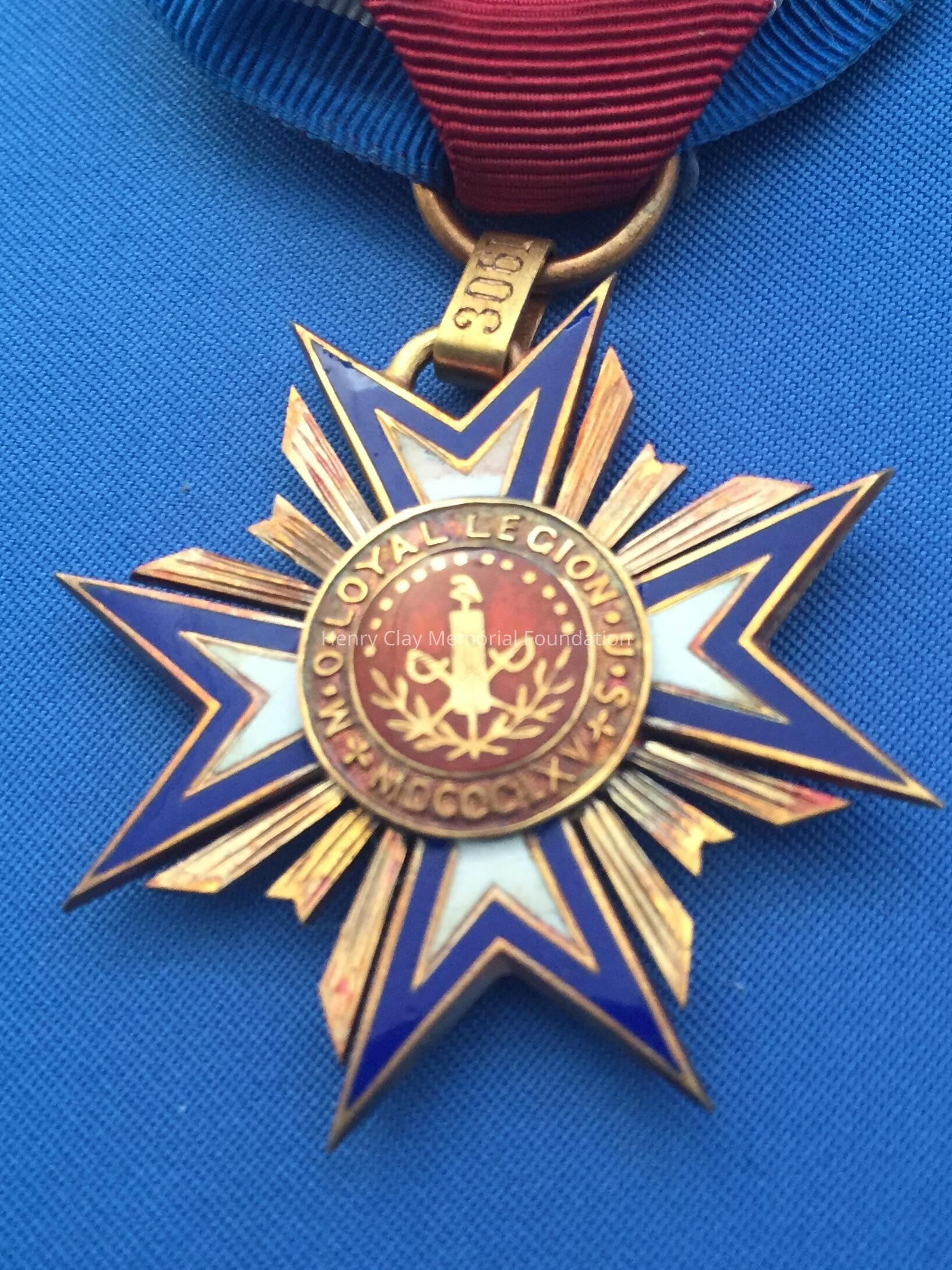 Medal in form of Maltese Cross hanging from loop attached to striped red/white/blue ribbon with metal clasp at top. Ribbon has narrow blue, white stripe at outer edge with broad red stripe in center. Yellow metal loop has number "3061" engraved on it on back side. Medal is yellow, four double points of cross enamelled with blue on outer edge and white inside (same as reverse). Center ( on front) enamelled in red with inset gold eagle holding olive branch and arrows. Around edge in gold banding: " LEX REGIT ARMA TUENTUR" (on back). Center shows crossed swords resting on branches, enamelled in red inset. Around edge in gold banding. Writing around "M.O. LOYAL LEGION. U.S. -- MDCCCLXV [1865]"Dimensions