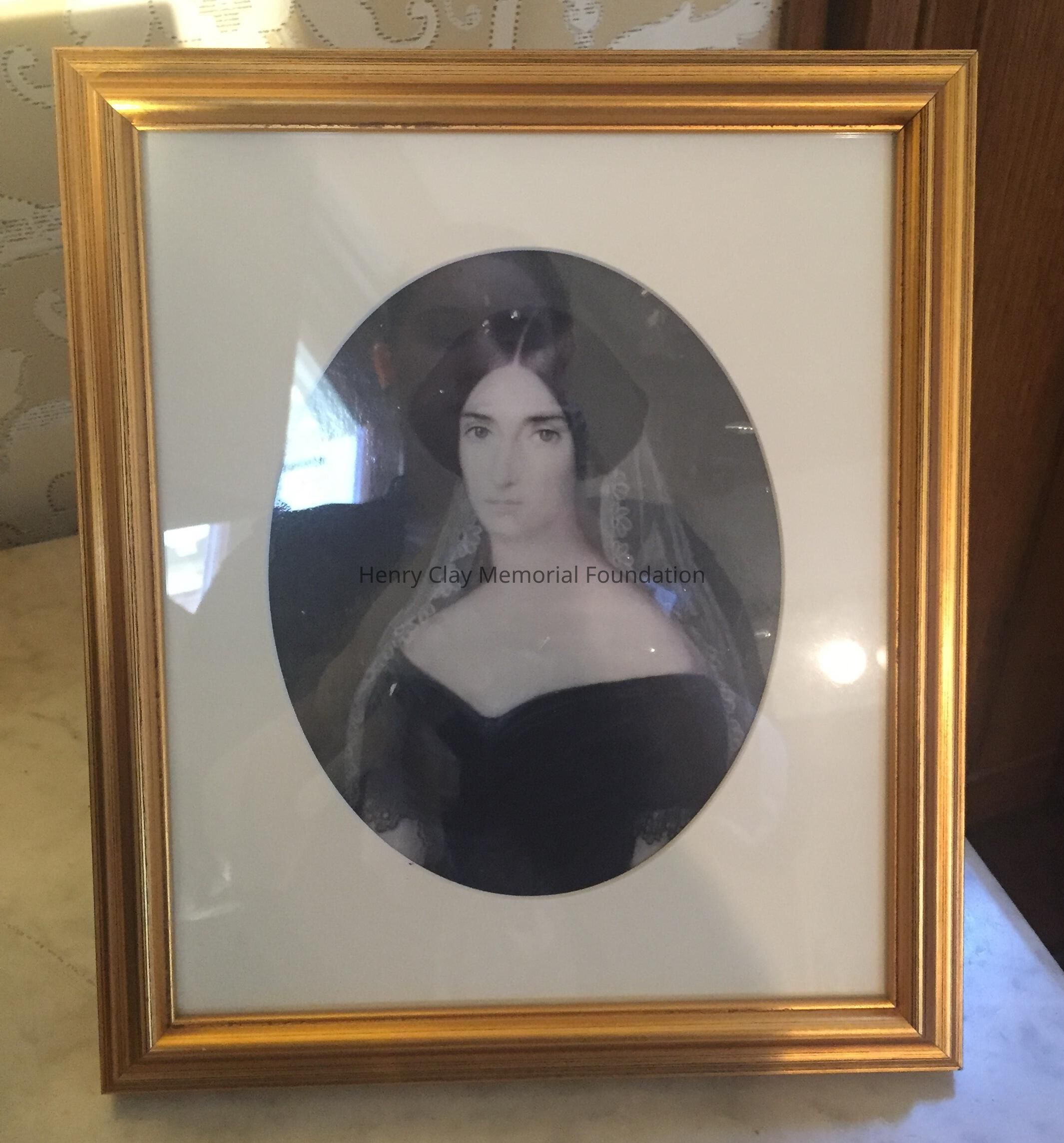 Modern color photograph of a miniature oval painting of Henry Clay's daughter-in-law, Susan Jacob Clay, the wife of James Brown Clay. Susan is shown with dark brown hair split in the middle with lace flowing from the back of her head. She is wearing a dark gown just off the shoulders. Grey-green background. Photo framed and matted in modern, reproduced Victorian-period, gold frame with black velvet back.Dimensions