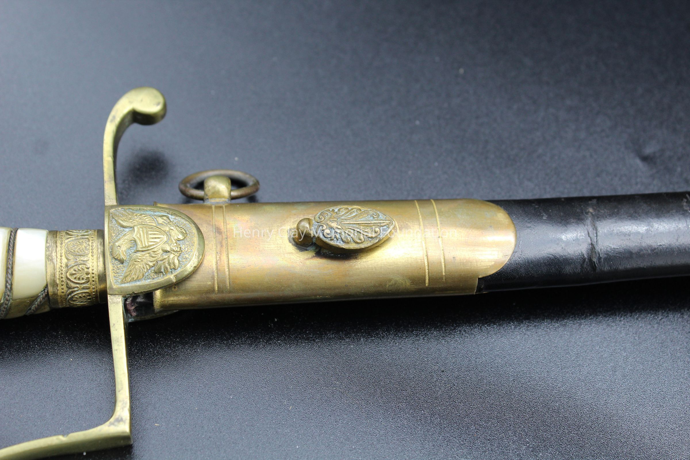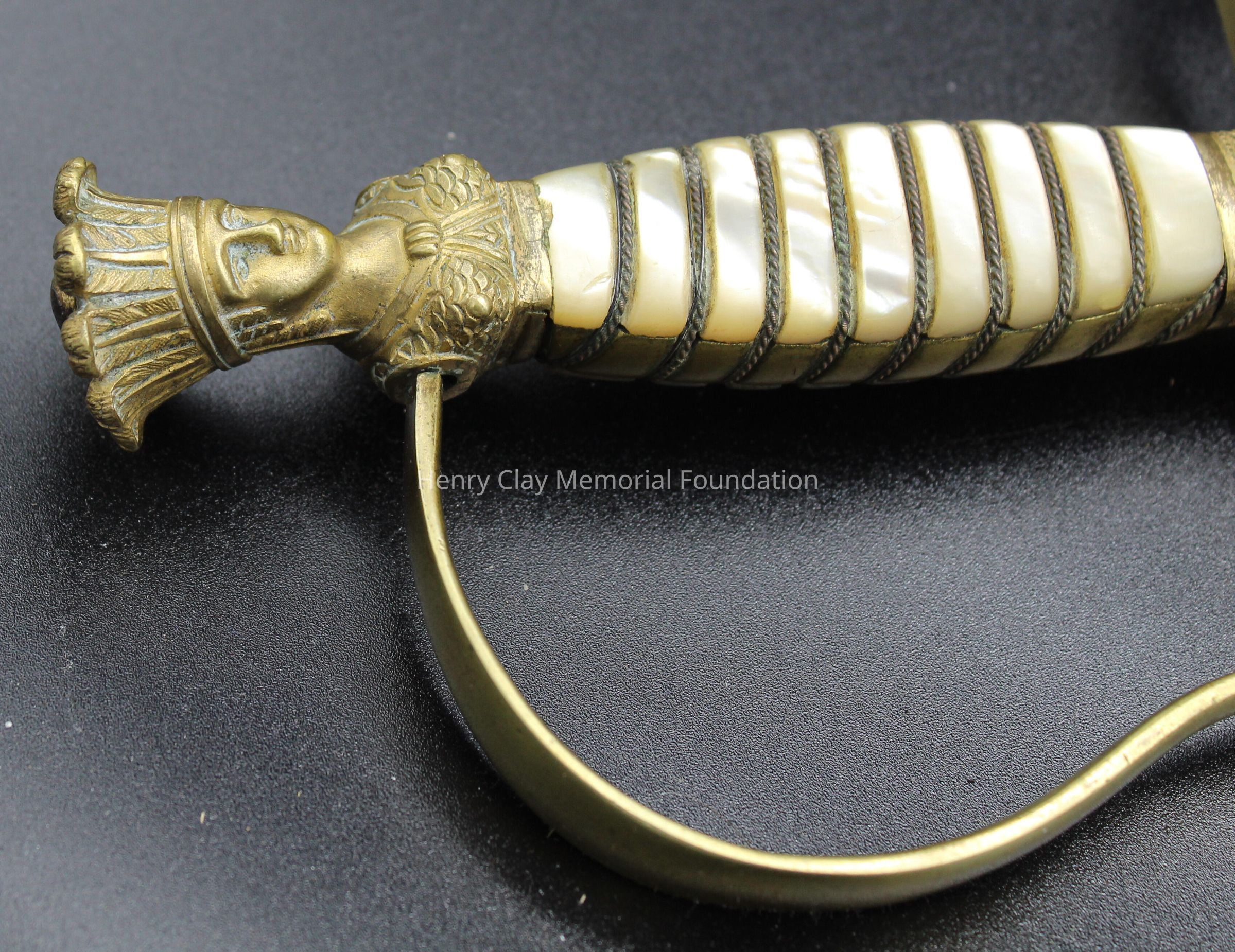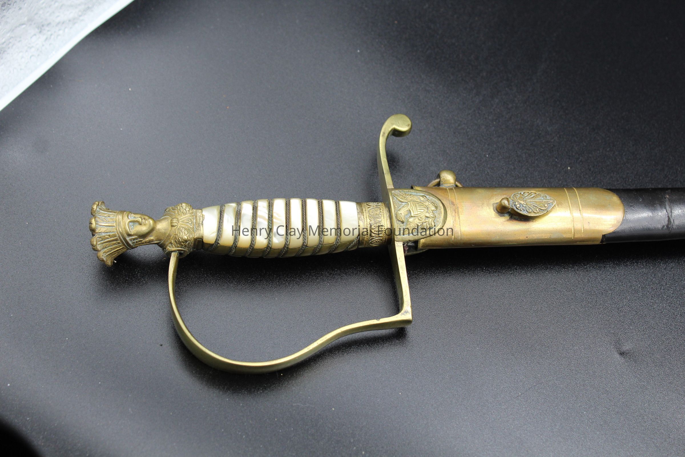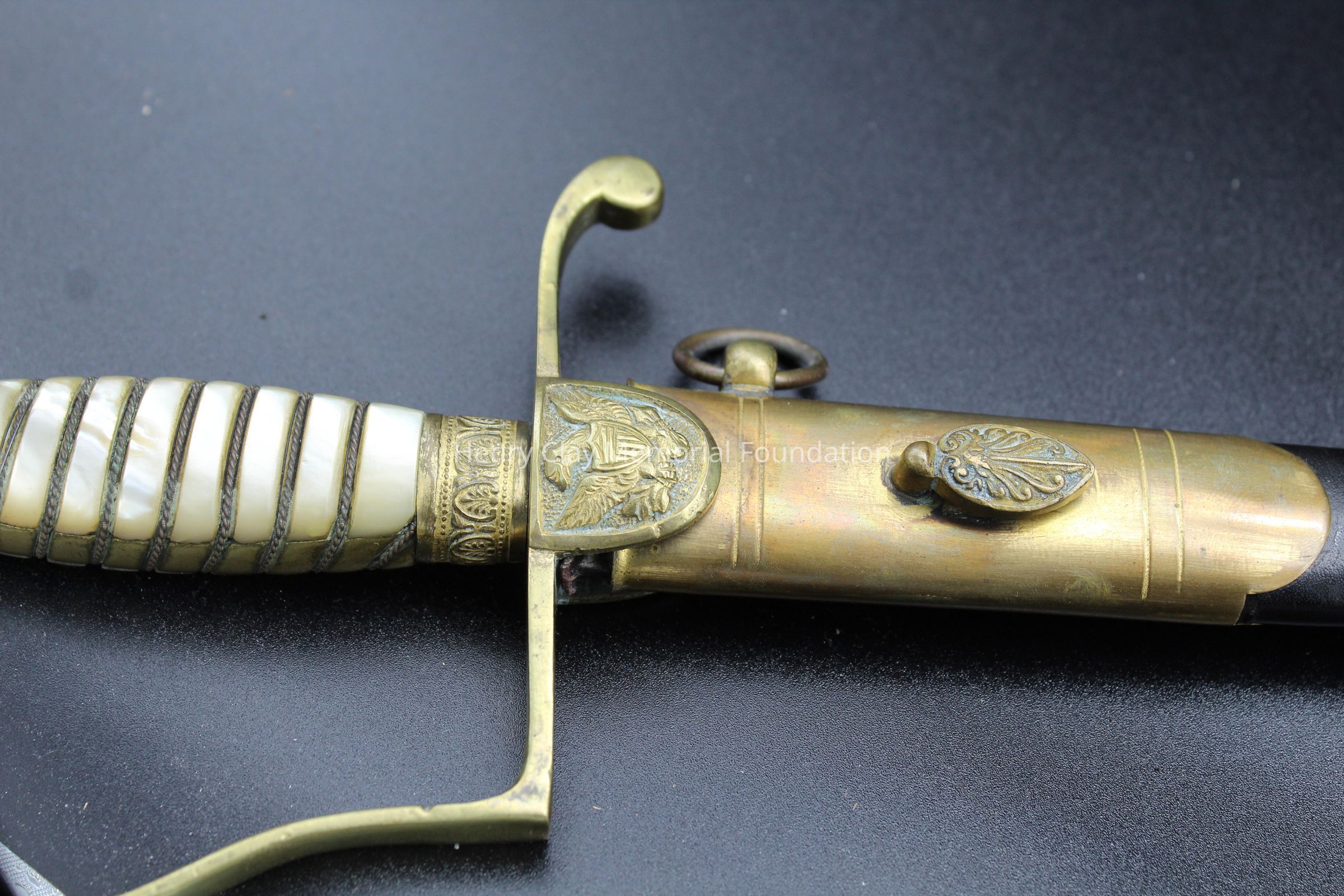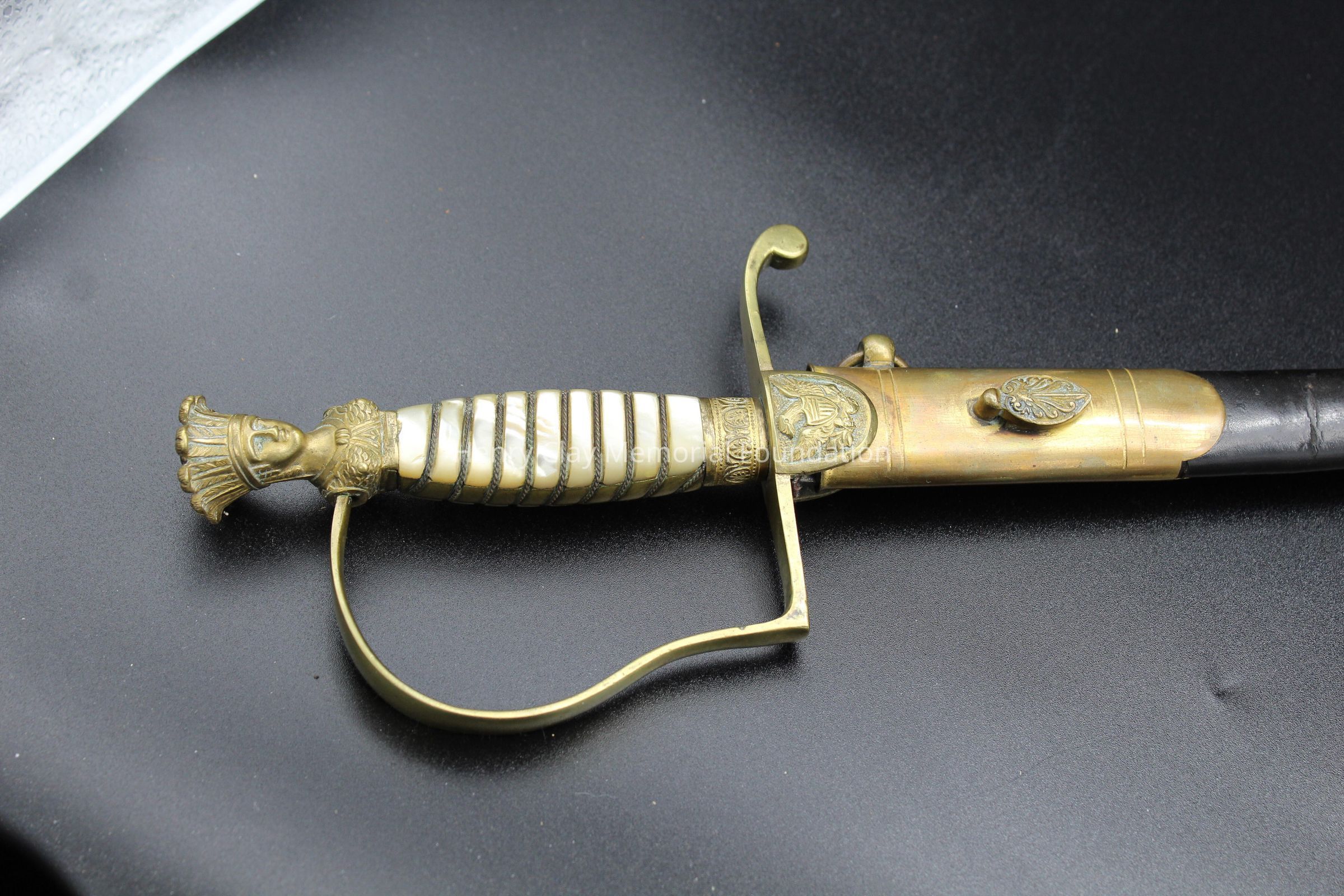 Small sword in black leather scabbard with brass fittings. The sword has a handle with a brass knuckle bow/quillion, mother of pearl plates and a brass pommel in the shape of the upper torso of a woman in feather headdress. The grips are wire wrapped. The blade is blued at the top and has brass washed decorations. The scabbard has two fitting with rings for a chain for mounting on a belt. There should be a thrid fitting at the end of the scabbard but it is missing.