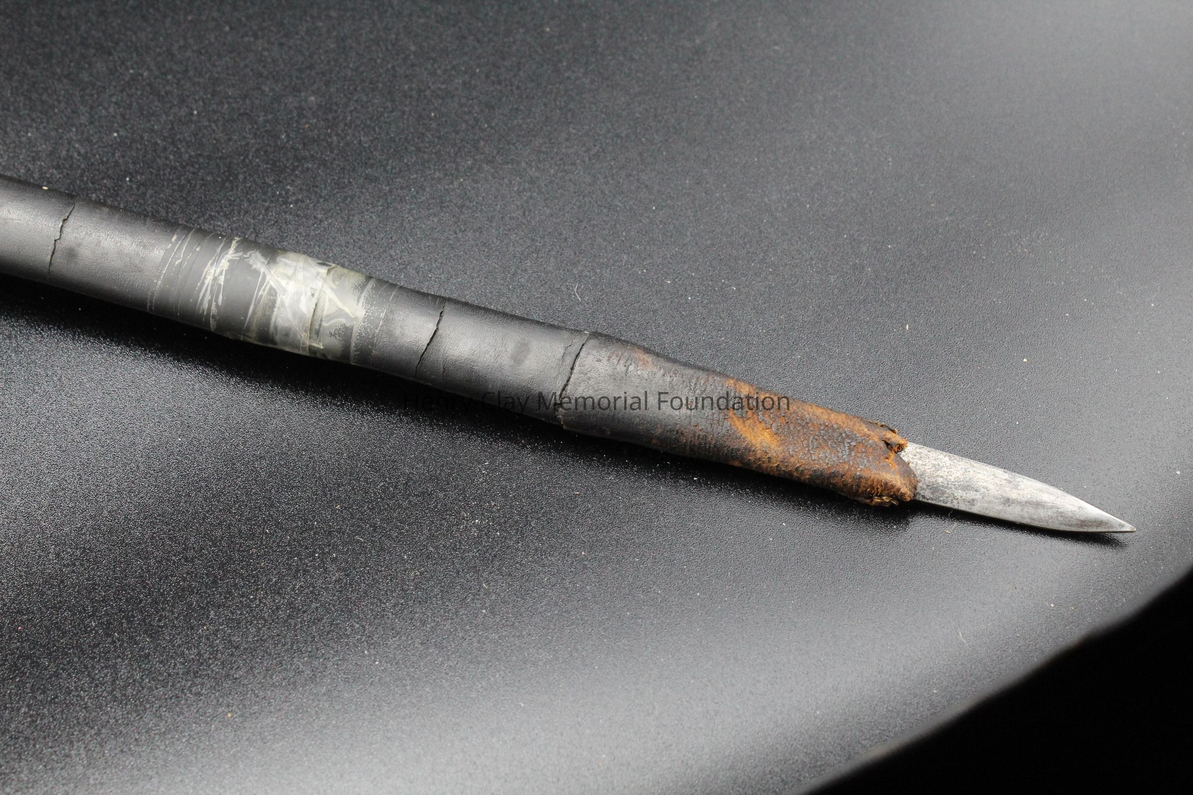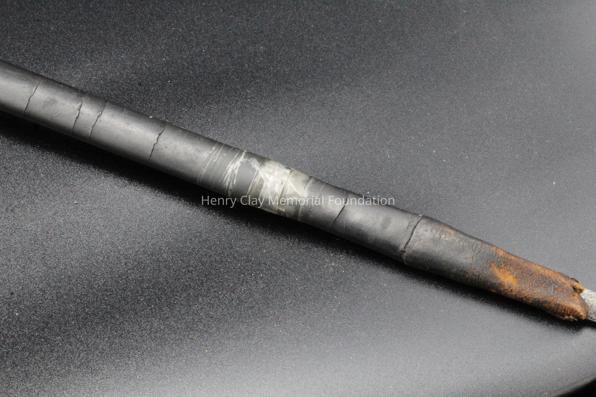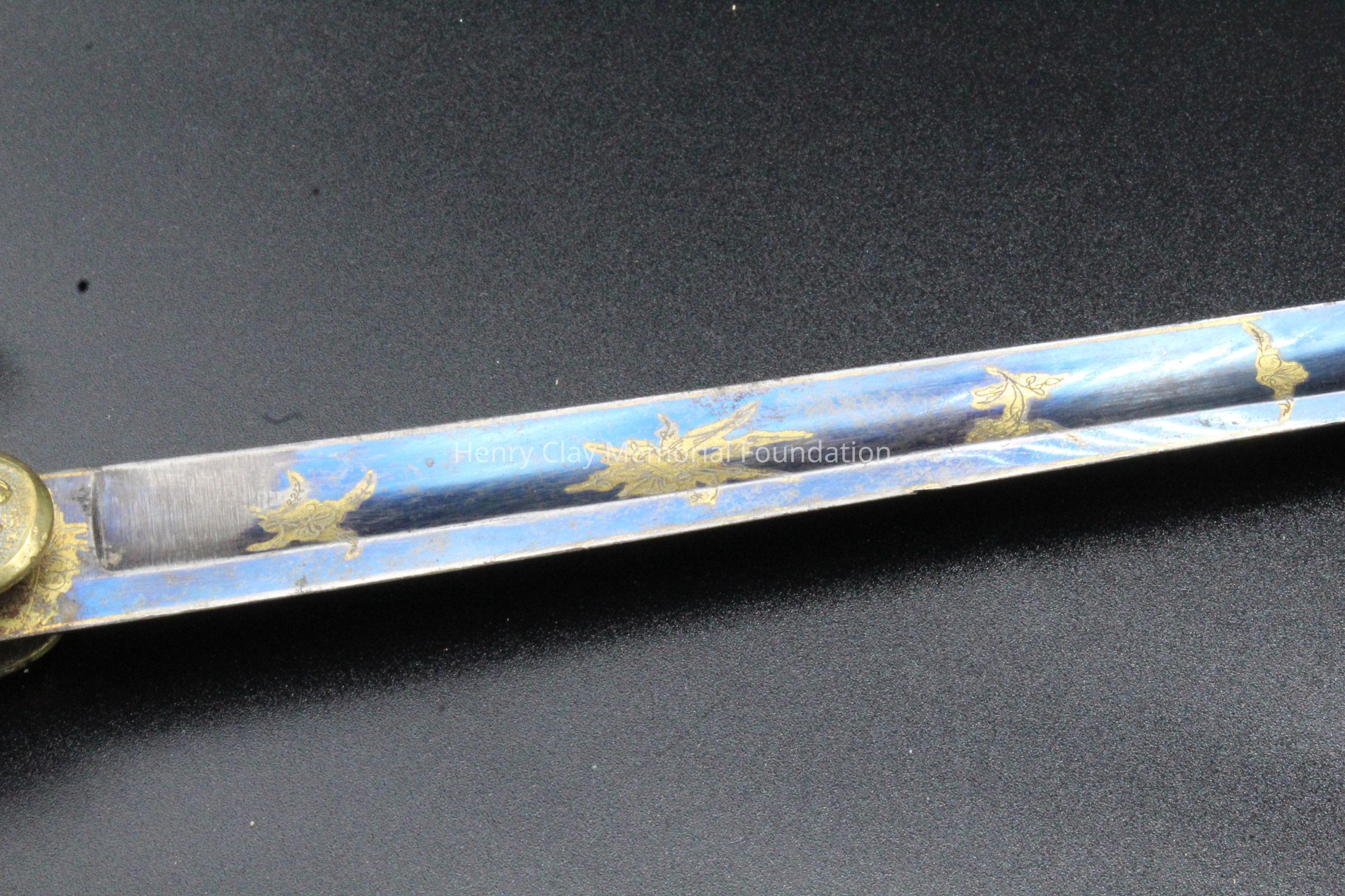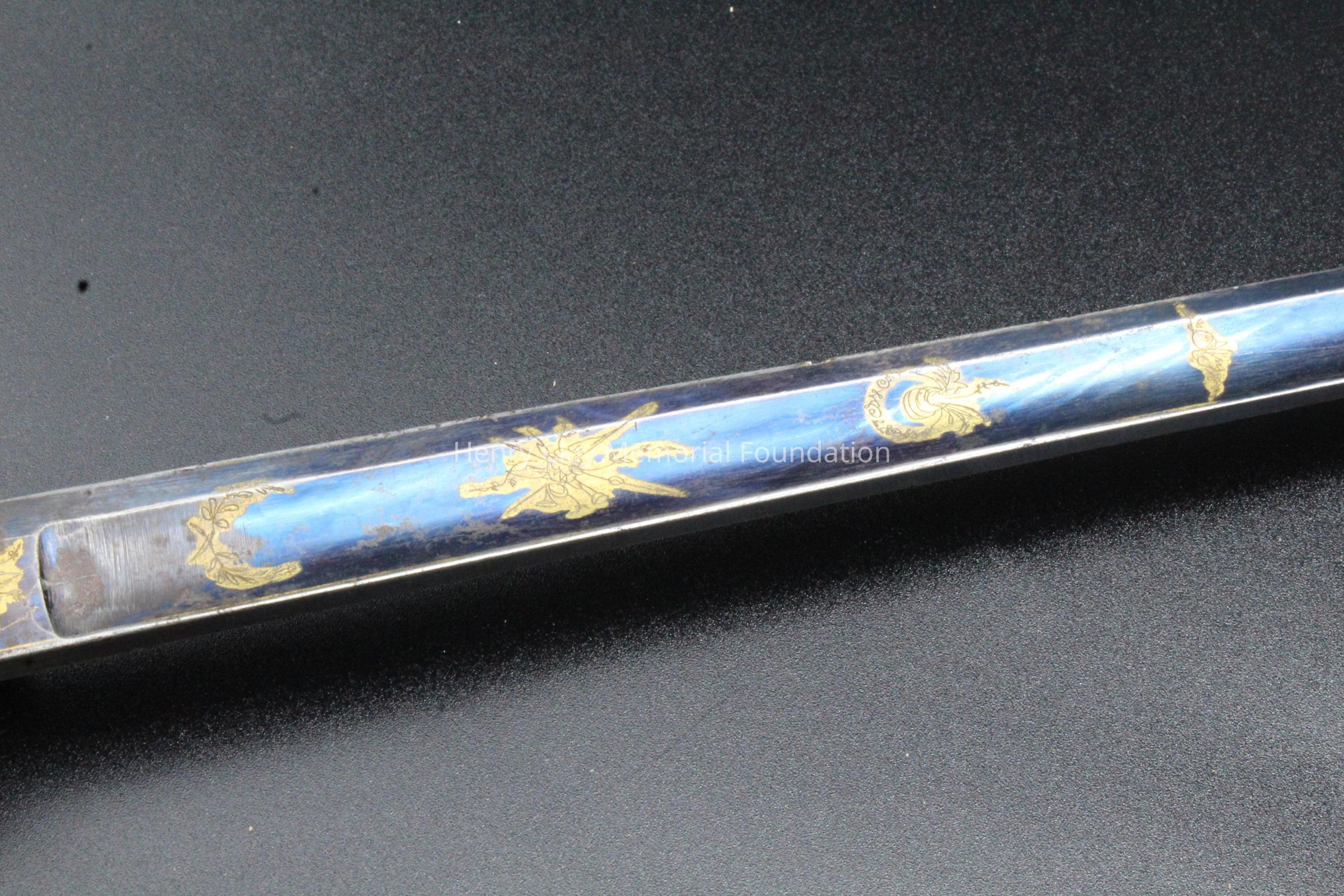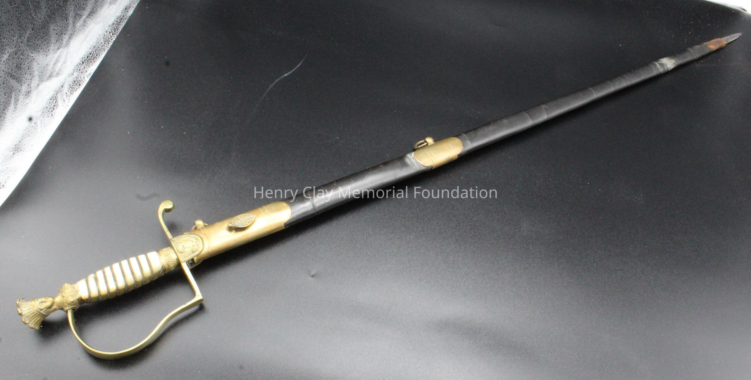 Small sword in black leather scabbard with brass fittings. The sword has a handle with a brass knuckle bow/quillion, mother of pearl plates and a brass pommel in the shape of the upper torso of a woman in feather headdress. The grips are wire wrapped. The blade is blued at the top and has brass washed decorations. The scabbard has two fitting with rings for a chain for mounting on a belt. There should be a thrid fitting at the end of the scabbard but it is missing.