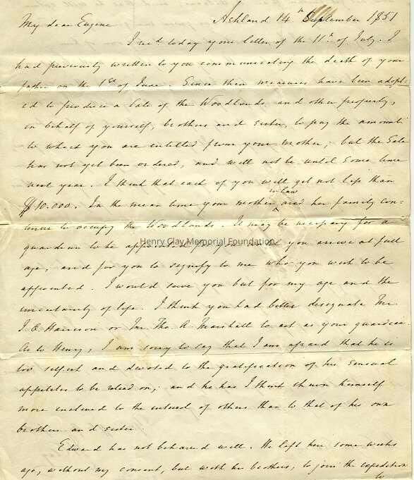 A letter written in ink from Henry Clay to his grandson, Eugene Erwin, dated September 14, 1851. Letter written on front and back has several creases with tears at some of the creases, but not effecting text. Letter discusses the sale of Woodlands (the Erwin family home) and the amount of money that each child will get, the behavior of Henry Clay Erwin and Charles Edward Erwin (Eugene's brothers), Eugene living in California, and his sister Lucretia Hart Erwin, who is expecting a child. Clay also remarks that his health is delicate. Text of letter follows: