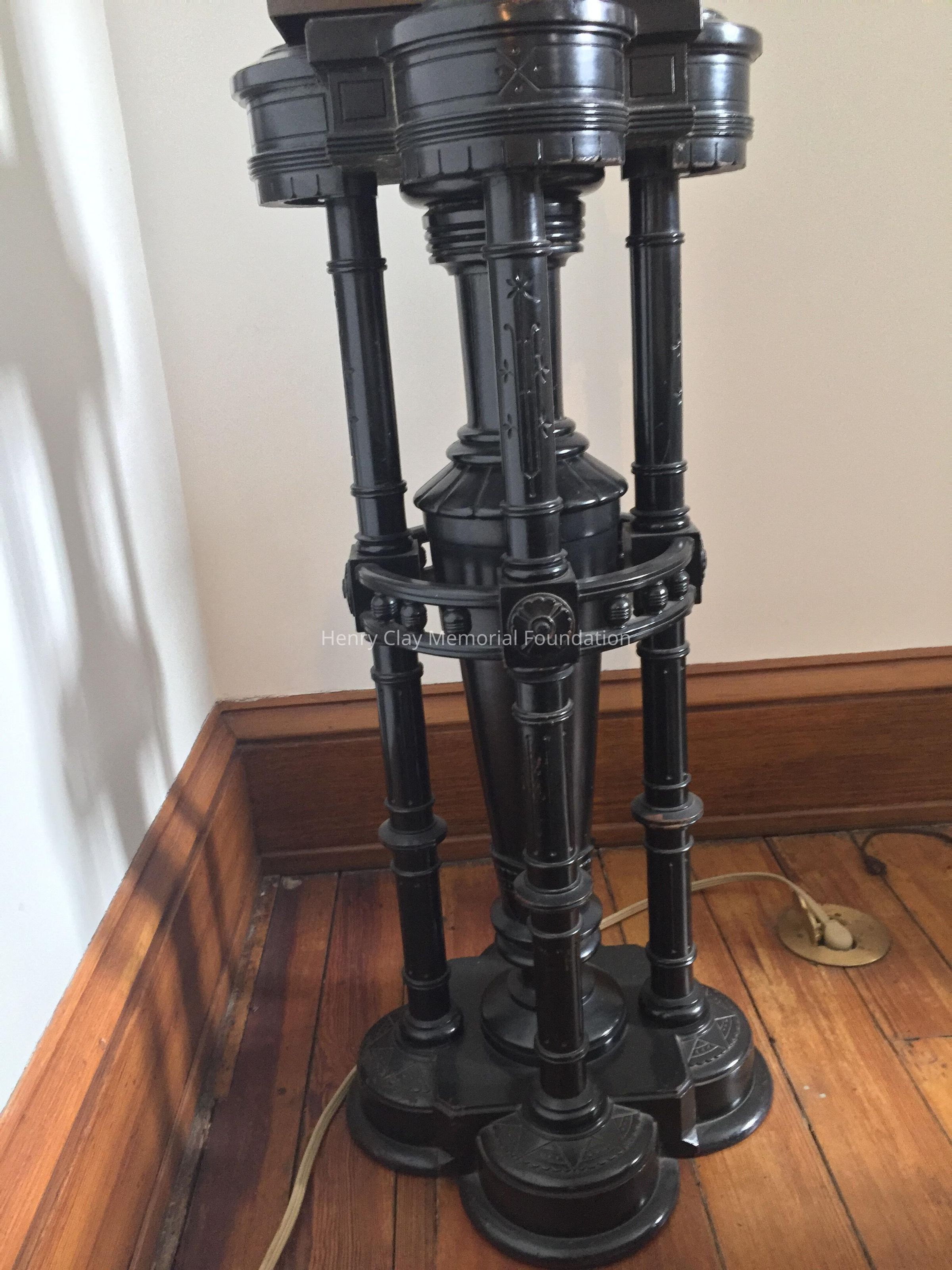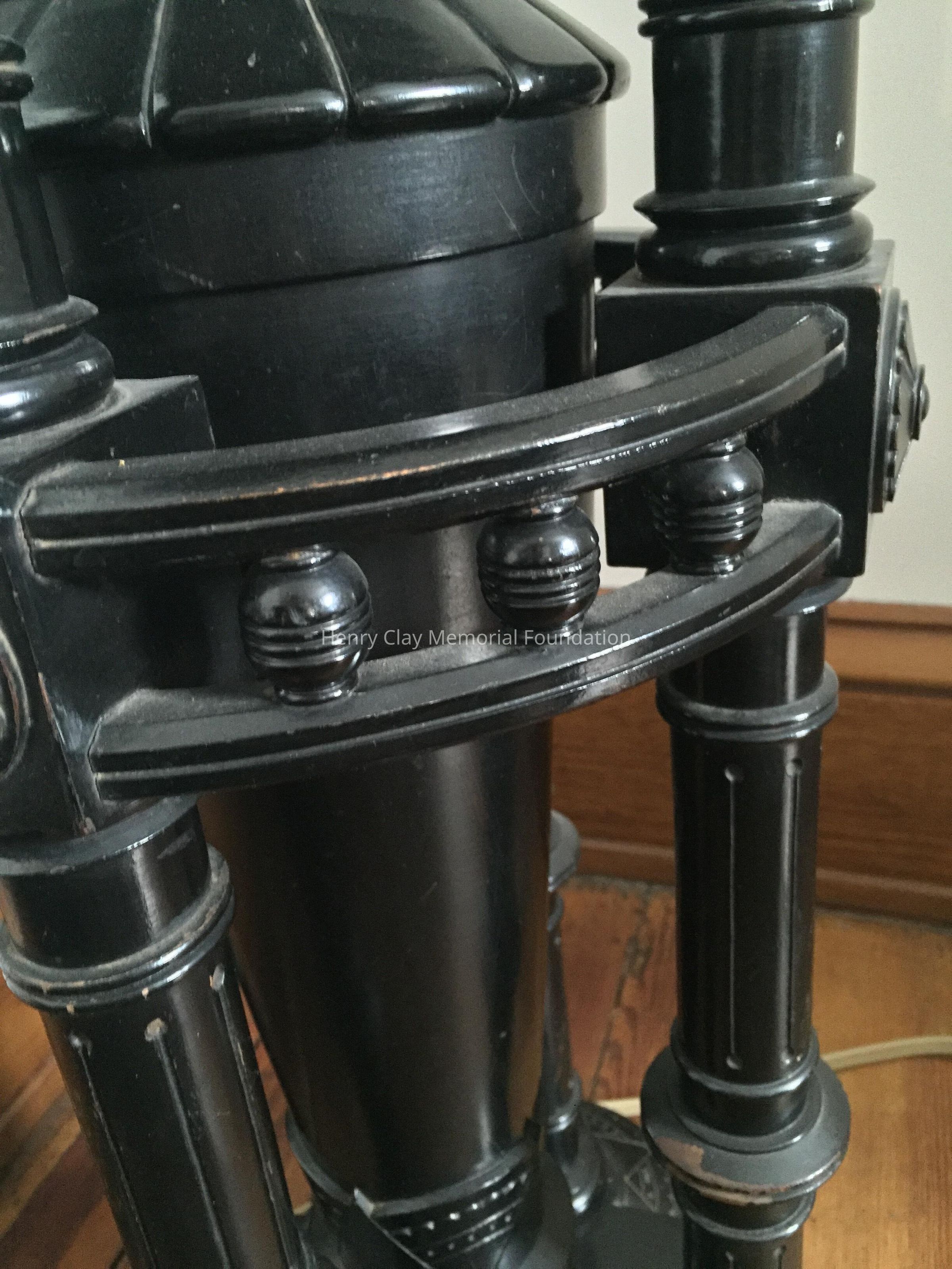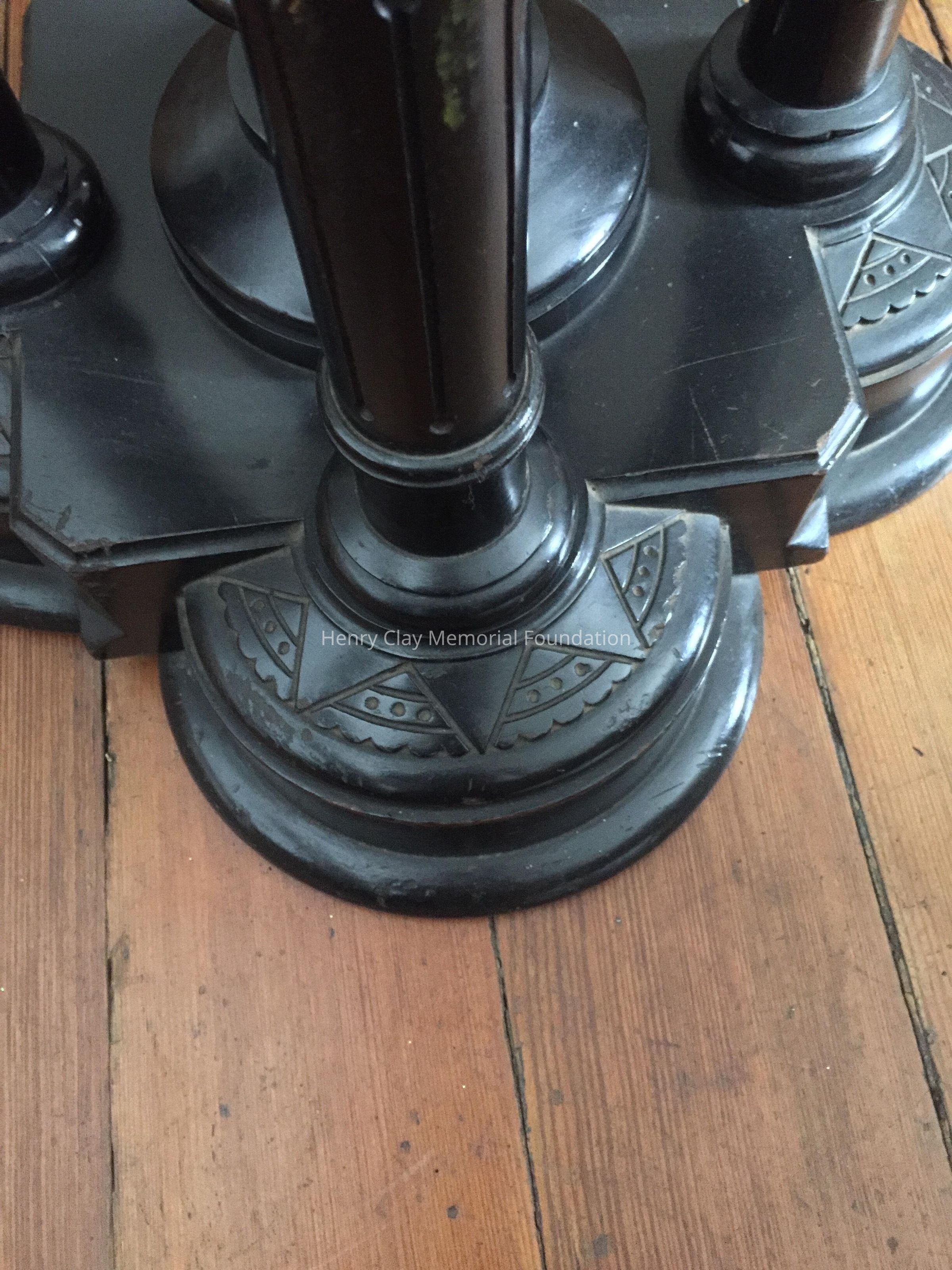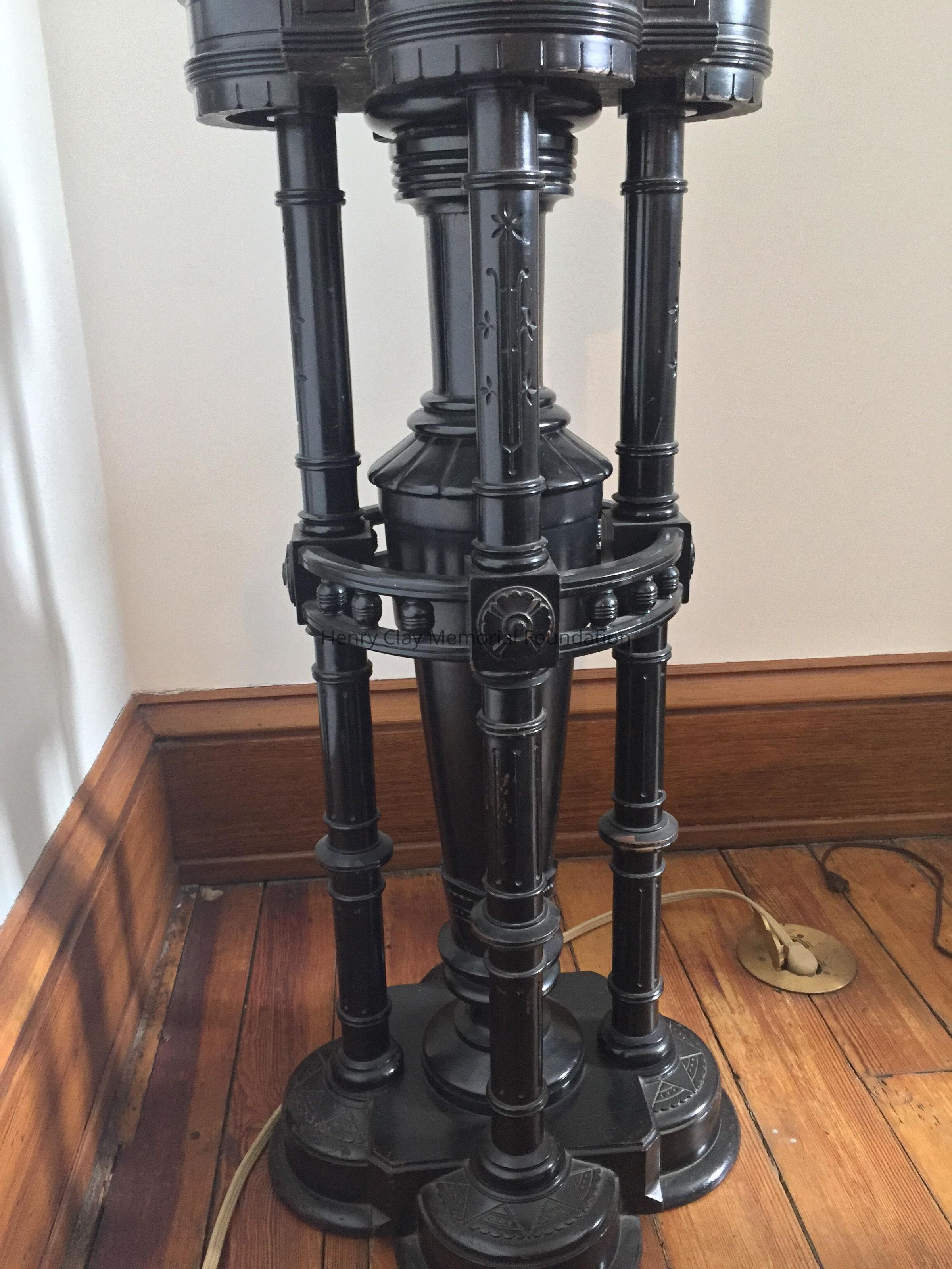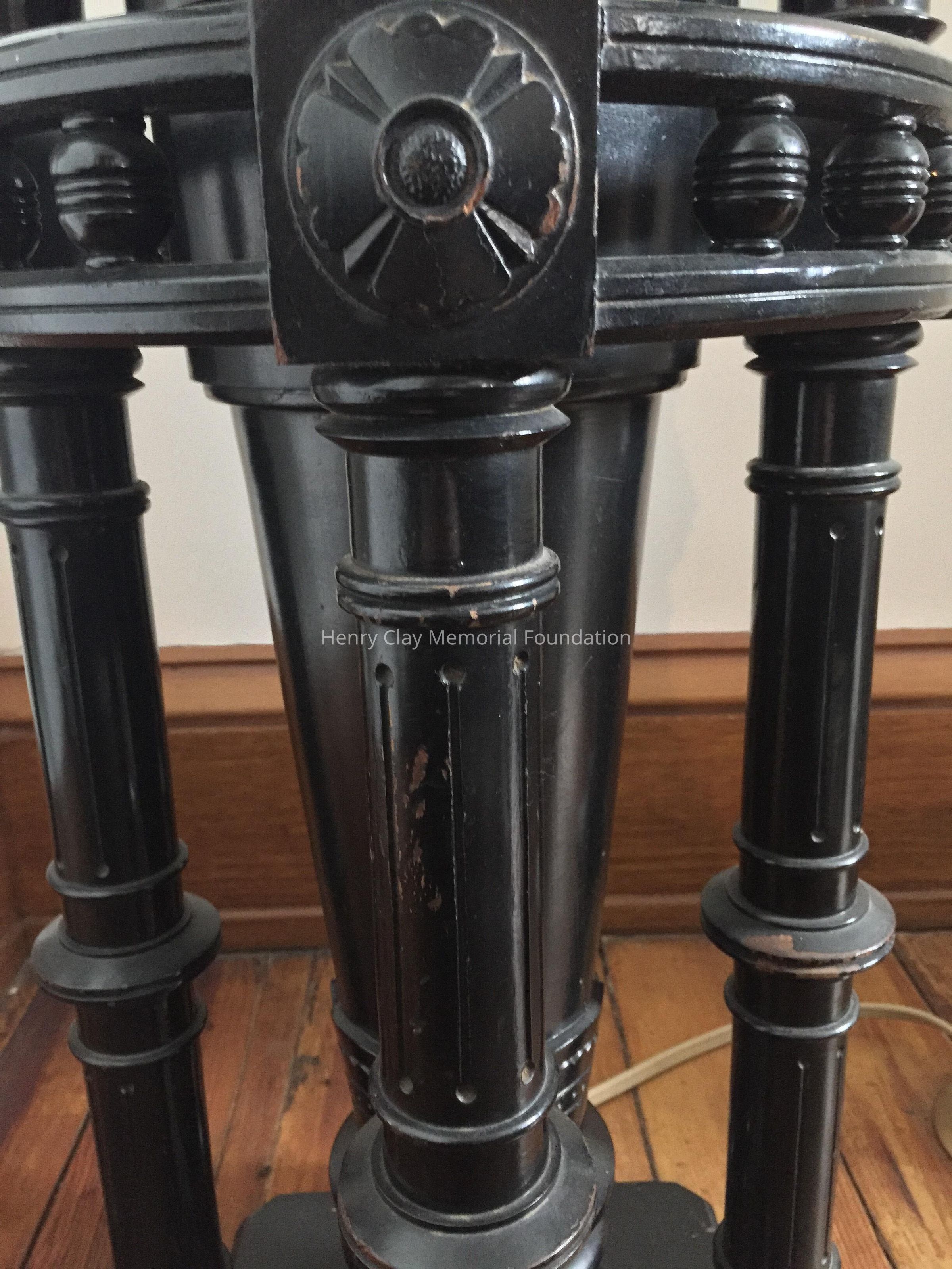 Black Eastlake style pedestal with large cental column surrounded by four smaller columns connected by rail and spindles at middle. Clover-shaped base and matching top. The wood is carved with fan-shaped designs, lines, flowers, etc. On the bottom underside of the pedestal written in chalk or white paint is "H.C. McDowell".Dimensions