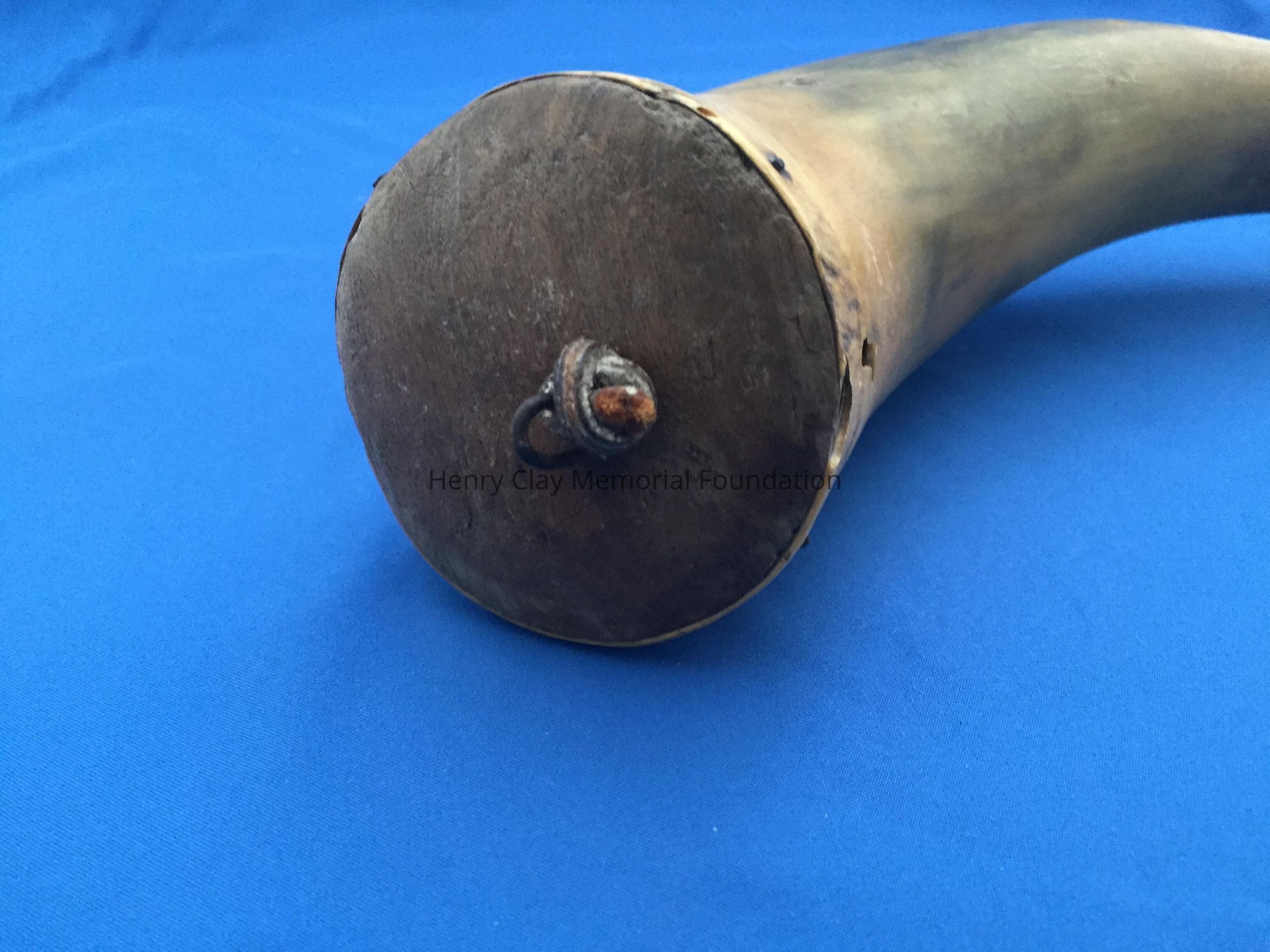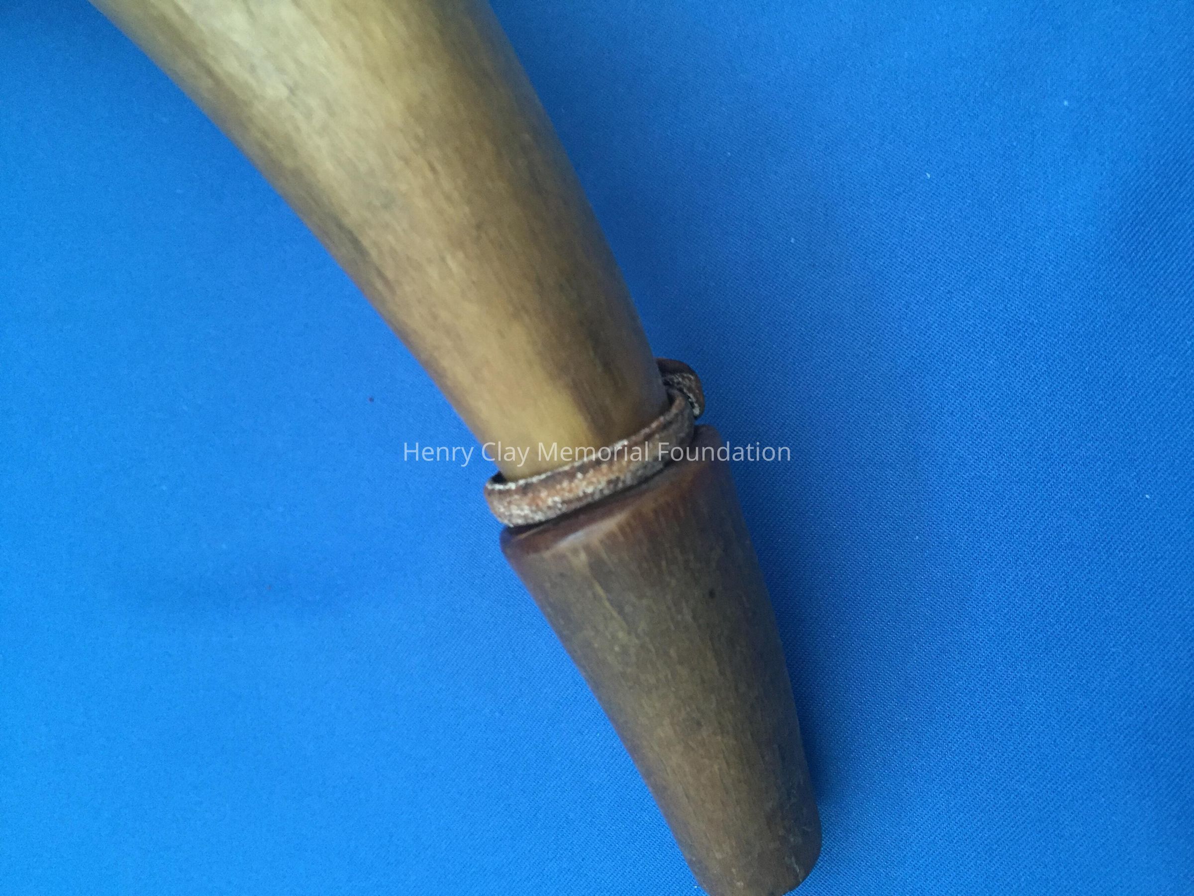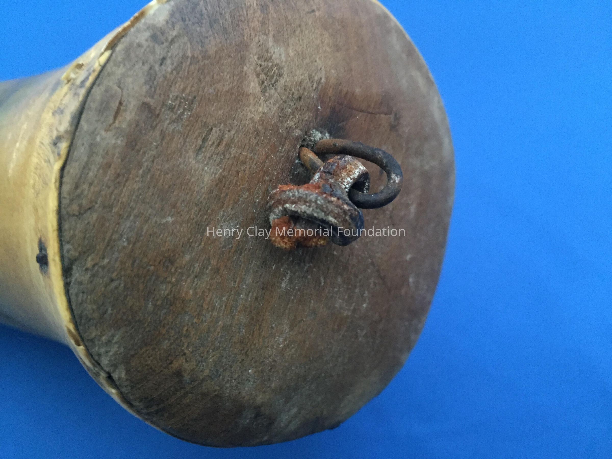 Horn made from hollowed-out animal horn. Large end of horn is corked with wood. Metal hook is inserted in wood for a leather strap (leather knot is still attached). There are several small holes in the horn (one large hole near large end). Leather straps attached at small end of horn.