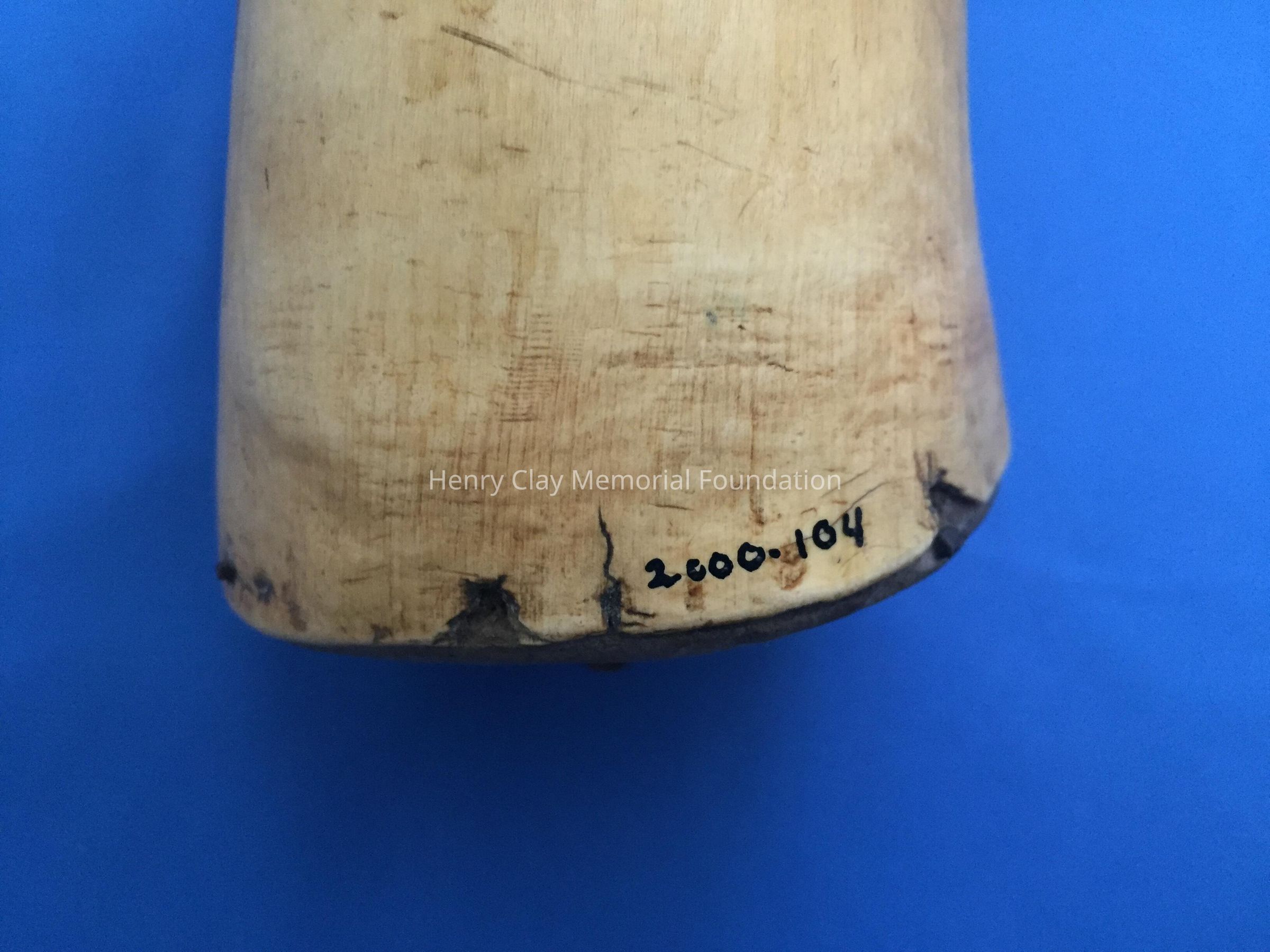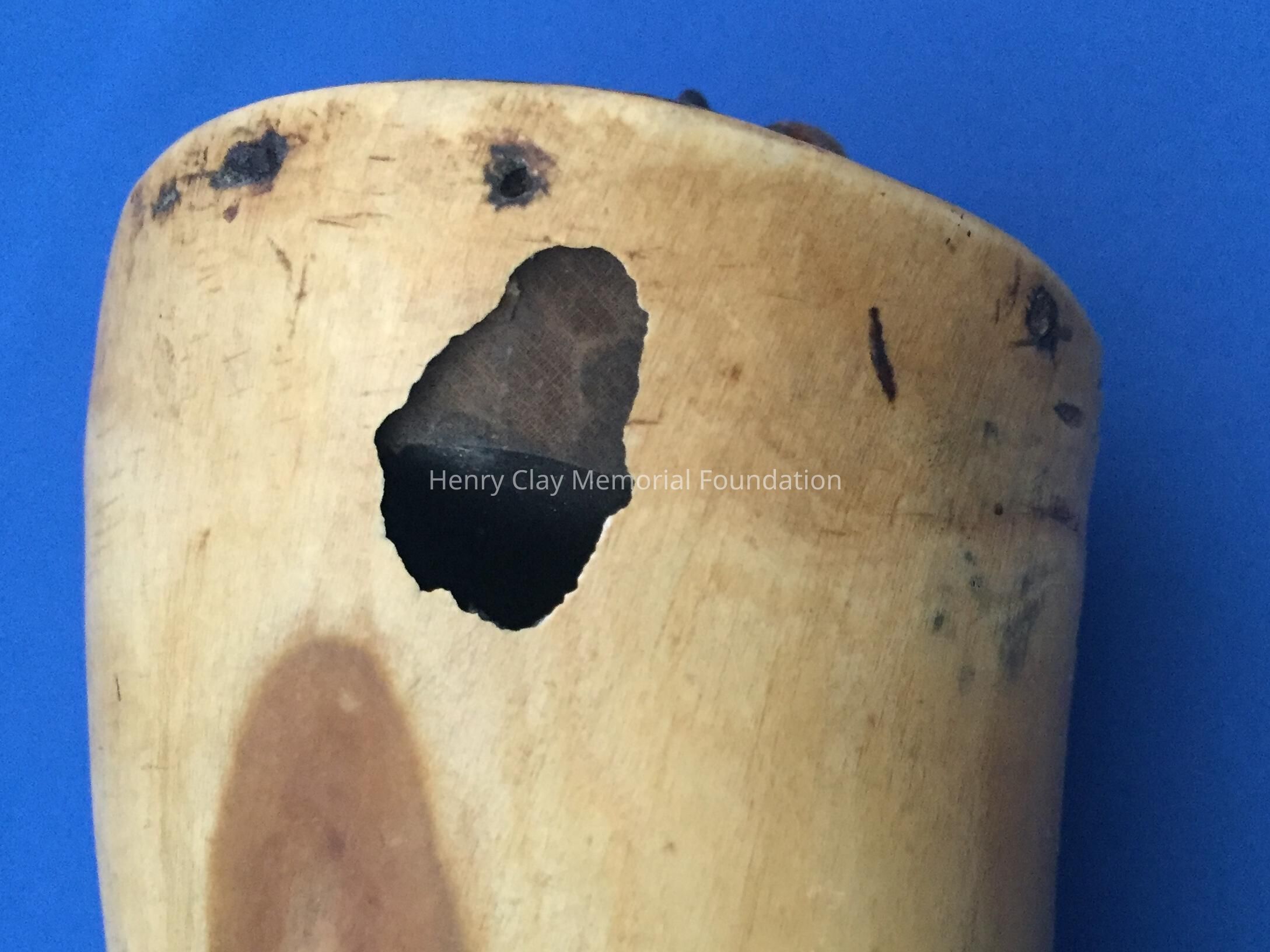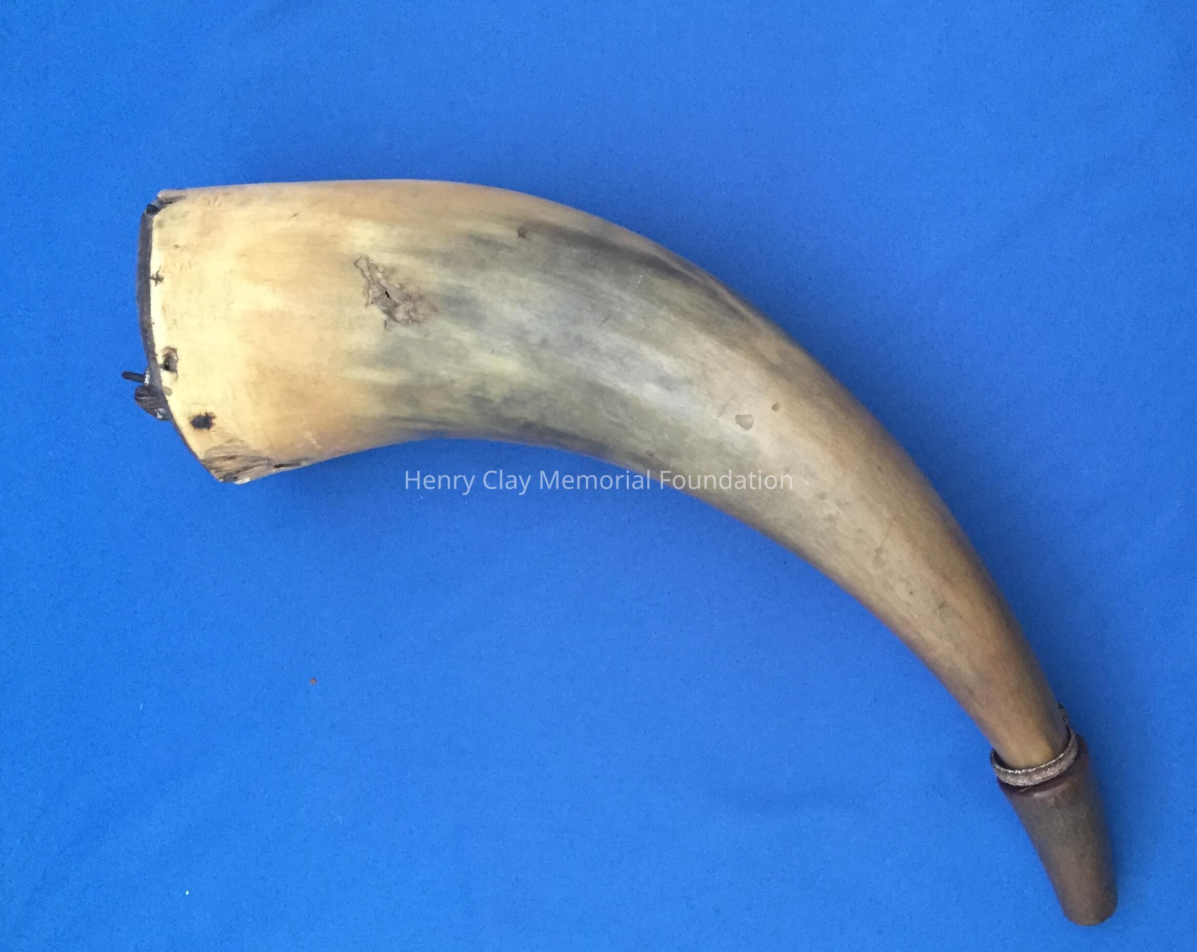 Horn made from hollowed-out animal horn. Large end of horn is corked with wood. Metal hook is inserted in wood for a leather strap (leather knot is still attached). There are several small holes in the horn (one large hole near large end). Leather straps attached at small end of horn.