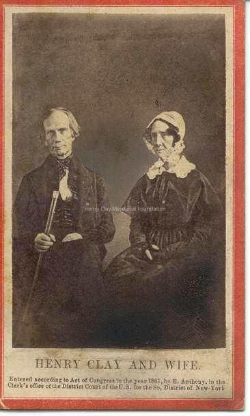 Black and white image of Henry Clay and his wife Lucretia. Clay is shown later in life, seated, wearing a dark coat, vest, pants and tie holding a cane in his right hand, his left hand resting in his lap, his head tilted slightly to his right. Lucretia is shown seated, wearing a dark dress with white, ruffled collar and a white bonnet. The image is adhered to a card with a red border. Below the image is printed text: "HENRY CLAY AND WIFE. / Entered according to Act of Congress in the / year 1861, by E. Anthony, in the Clerk's office of the District Court of the U.S. for the So. District of New York." On the back of the card, partially obscured, is a printed image of a building with text above: "Published by / E. ANTHONY / 501 Broadway, N.Y." and "Manufacturer of Photographic Albums." At bottom in fine print: "Snyder, Black & Sturn [or Stum], NY." Other markings of unknown origin are on back of card.Dimensions
