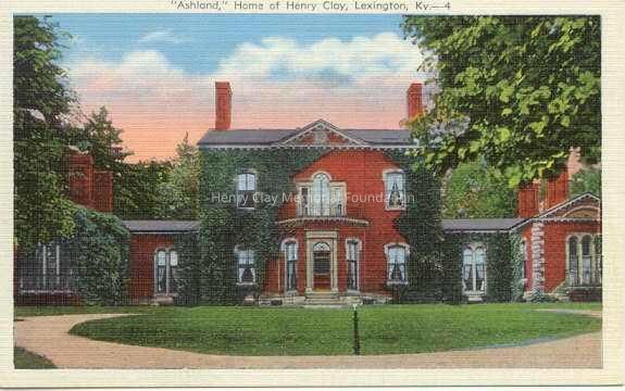 Brightly colored postcard depicting the front of the house at Ashland. Printed in black, block letters at top of card: "'Ashland,' Home of Henry Clay, Lexington, Ky.--4." House is partly covered with ivy, curtains are shown in the windows, etc. Back of three cards is similar; they all give the information of the publisher: "Published by Ferguson News Co., Lexington, Ky. Made in USA." The fourth card also gives this info: "Natural color post card made in USA by E.C. Kropp Co., Milwaukee, Wis."Dimensions