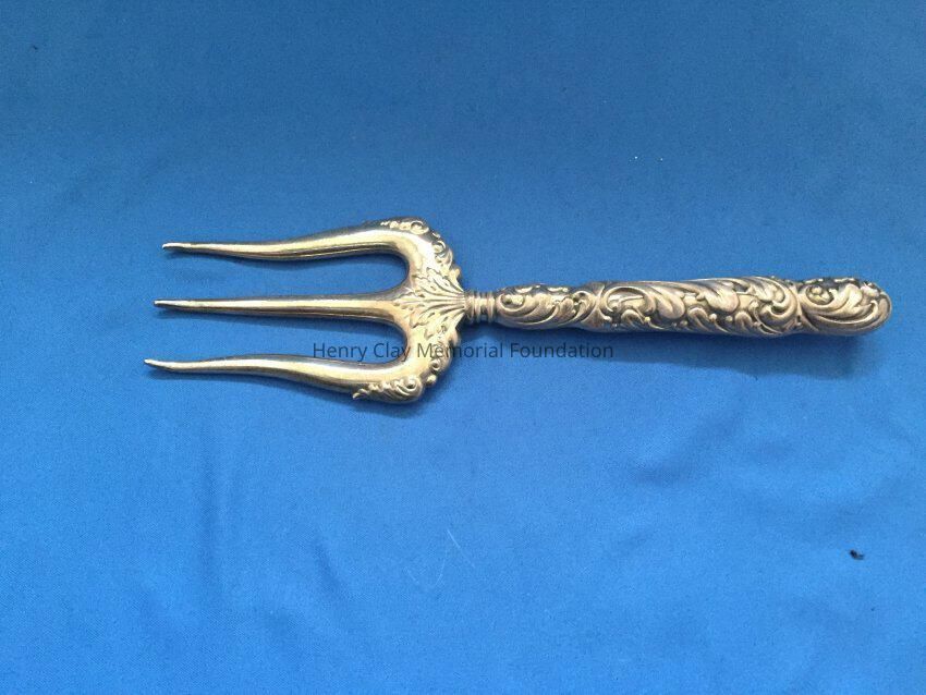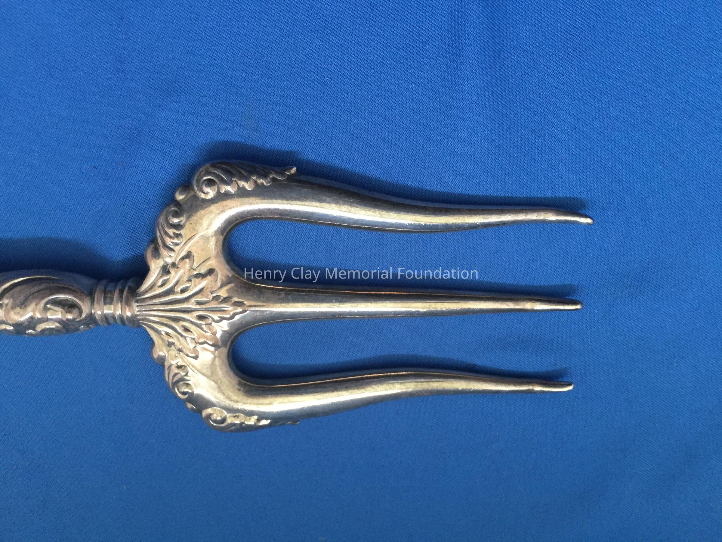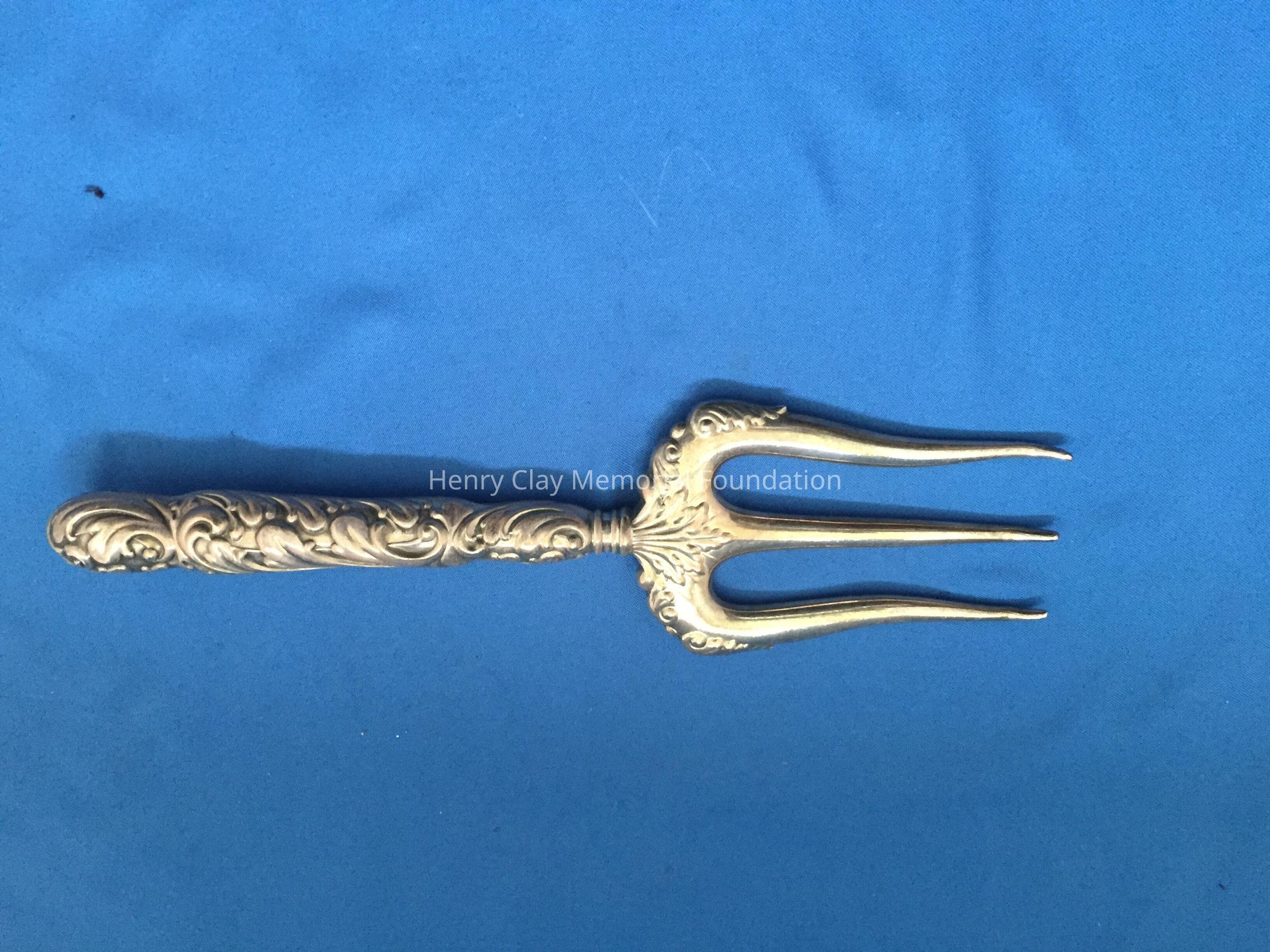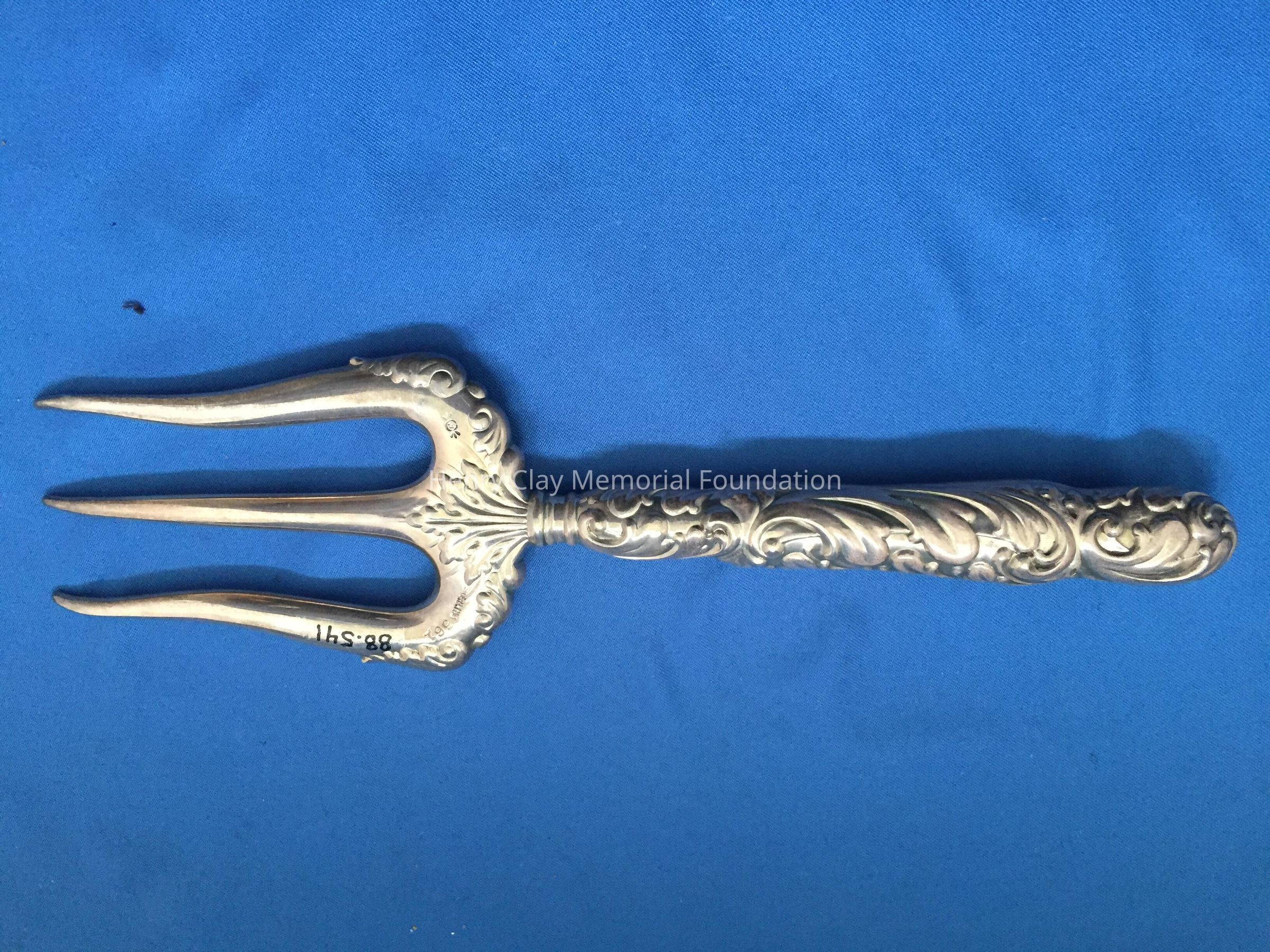 Hollow 3-prong fork. Prongs are slightly curved at tip. Handle is repousse. Stamped "Sterling 561".
