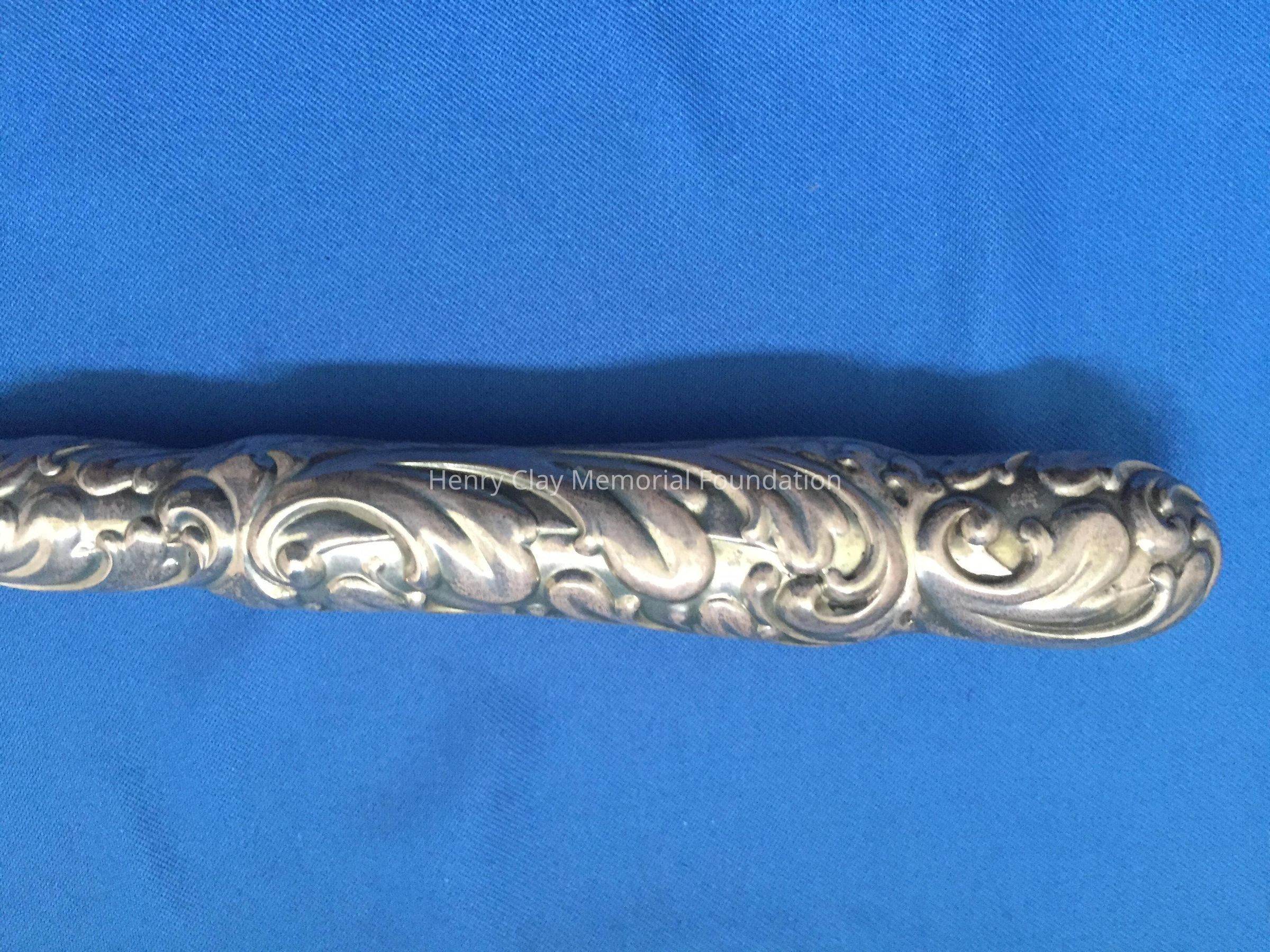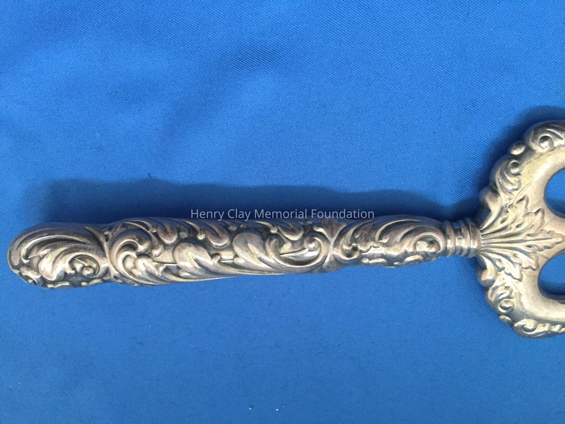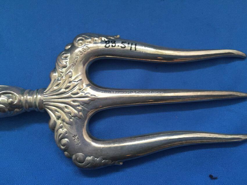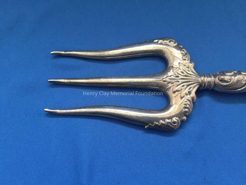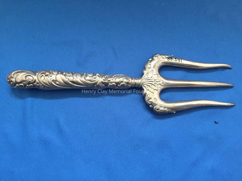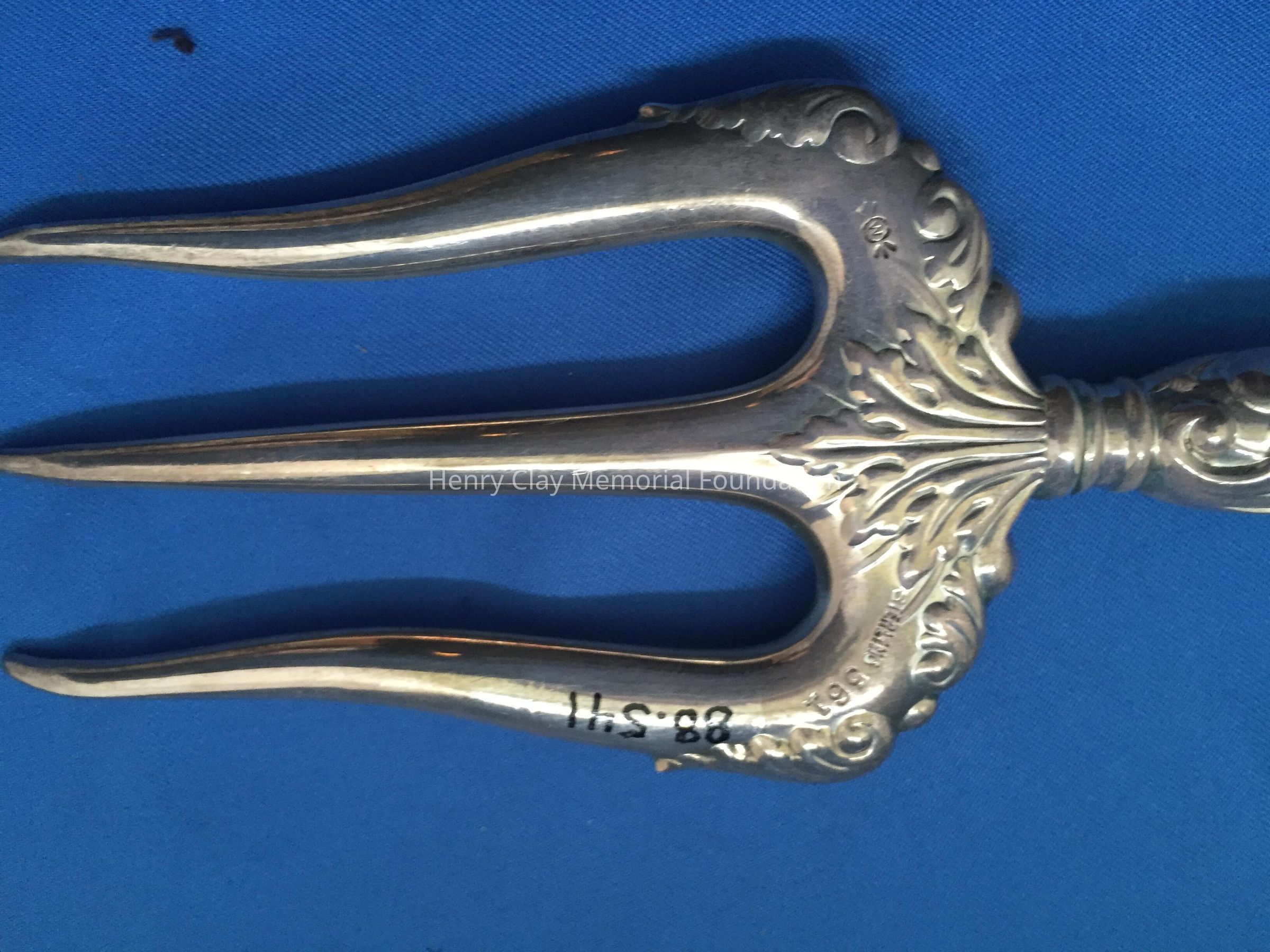 Hollow 3-prong fork. Prongs are slightly curved at tip. Handle is repousse. Stamped "Sterling 561".