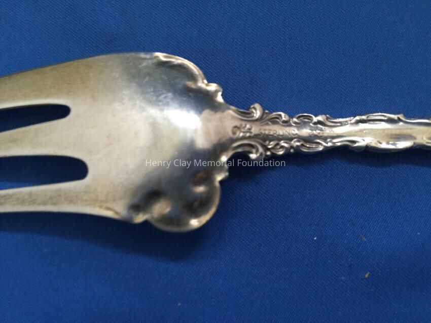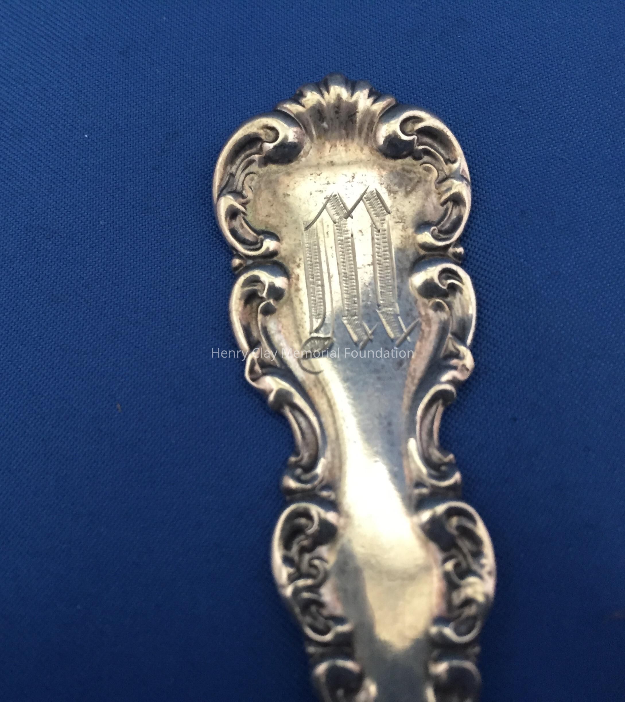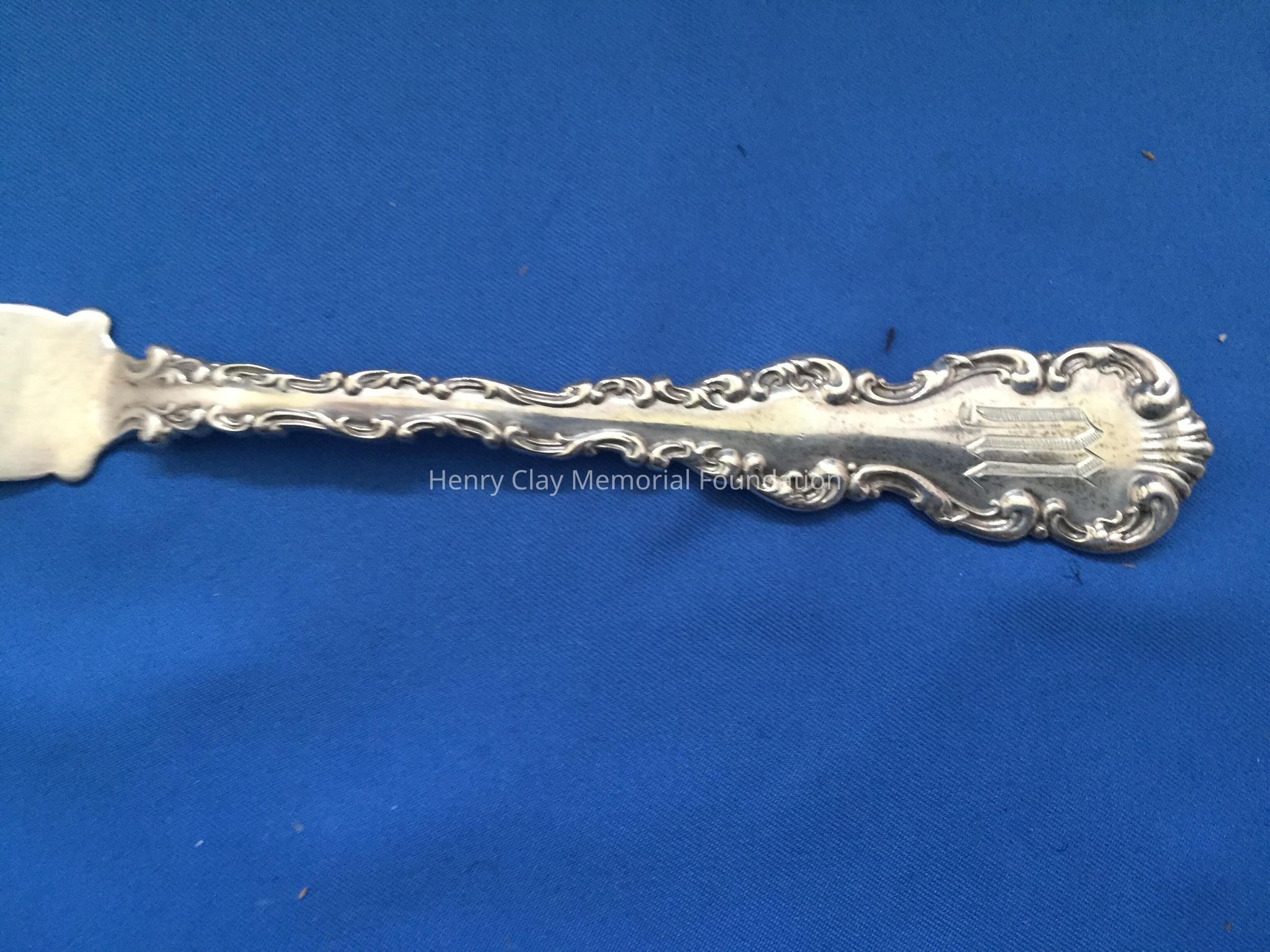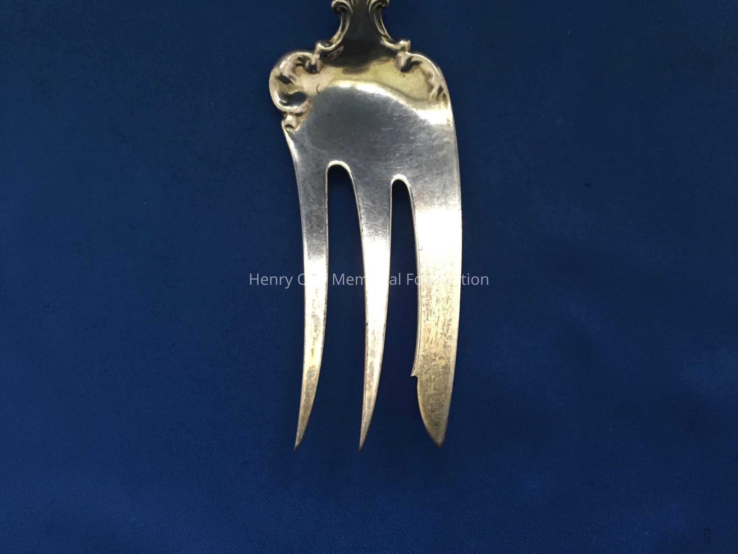 Pickle fork and knife set with monogram "M" at top front of handle and hallmark on the back.
