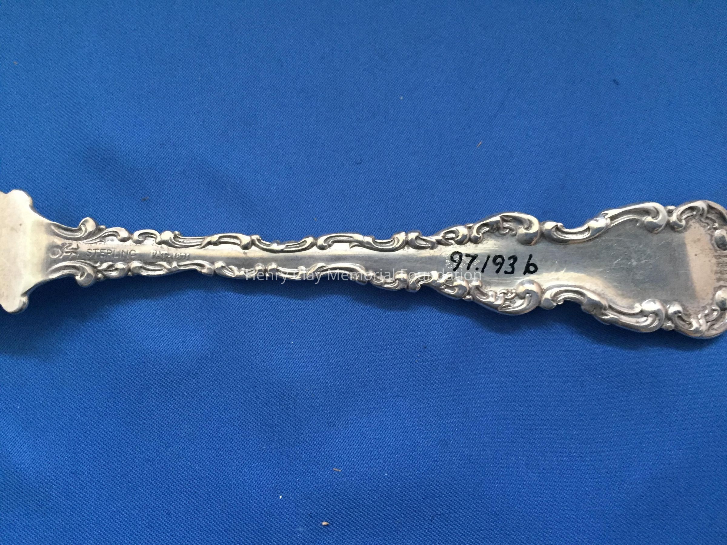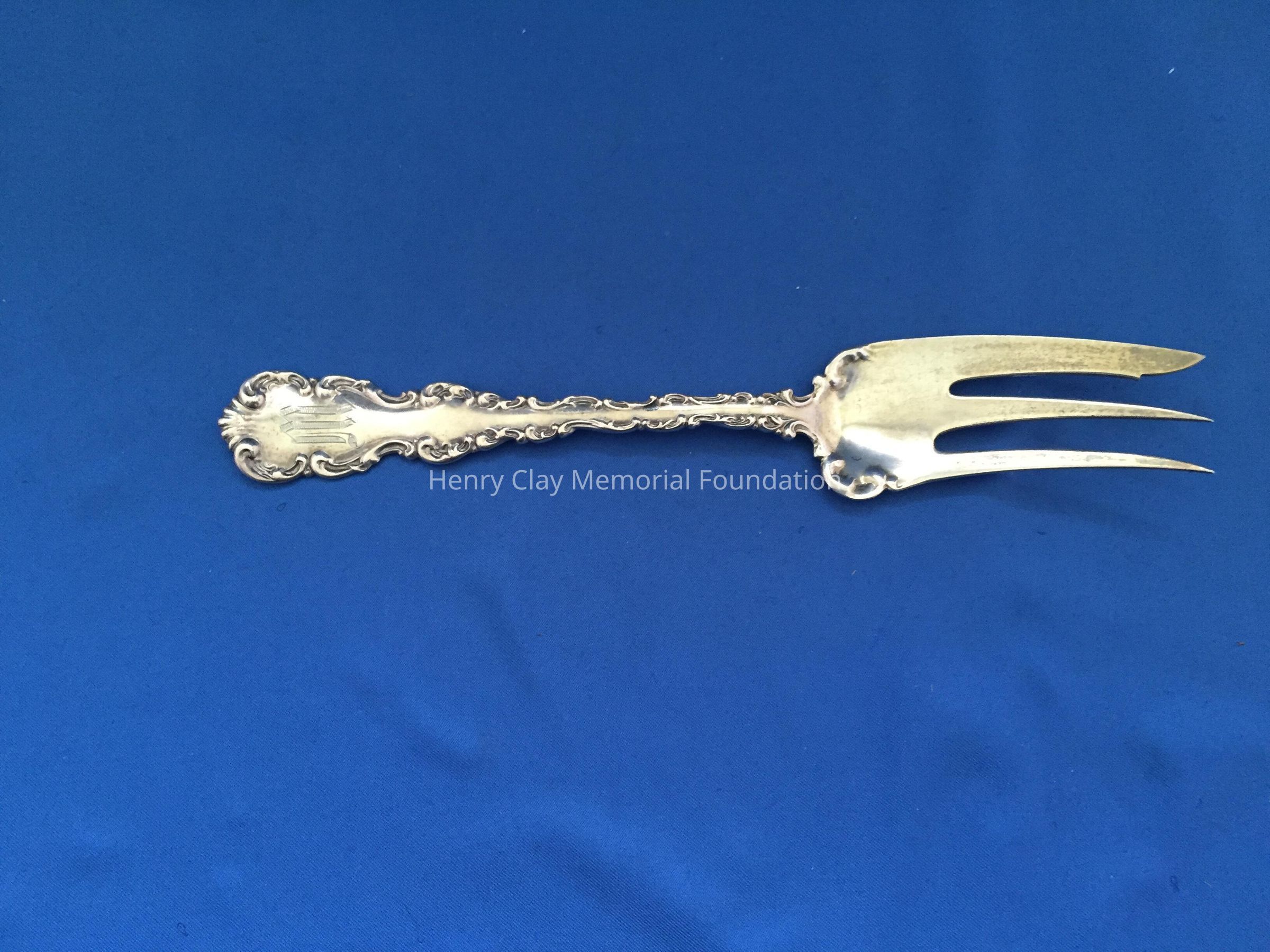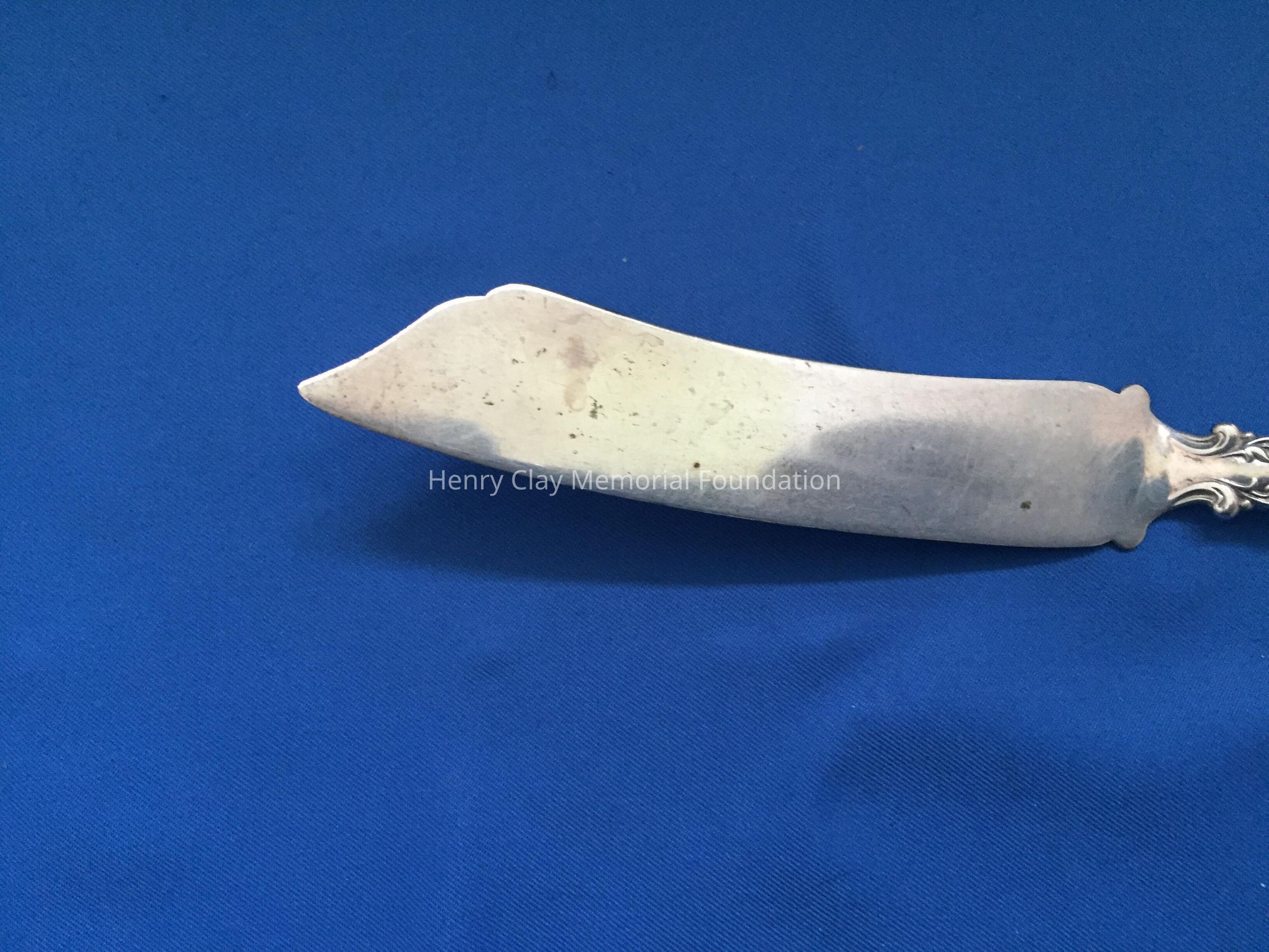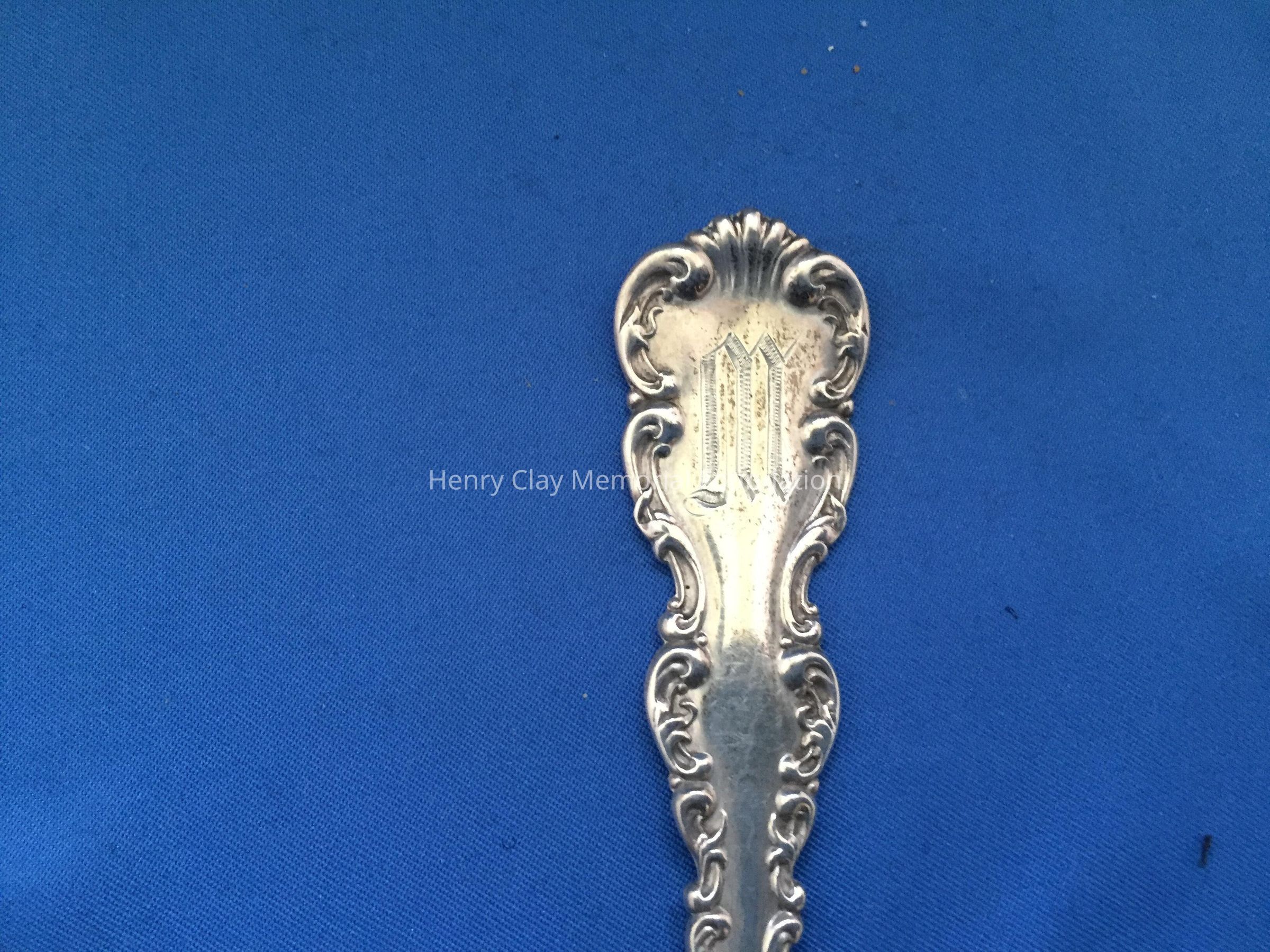 Pickle fork and knife set with monogram "M" at top front of handle and hallmark on the back.