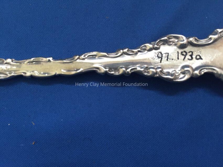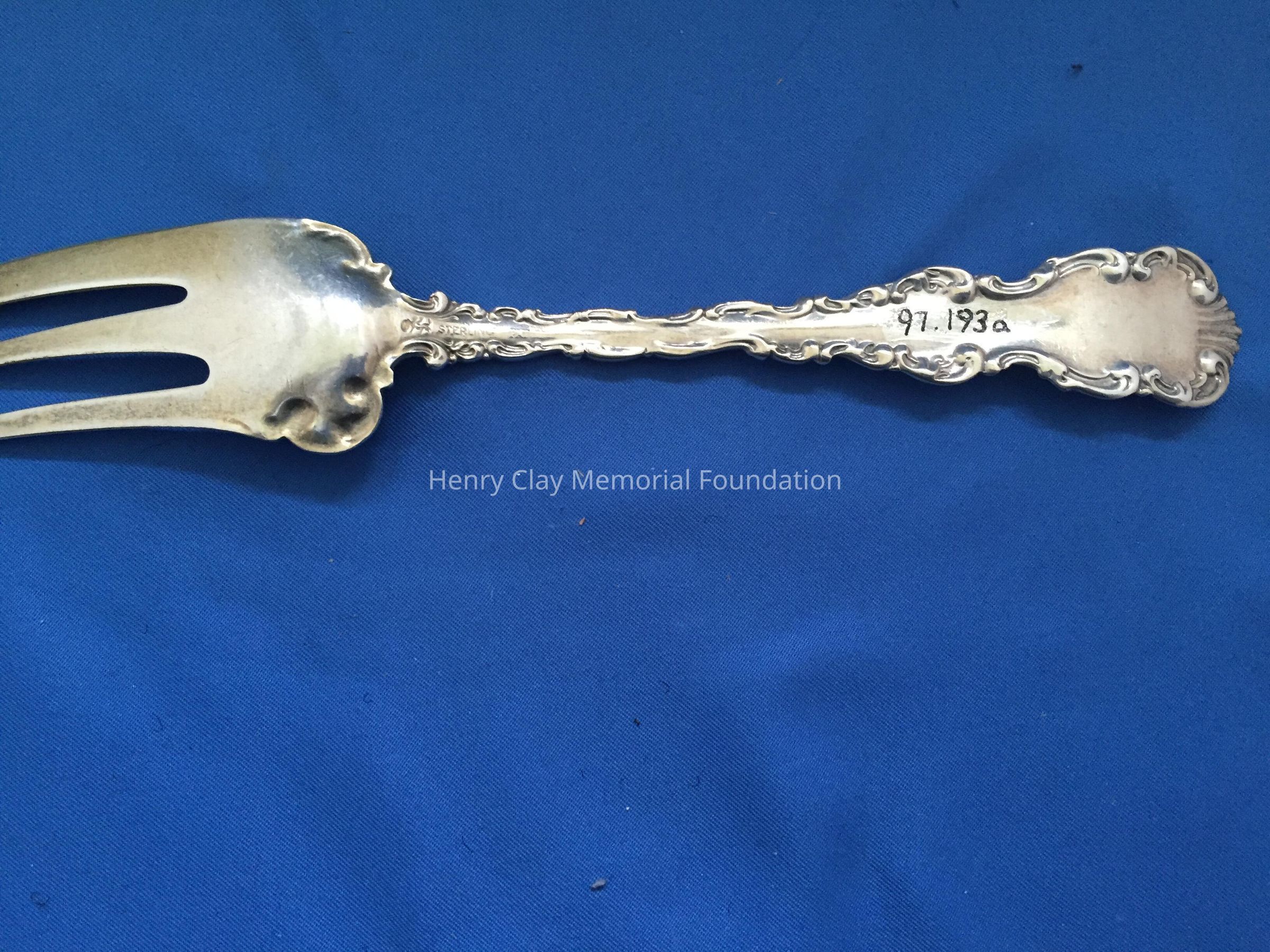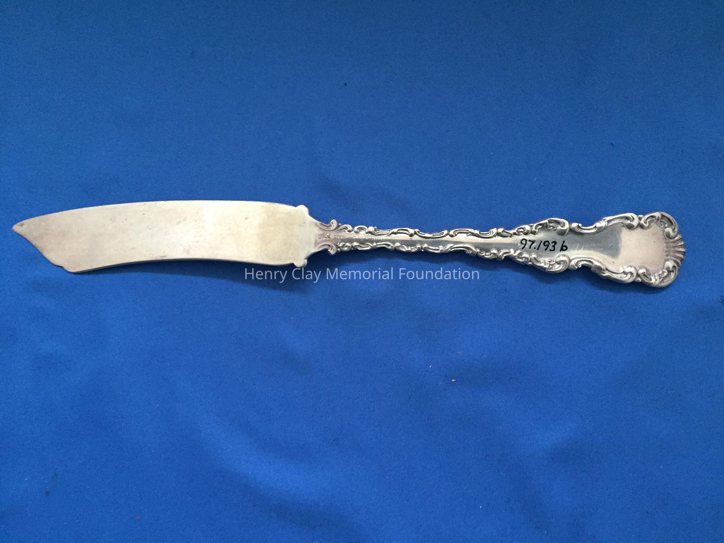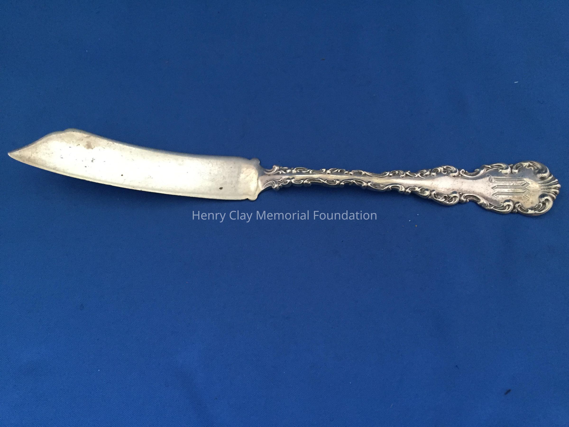 Pickle fork and knife set with monogram "M" at top front of handle and hallmark on the back.