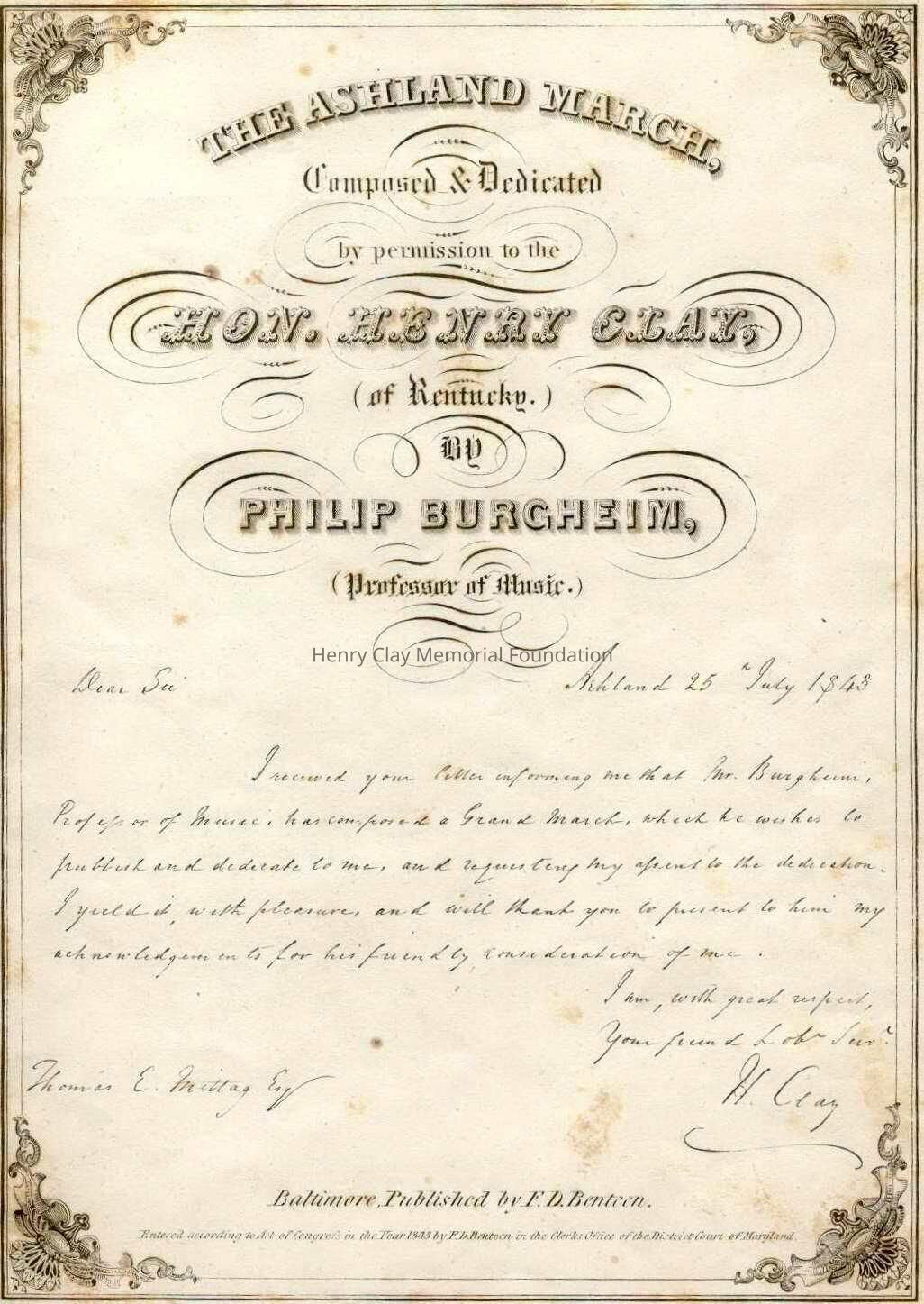 Sheet music for the Ashland March. Music consists of three bound pages printed front and back except for the last. Front has title and dedication to Hernry Clay. Piece was composed by Philip Burgheim, Professor of Music and printed by F.D. Benteen of Baltimore. Front also carries a printed copy of a letter written by Henry Clay to Mr. Burgheim's attorney expressing his appreciation and allowance of the dedication of the piece to him.Dimensions