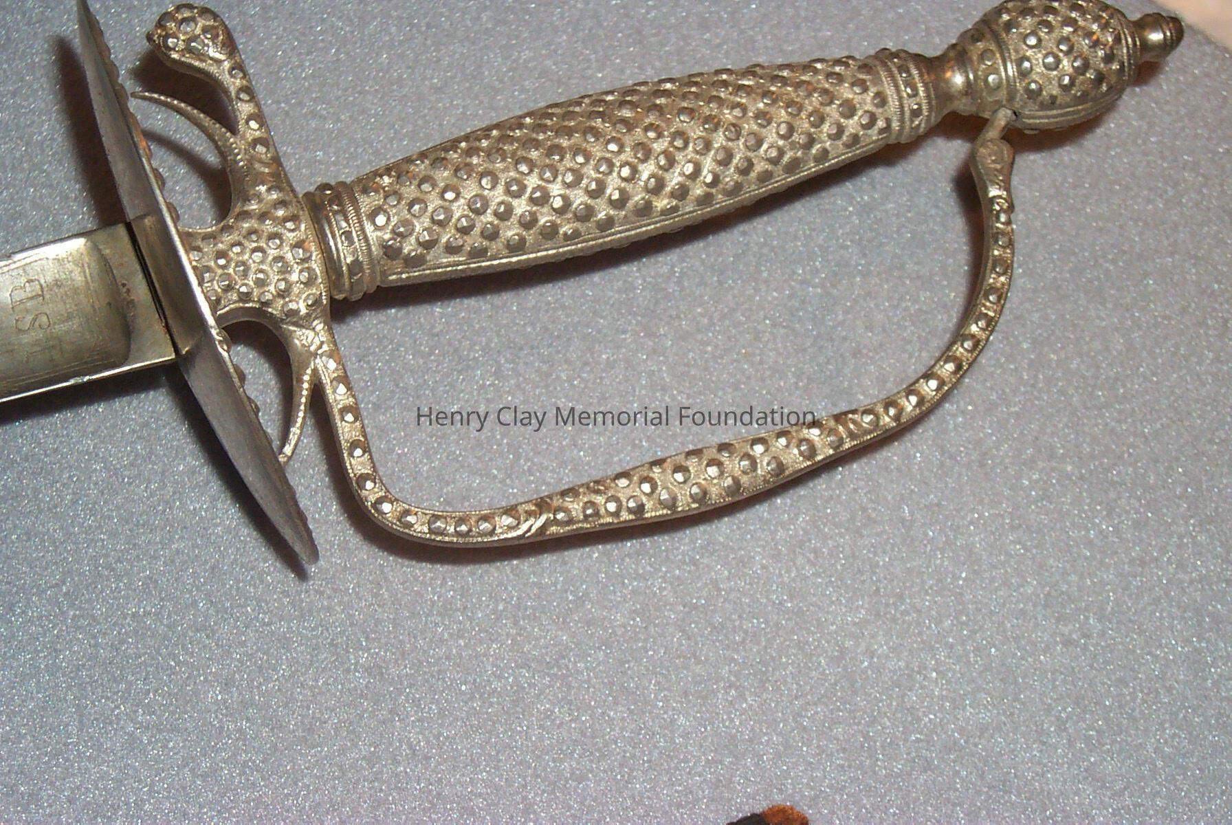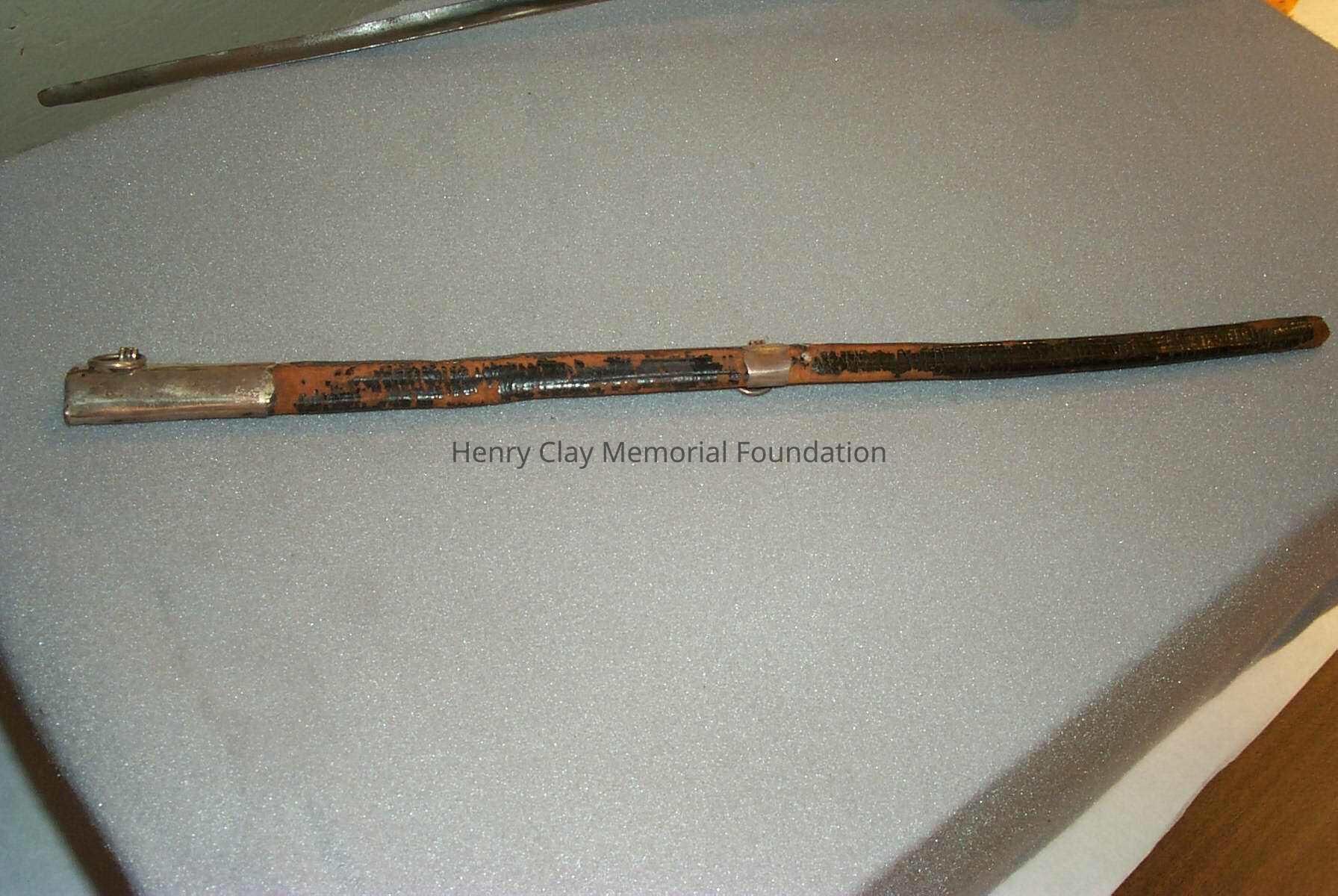 Smallsword with leather scabbard. Sword has silver pommel, handle, knucklebow, and bellguard. Pommel, knuclebow, and underside of bellguard are studded with applied silver studs. Knucklebow extends past handle to form quillion and has two finger loops. Top side of bellguard is etched with decorative scalloping. Sword blade is triangular and tapers towrad point. Blade has etching neat bellguard including box with initials ISB and floral designs. Blade appears to have been broken and rounded off. Scabbard is leather with silver fittings. Scabbard has silver rings for mounting. Scabbard appears to have been shortened to match blade.Dimensions