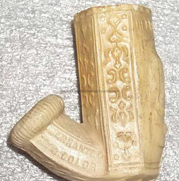One white ceramic pipe (bowl and neck only, no stem) bearing the likeness of Henry Clay on the front. Pipe bowl is hexagonal and stem is round. Front two panels of the bowl bear the image of Clay with his name above. The rest of the bowl is decorated with floral diapering. The bottom of the bowl and neck is covered with an acanthus-like leaf design. On one side of the neck are the words: "Warranted for Color." Neck terminates in serrated ring.Dimensions
