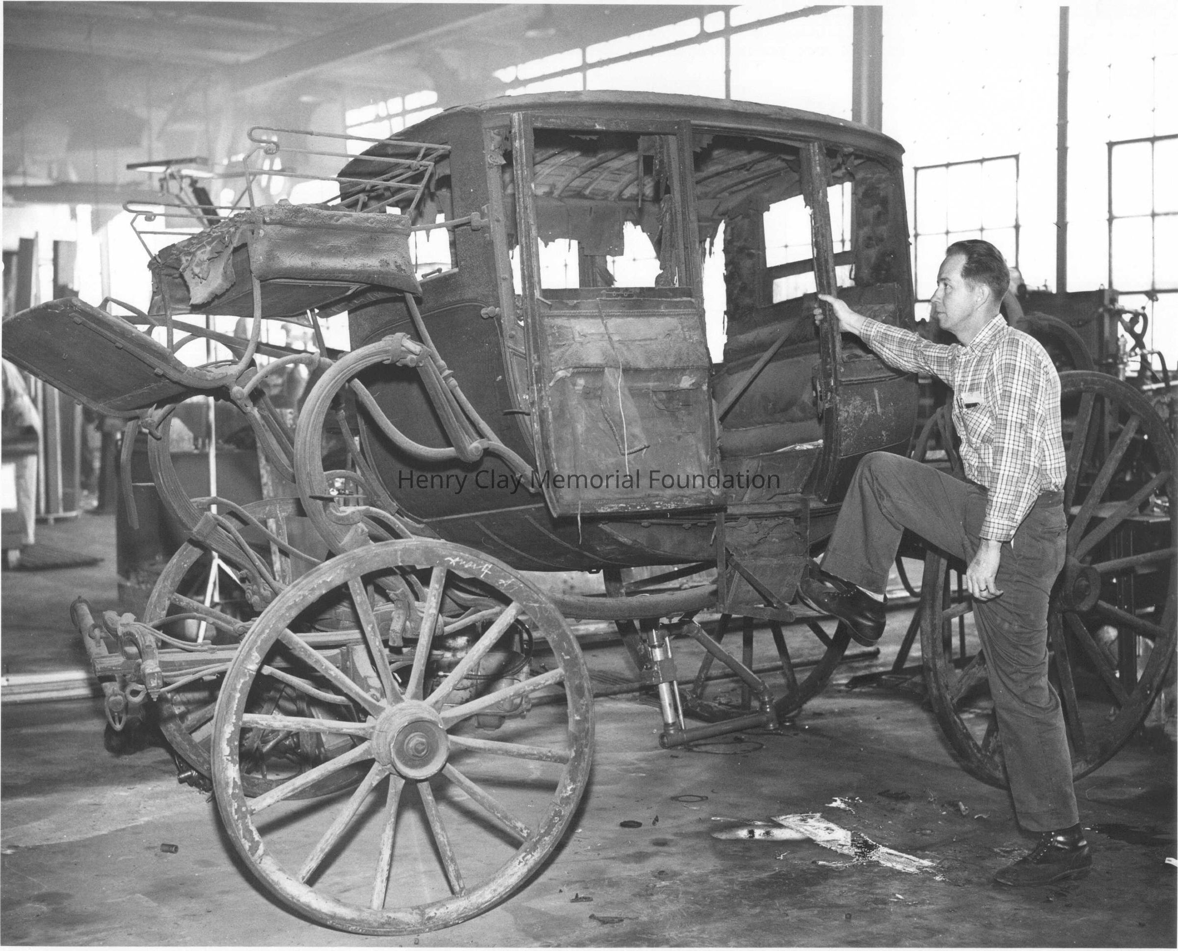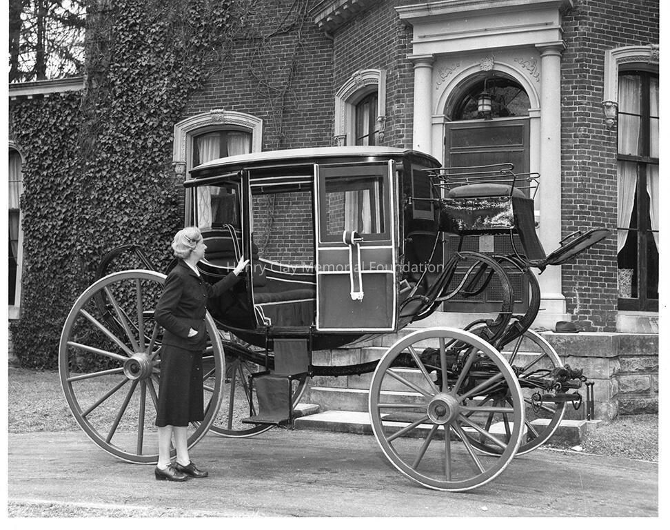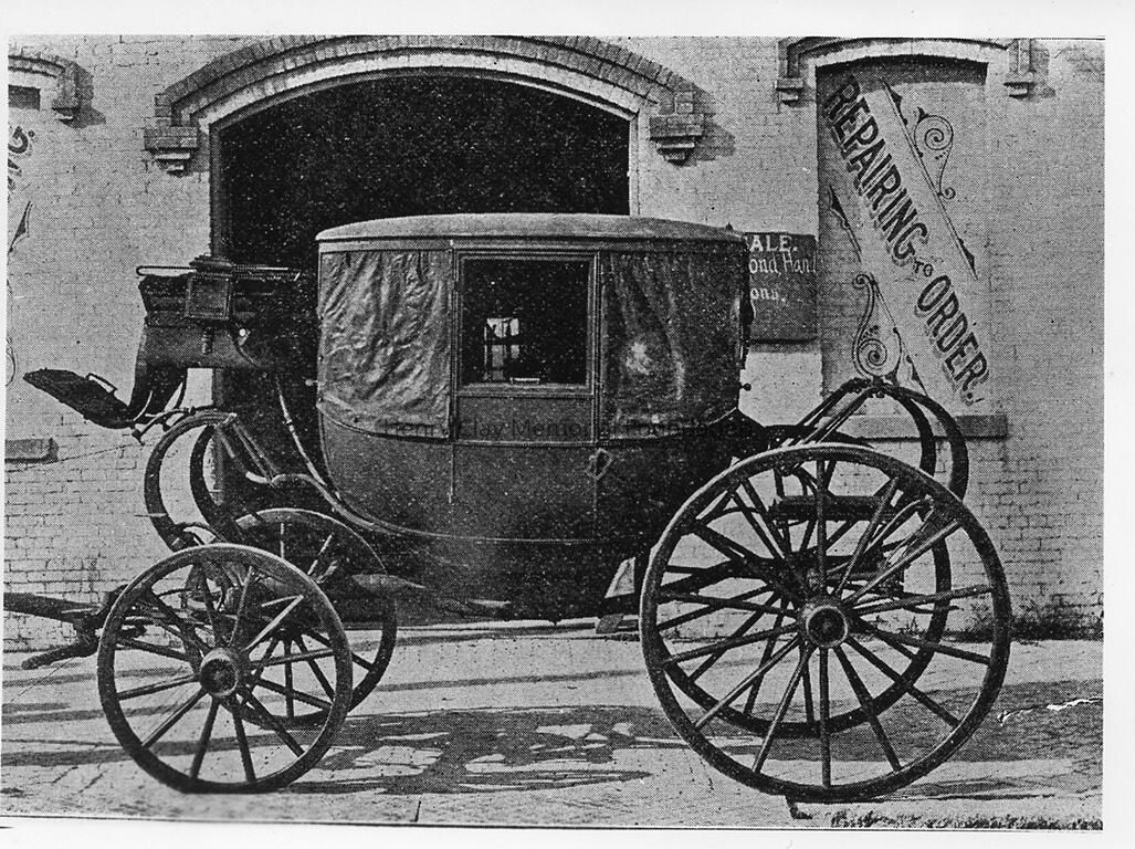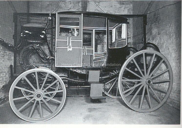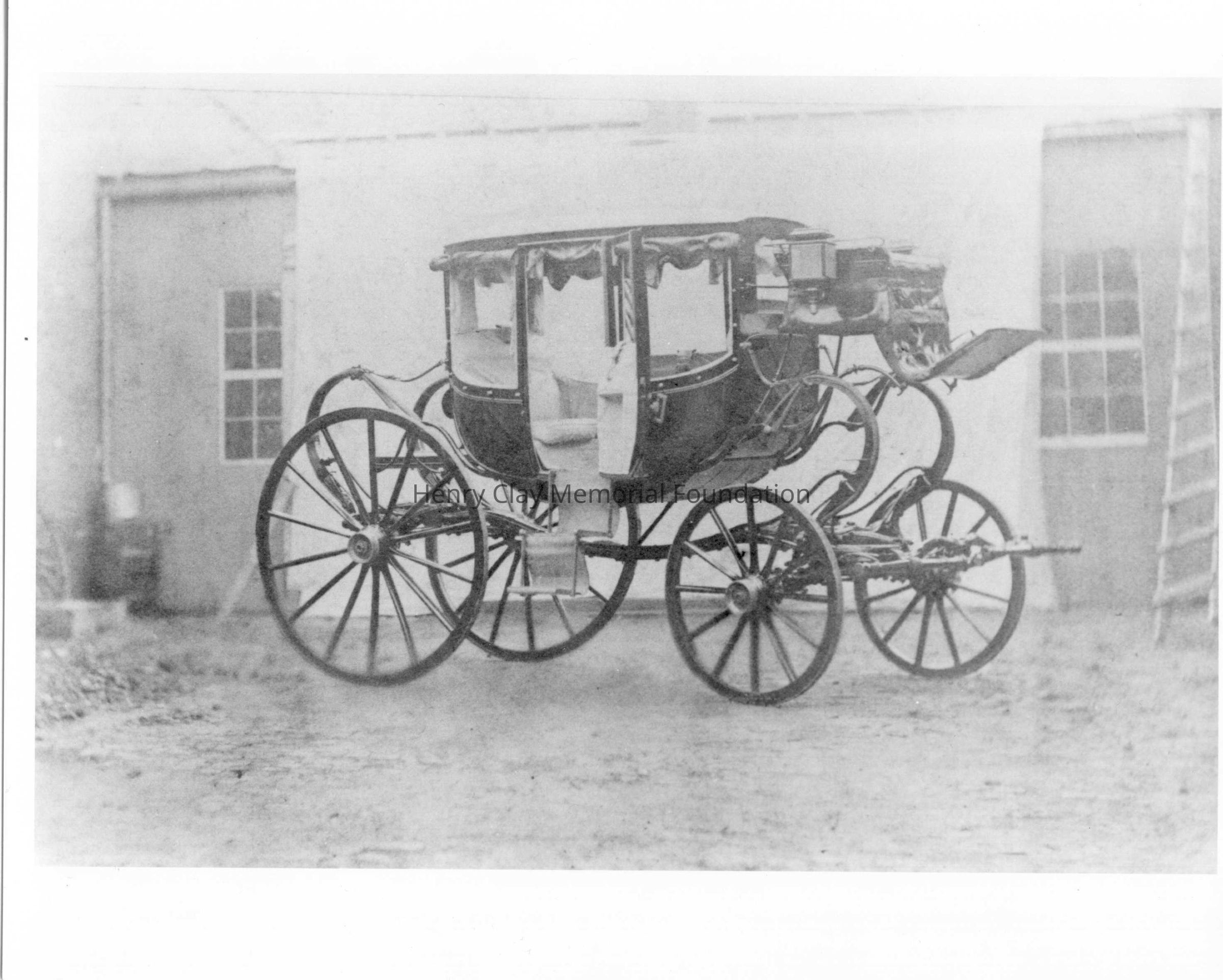 A black horse carriage. Carriage has four wheels and two axles. Body is wooden with leather walls that could be rolled up or left tied down. Coach has a door on each side with sliding windows. Driver's seat is mounted at front over front wheels. There is a luggage rack in rear of the carriage. Carriage is suspended from metal springs by leather straps.Dimensions