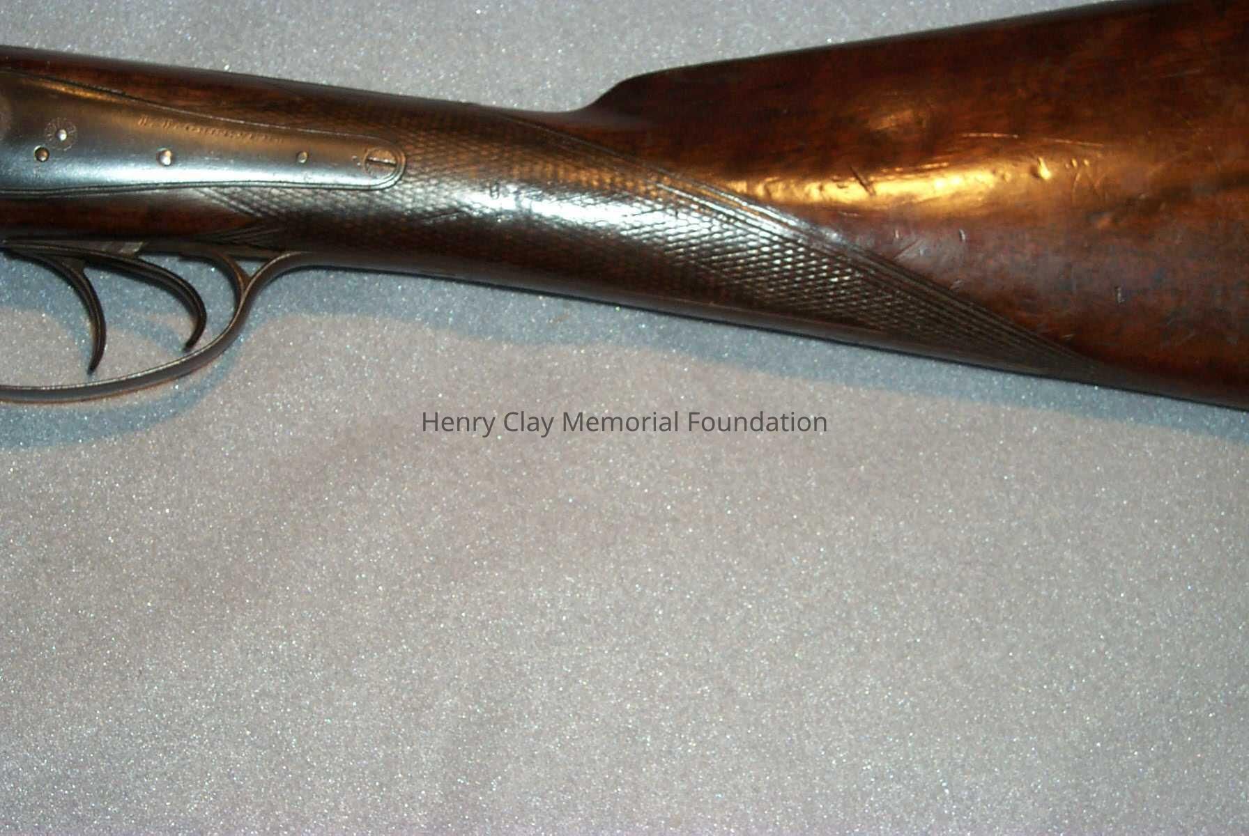 A 12 gauge double barrel pin firing shotgun made by W.W. Greener and Co. of Birmingham England. The gun has a walnut stock and laminated steel barrels. The hammers, triggers, plates, and guards are all steel. The gun has a steel buttplate. The hammers are mounted on steel plates engraved with "W.W. Greener." Beneath right hammer is lever to open chambers for loading and unloading. Gun has steel trigger guard and two triggers. Barrels are laminated steel and are held together with steel rail that is stamped "William Greener Inventor of Laminated Steel." Wooden piece under barrels has brass pin that slides out to release barrels and dismantel gun into three pieces. Barrels underneath removable wooden piece are stamped "patent 13," with serial number, "11397," symbol of two pikes crossed over crown, symbol of elephant, and intials "CW." The plate that connects the barrels to the stock is also stamped with the serial number and crossed pike symbol.Dimensions