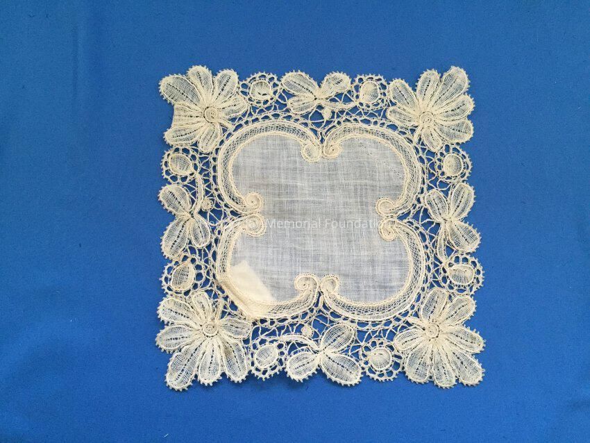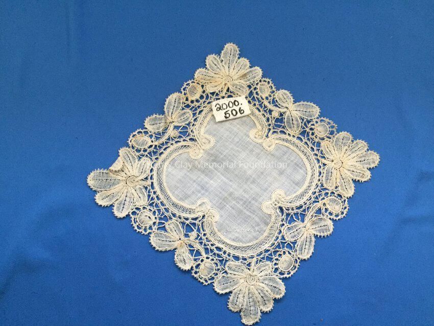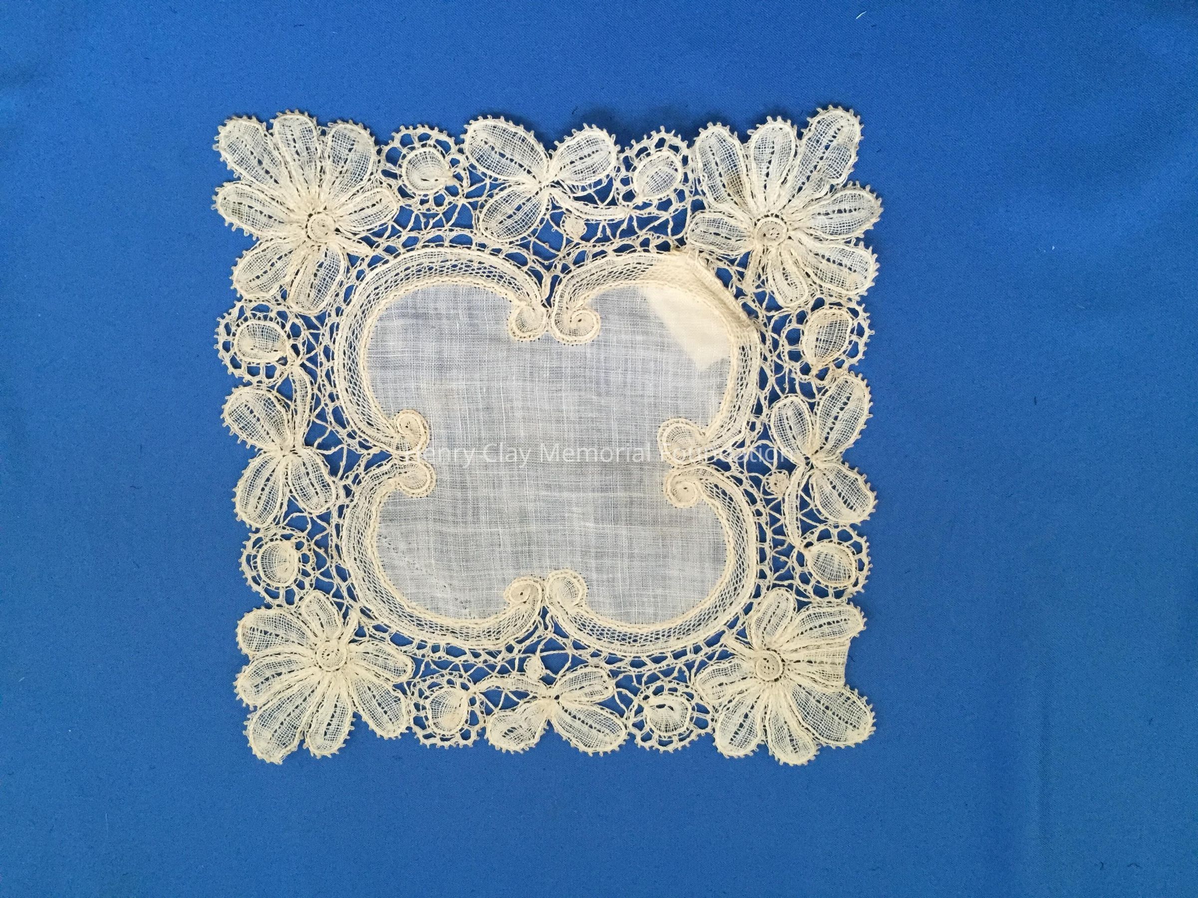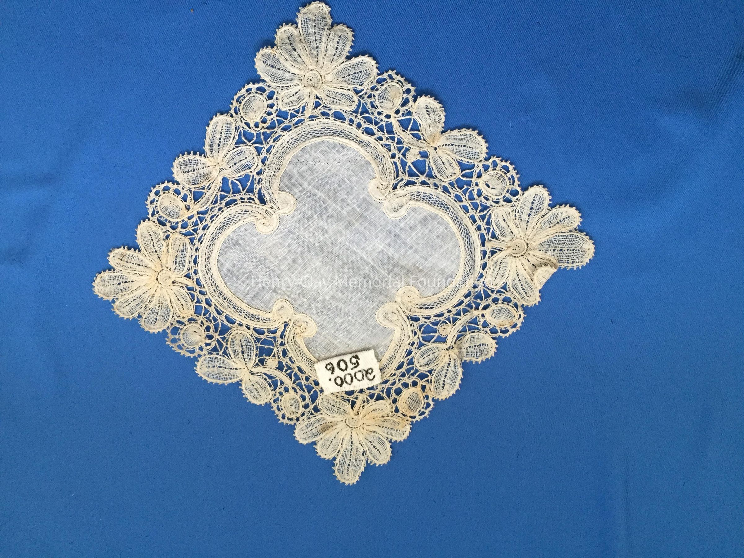 Off-white doily with clover center. Flower border with larger flowers with petal in each corner then connected to smaller flowers and petals by netting. Linen center outlined by heavy, tight threads.Material