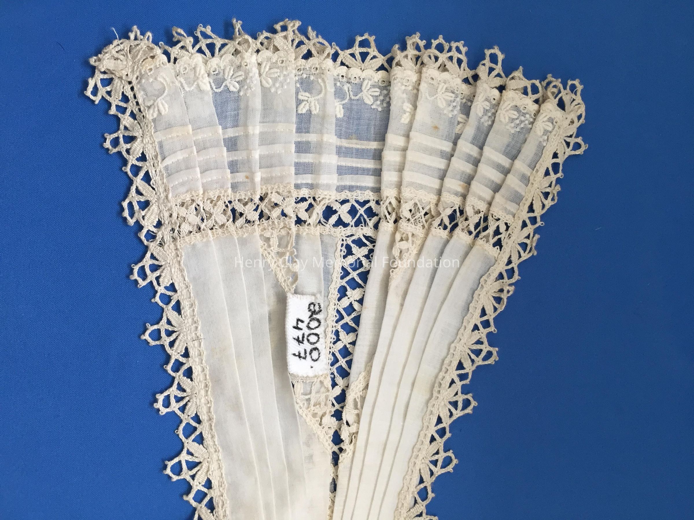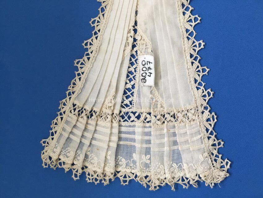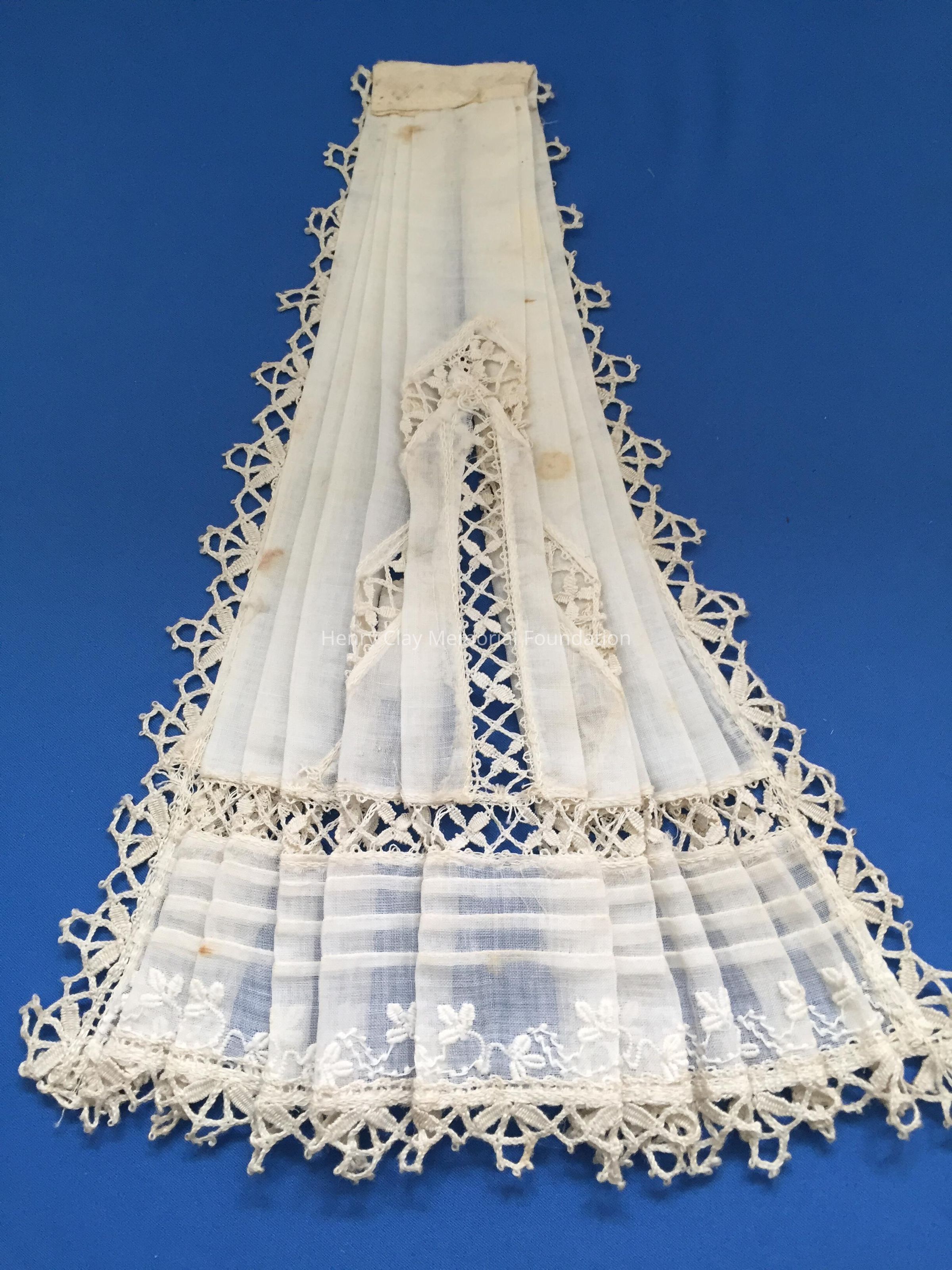 This is a white linen jabot. It is gathered and pleated so that it is wider at the bottom and thinner at the top. It forms an elongated wedge. It has cutwork lace edge along the sides and base. In the center there is lace. It is perpendicular to another piece of lace that goes across the base with pleats. It also has embroidered work on the bottom.Dimensions