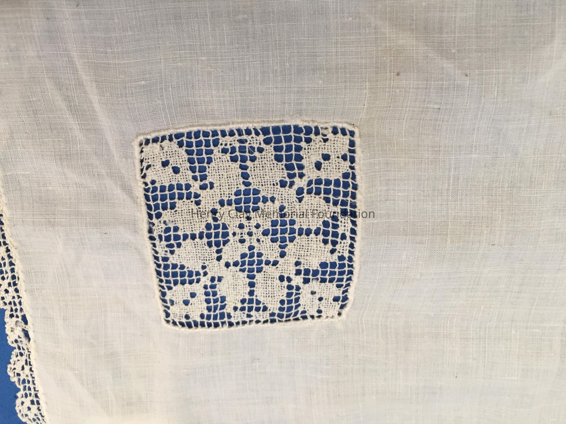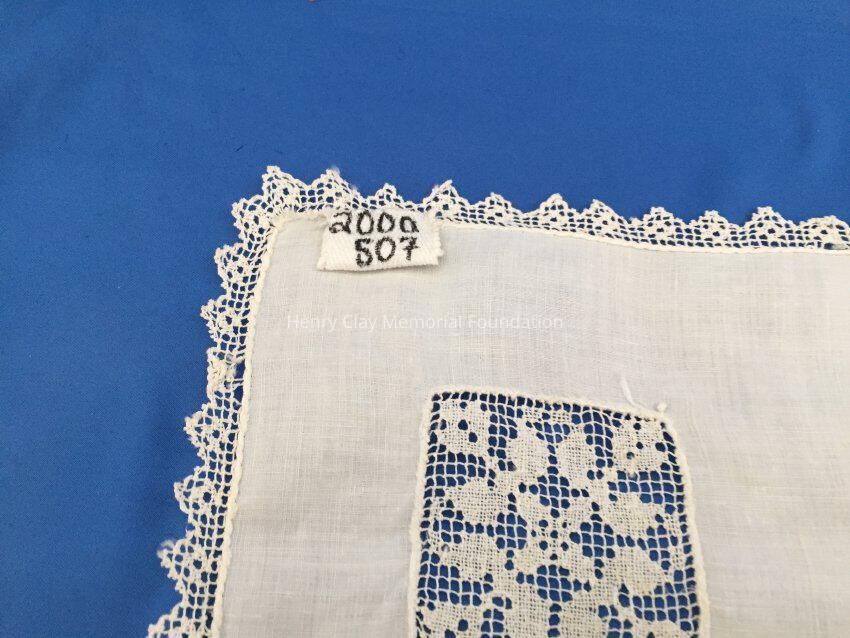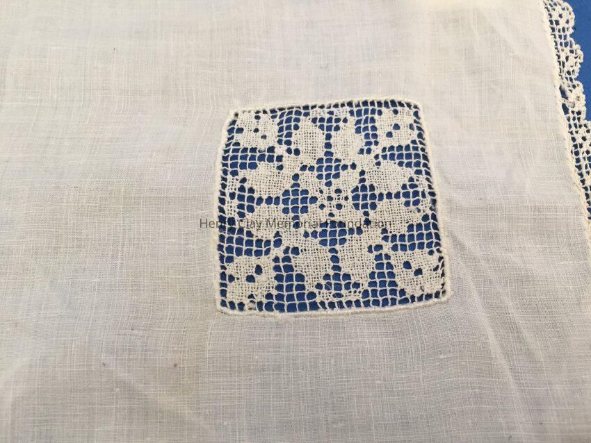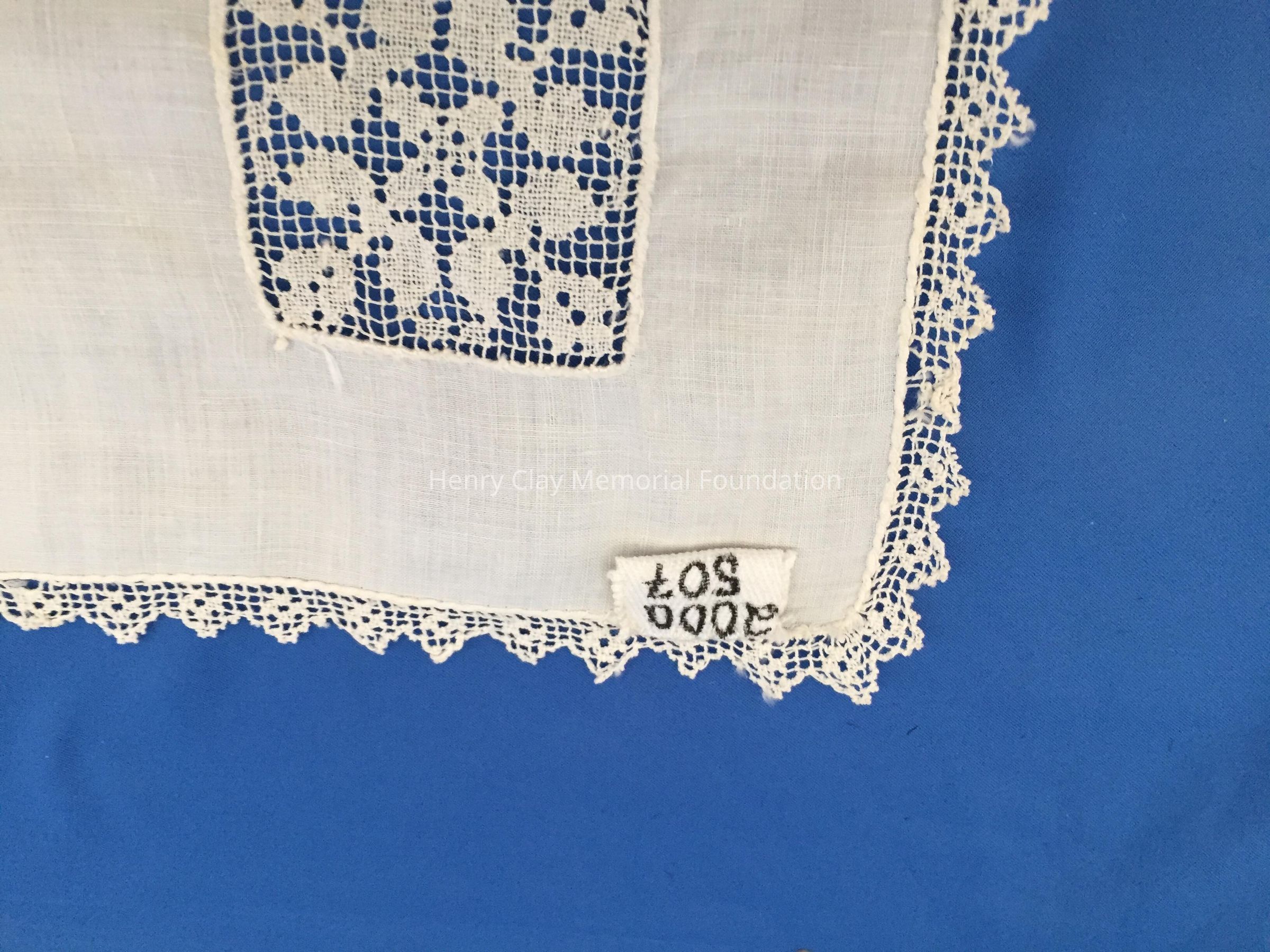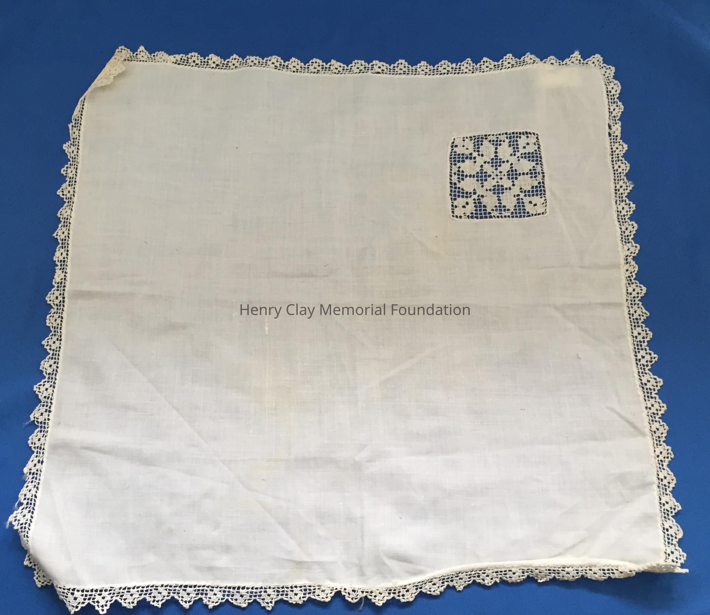 This is a off-white handkerchief made of cotton. Around the entire edge is a cotton lace border. In one corner is an area where the cotton fabric has been replaced with a small, square lace design.Dimensions