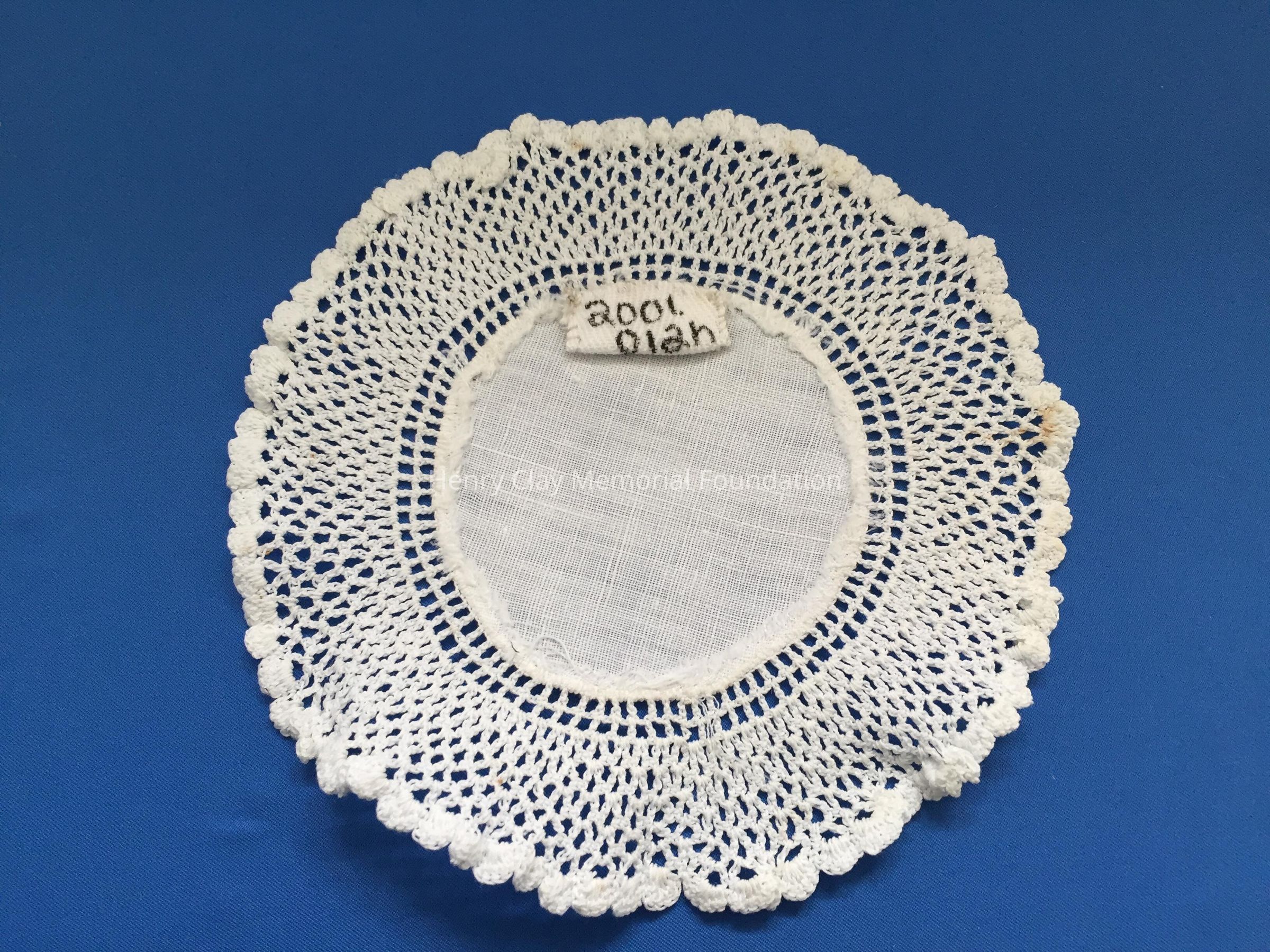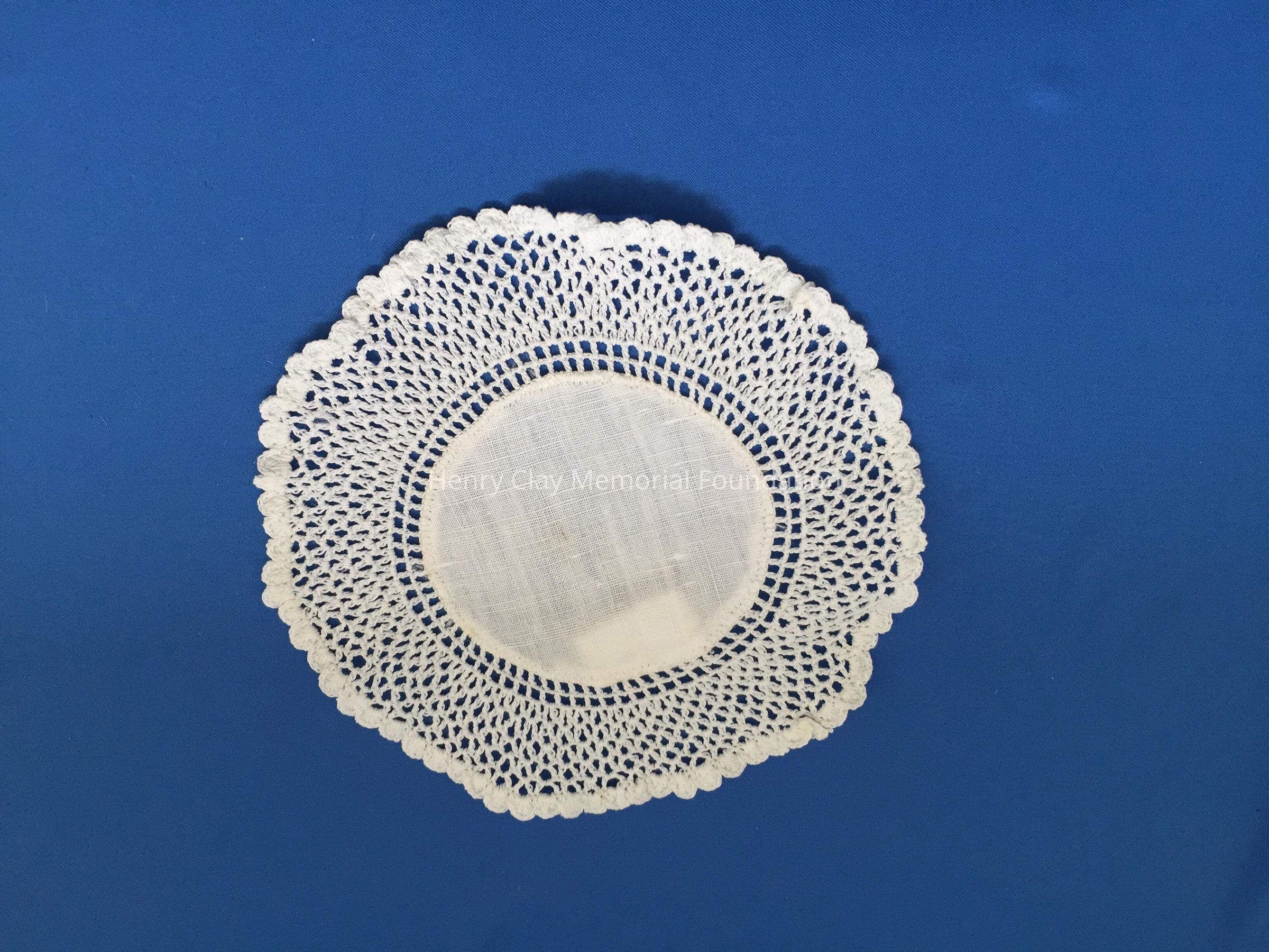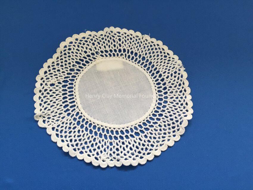 These are small, round, off-white doilies. The center piece is linen with looped mesh lace all around. These are likely used to protect furniture from cold and hot drinks.Dimensions