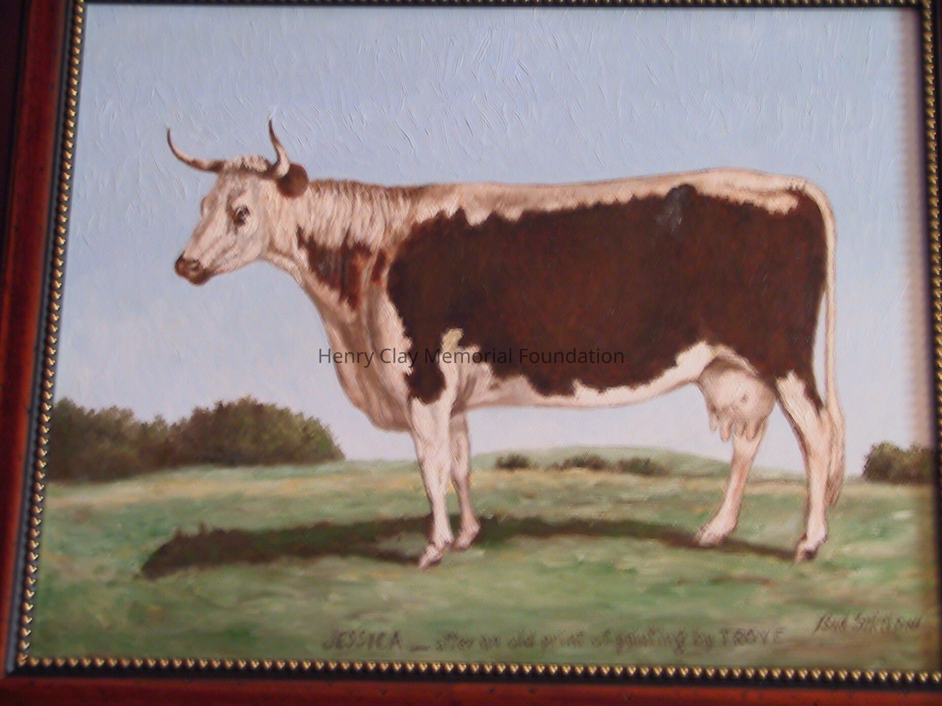 Painting of white cow with brown markings standing in a field.