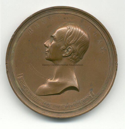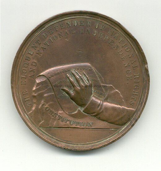 A commemorative medal made to honor Henry Clay. Side one has a band around the edge with a bust of Henry Clay in the center. Beneath the bust is a ribbon with the words: "Born April 12, 1877, Died June 29, 1852." Side two has a rock with the word " Constitution" on it and a scroll with the words "American System South American Nations Compromises" on it. On top of the paper is a hand and arm. Above the rock is the inscription: "The Eloquent Defender of National Rights and National Independence."