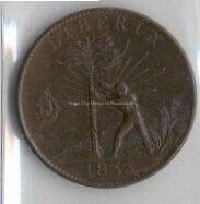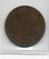 Liberian One Cent Piece. Shows a man reaching for tree on a shore with ship sailing into sunset and date '1833' at bottom. Reverse has the words "American Colonization Society One Cent" around the edges and "Founded A.D. 1816" at center.Material