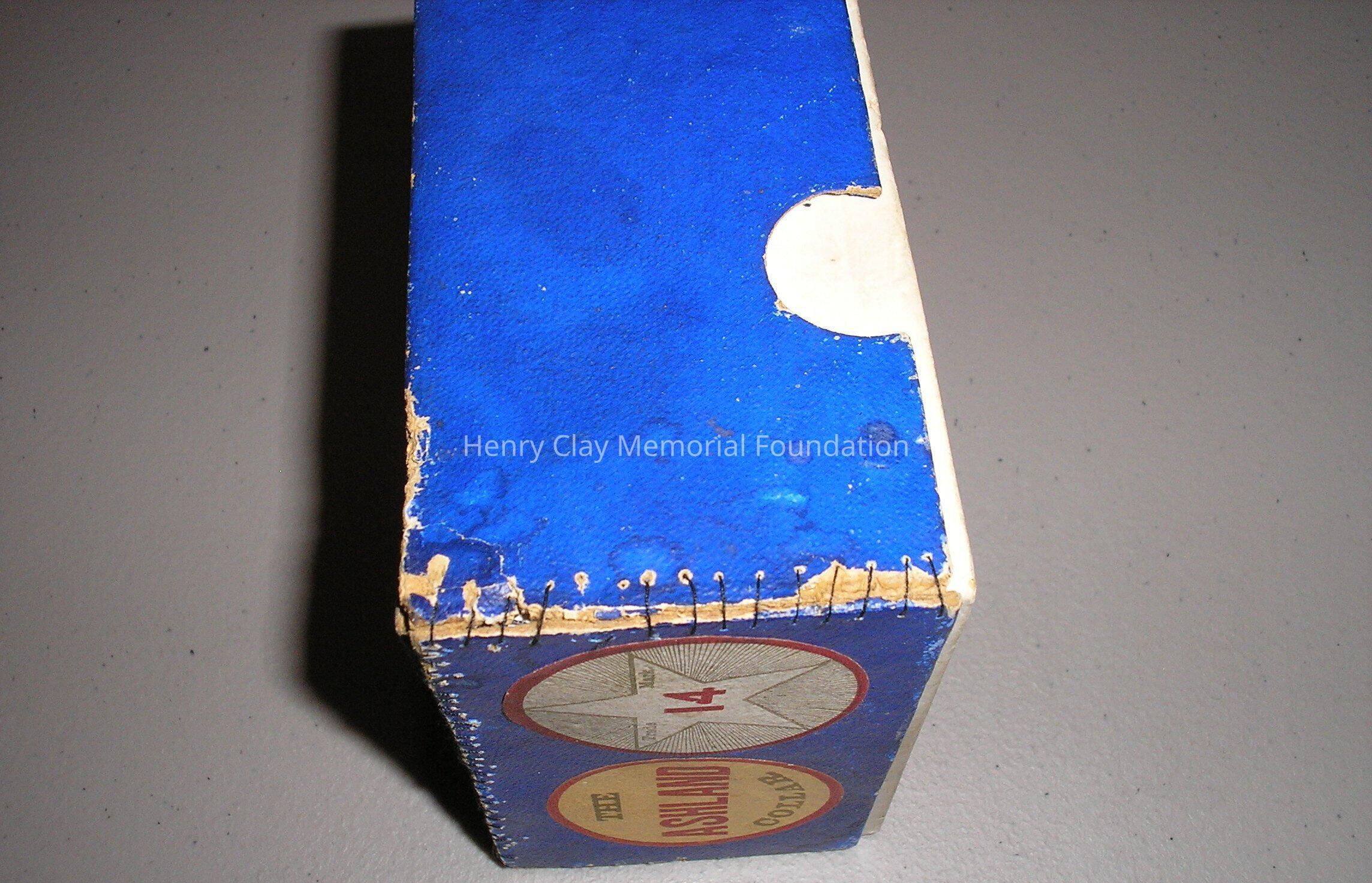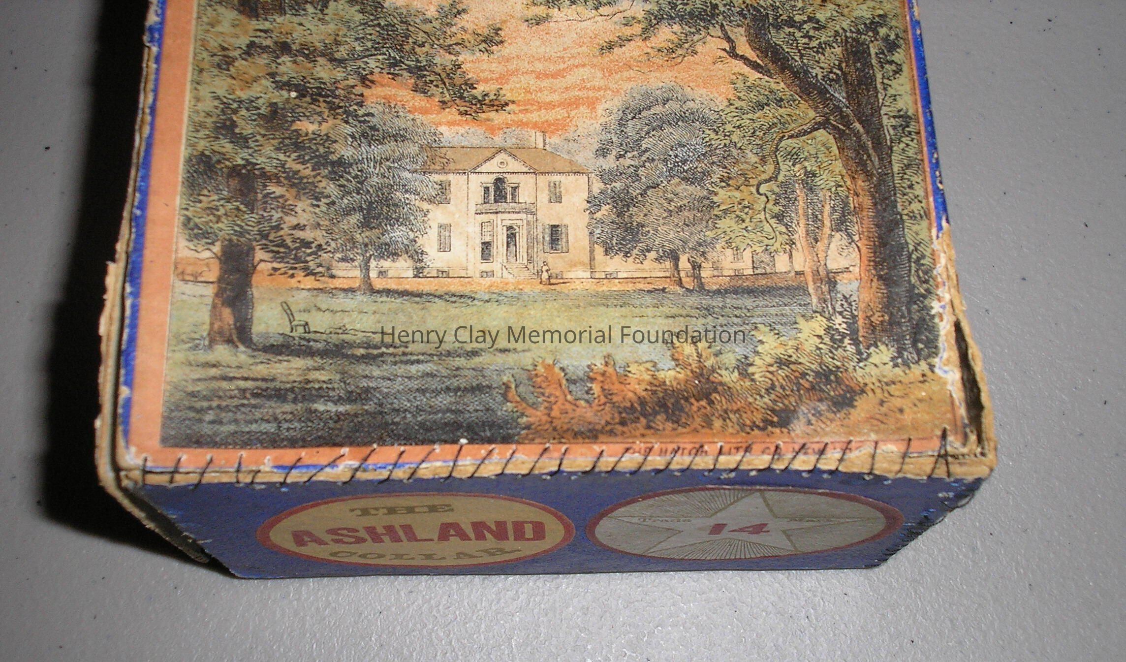 A cardboard collar box for the Ashland Collar with a picture of Ashland on top. Box lid lifts off and is sewn together on two sides. Another side of the top is coming off and corners are worn. Top reads, "Henry Clay's Old Homestead" and side has two circles with, "The Ashland Collar" and, "Trade Mark 14" inscribed on them.Dimensions