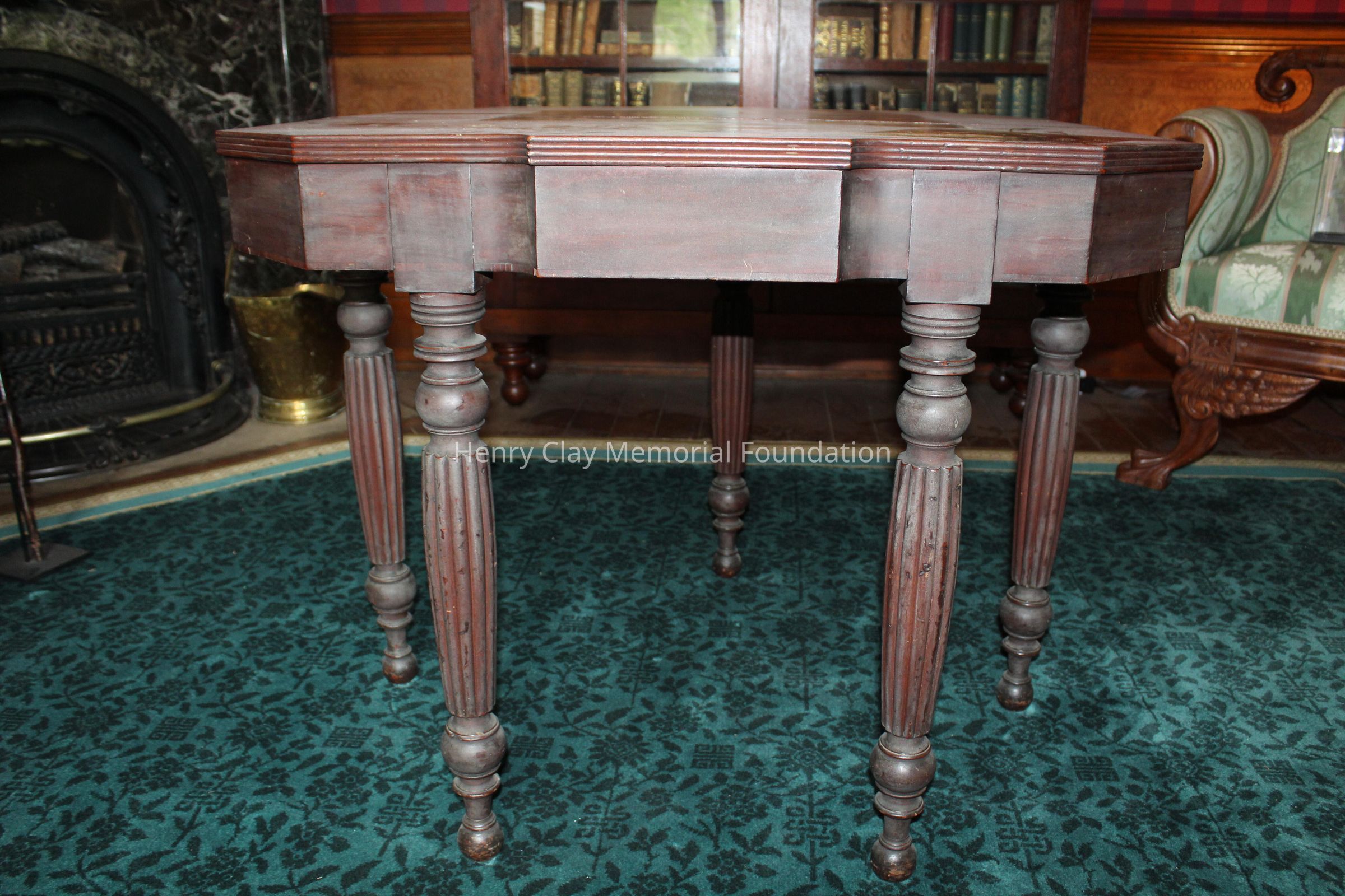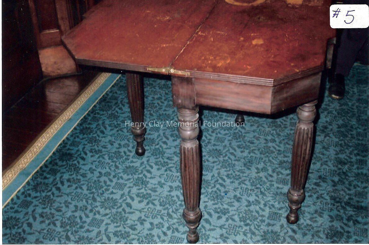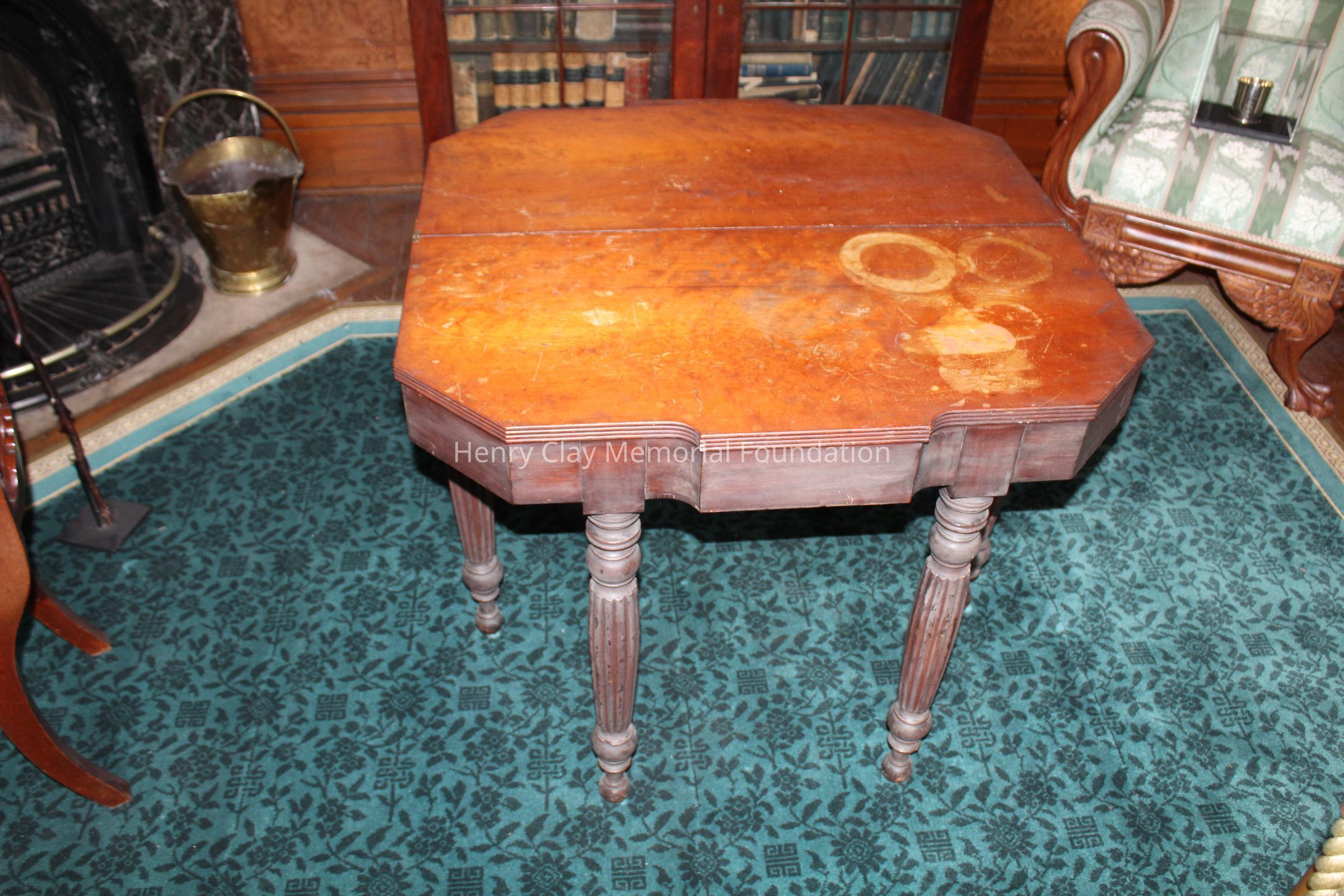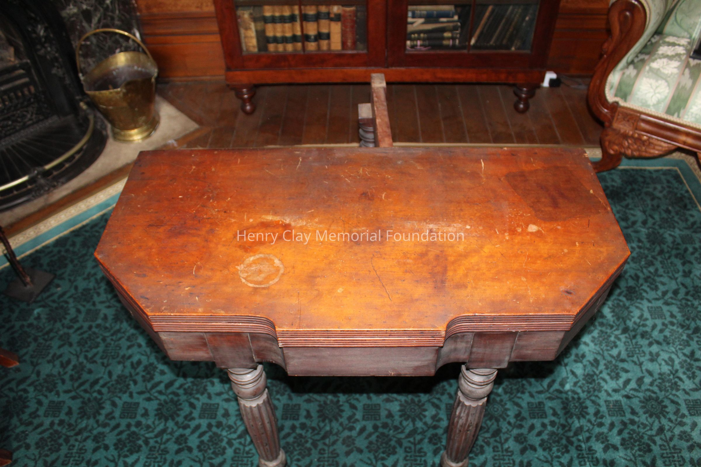 Drop leaf card table (Empire) with rectangular top. Front has block design. Legs are turned at the top, reeded in the middle, and have ball feet. There are 4 fixed legs and one gate leg that swings out to hold the top. Edge of top is ribbed.