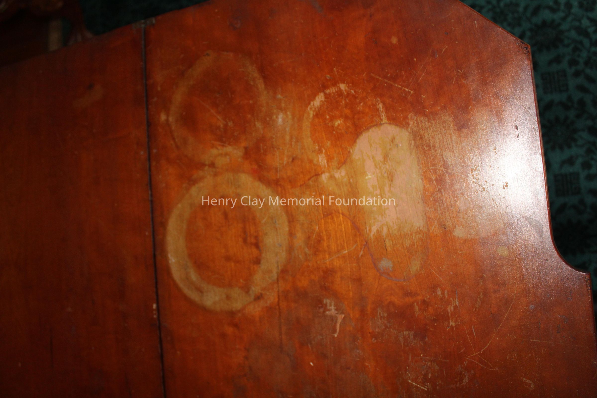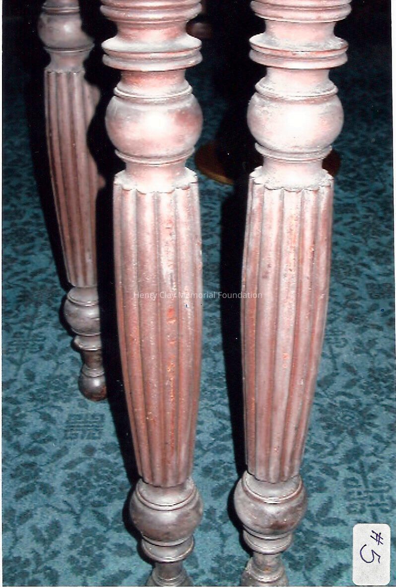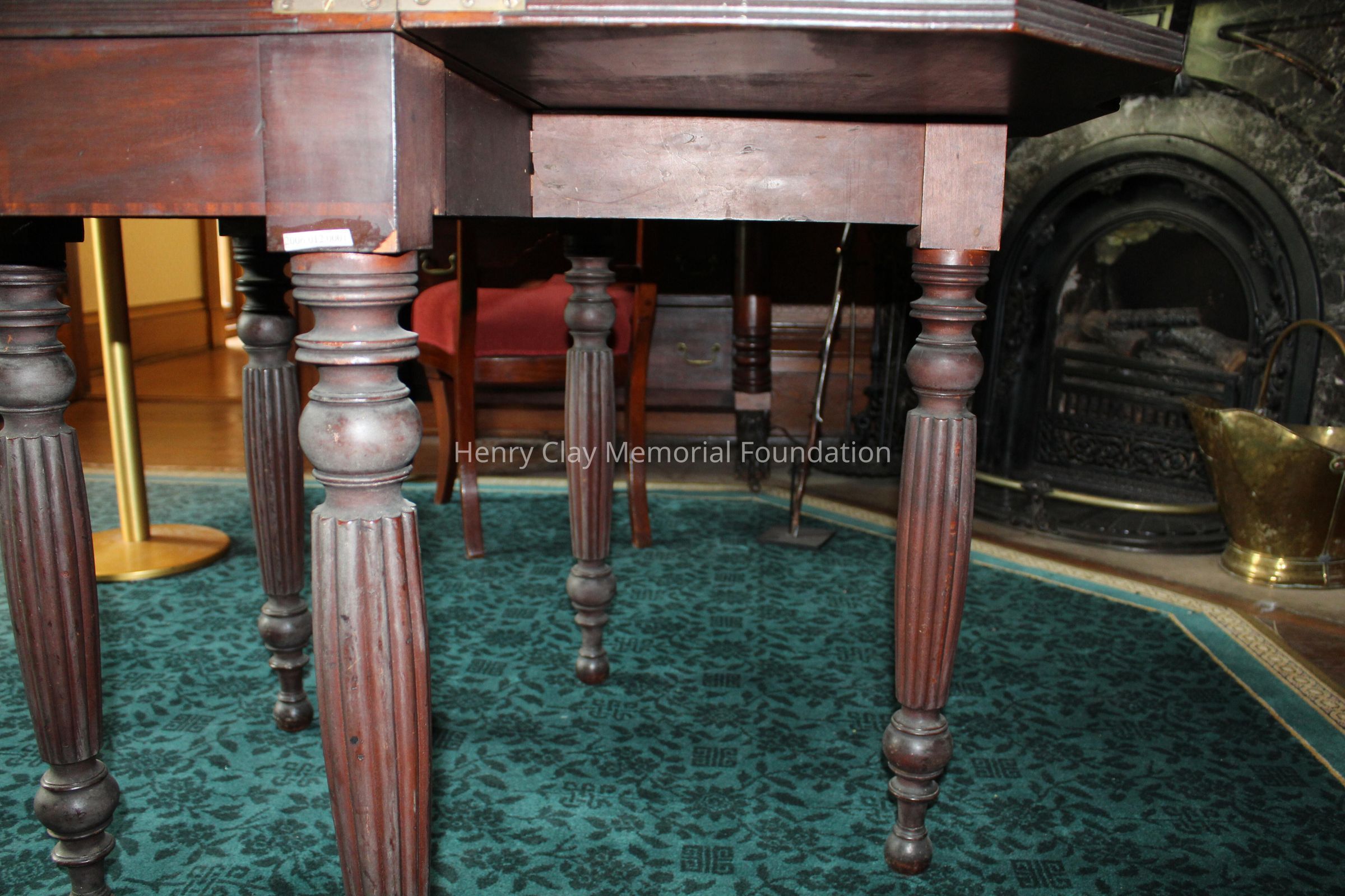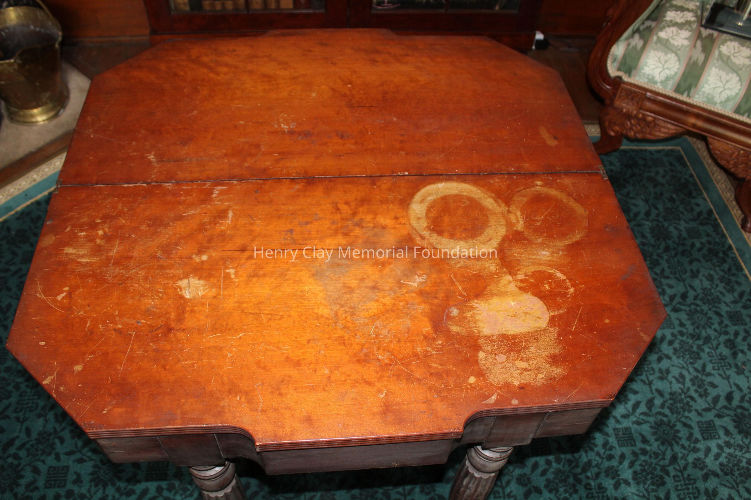 Drop leaf card table (Empire) with rectangular top. Front has block design. Legs are turned at the top, reeded in the middle, and have ball feet. There are 4 fixed legs and one gate leg that swings out to hold the top. Edge of top is ribbed.