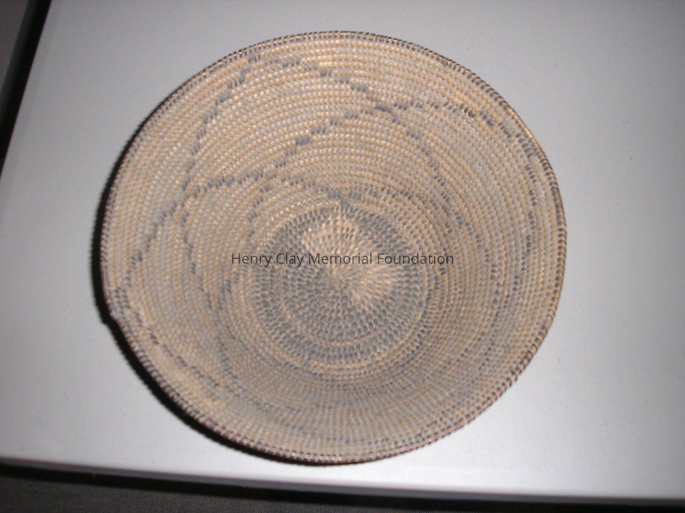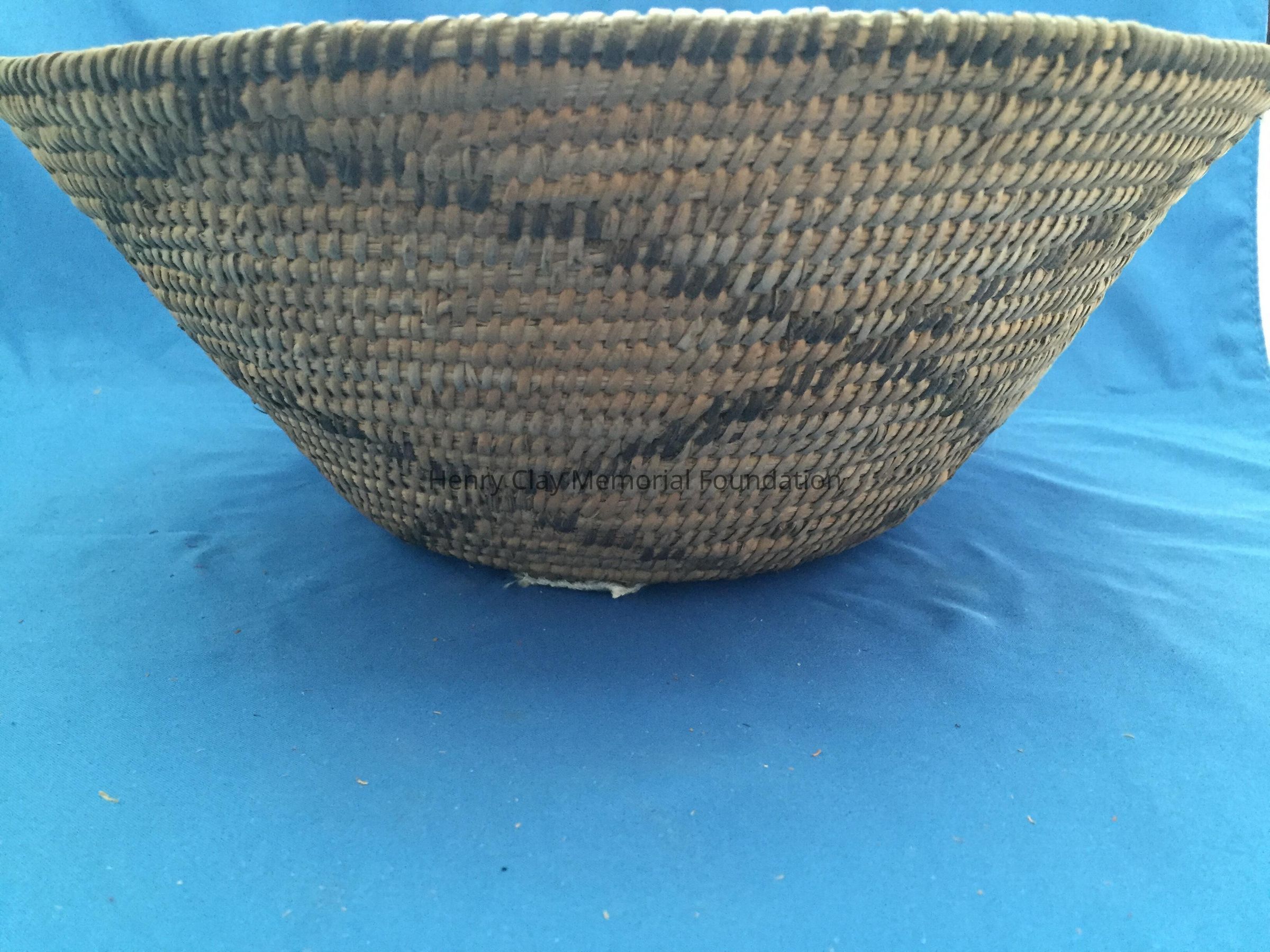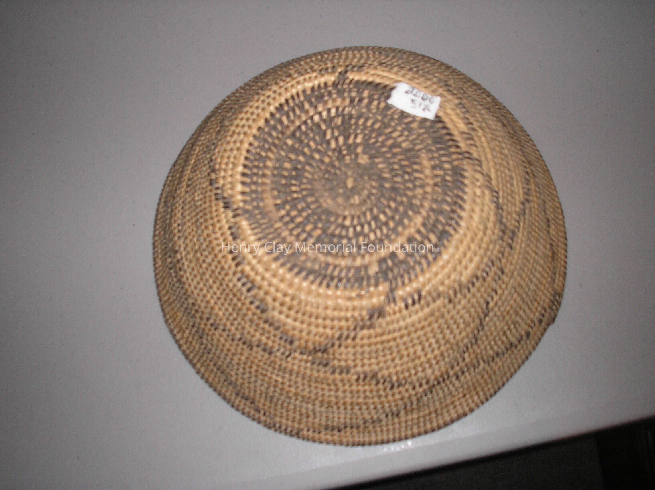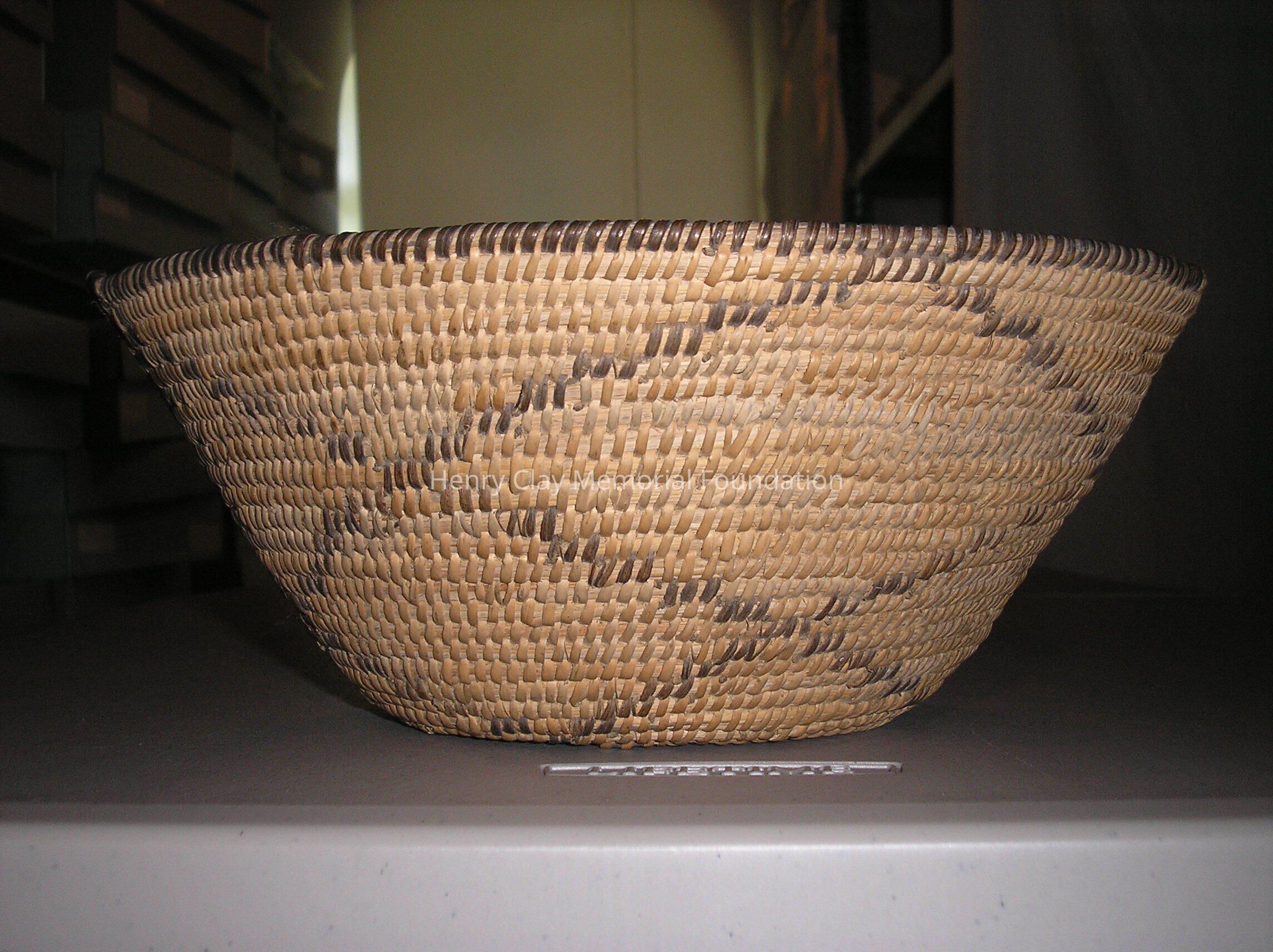 Fiber coil basket that tapers from opening to base. The basket is made of a light colored fiber with decoration in a dark fiber in a a criss cross pattern, along rim, and across base. Basket is very tightly coiled.Dimensions