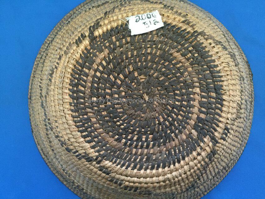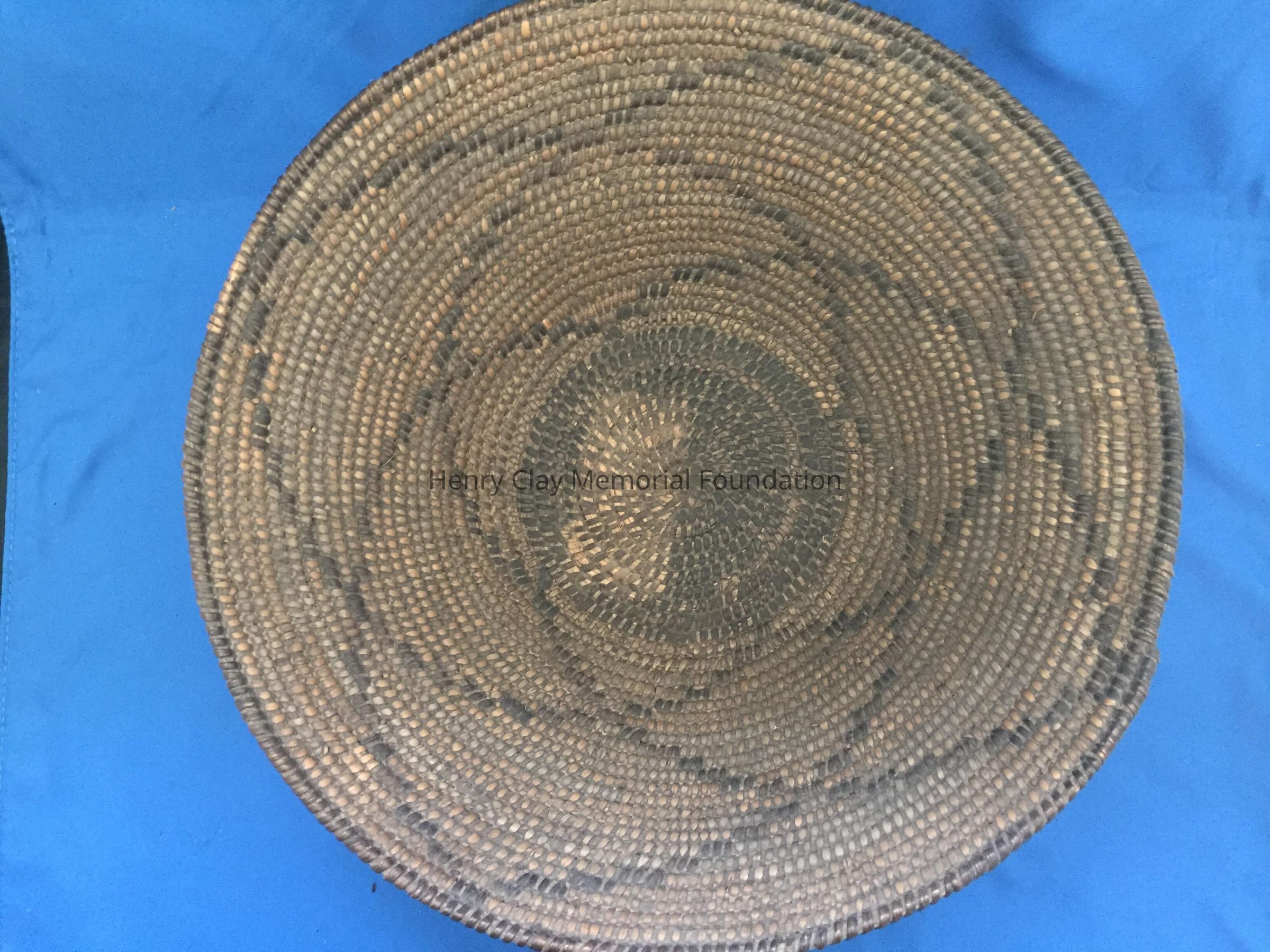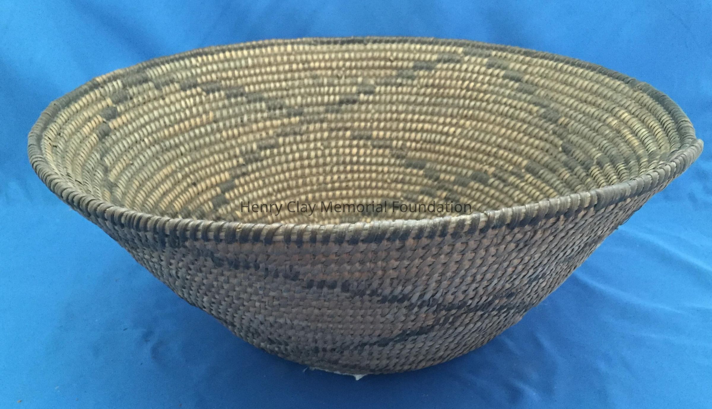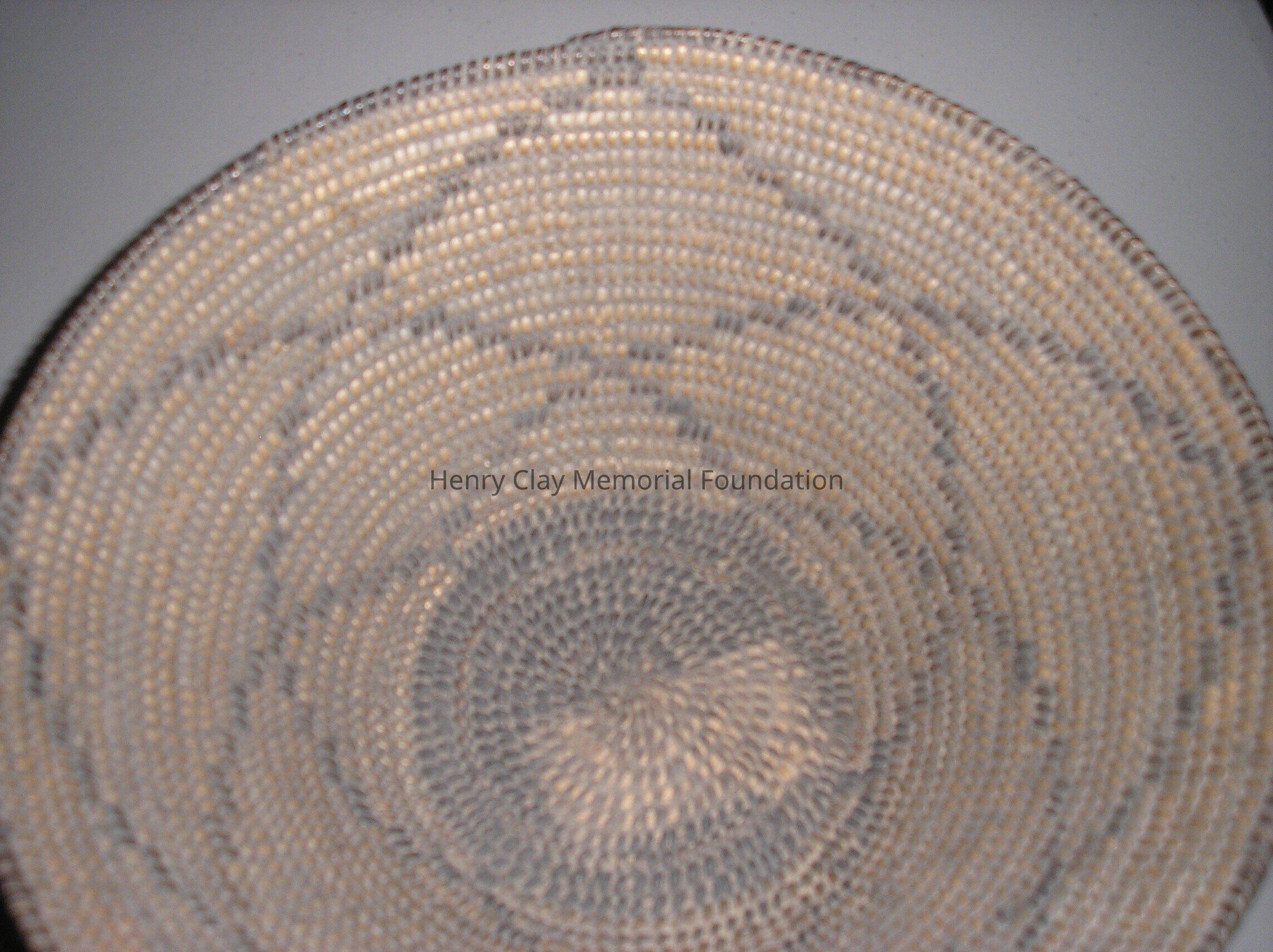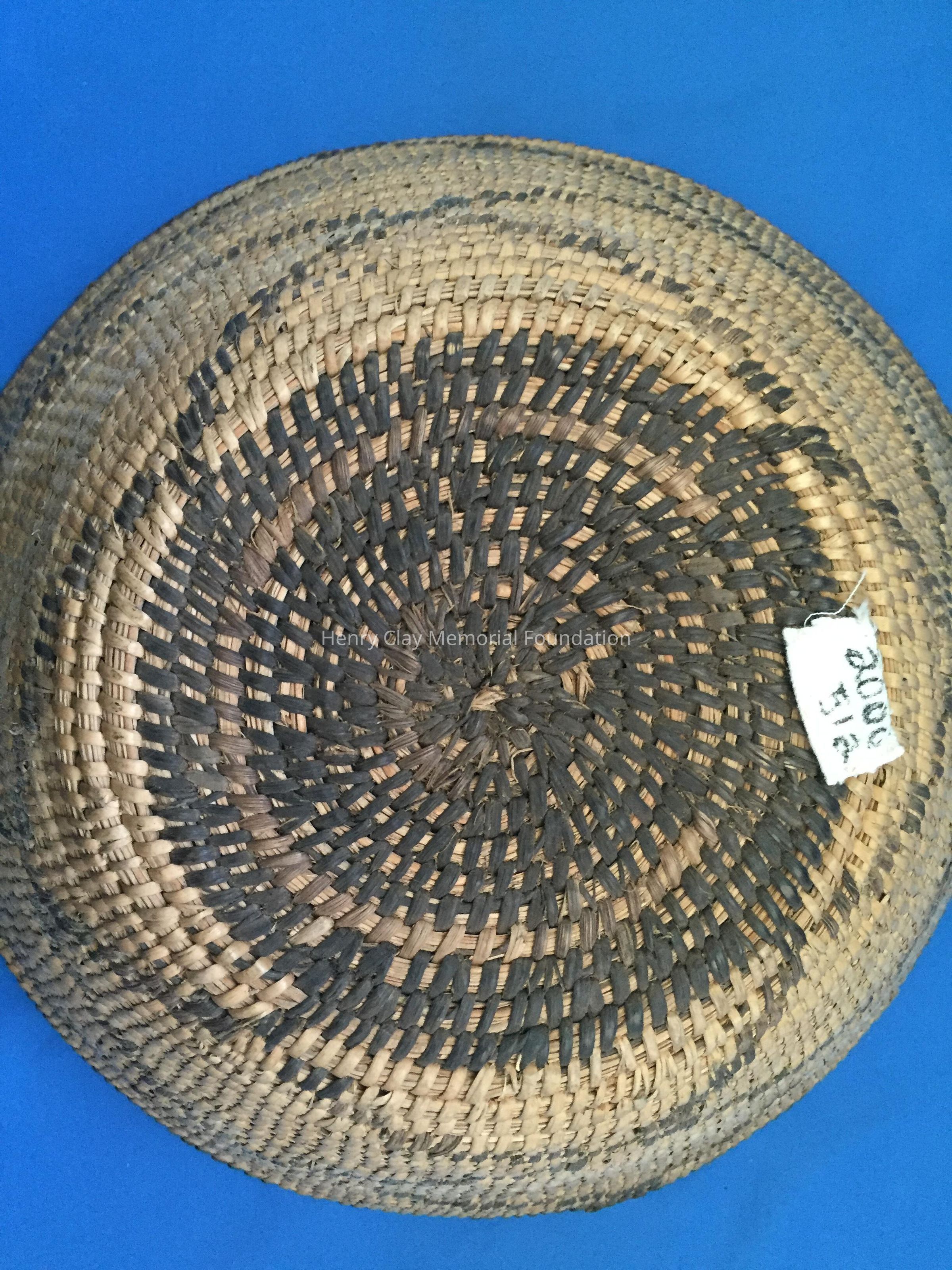 Fiber coil basket that tapers from opening to base. The basket is made of a light colored fiber with decoration in a dark fiber in a a criss cross pattern, along rim, and across base. Basket is very tightly coiled.Dimensions